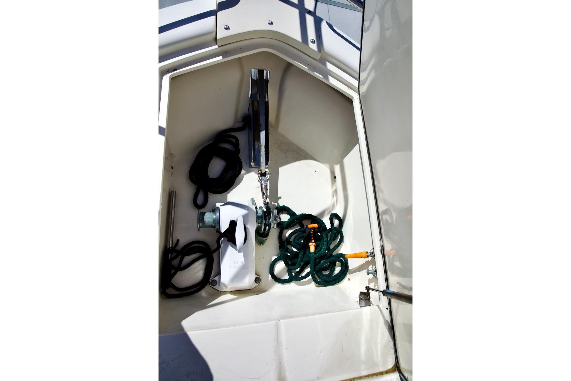 Inside, you’ll find a thoughtfully designed layout with **two spacious cabins and two heads**, ensuring comfort for family and guests. An electric windlass adds convenience for anchoring, while the expansive flybridge offers commanding views and plenty of seating for entertaining.