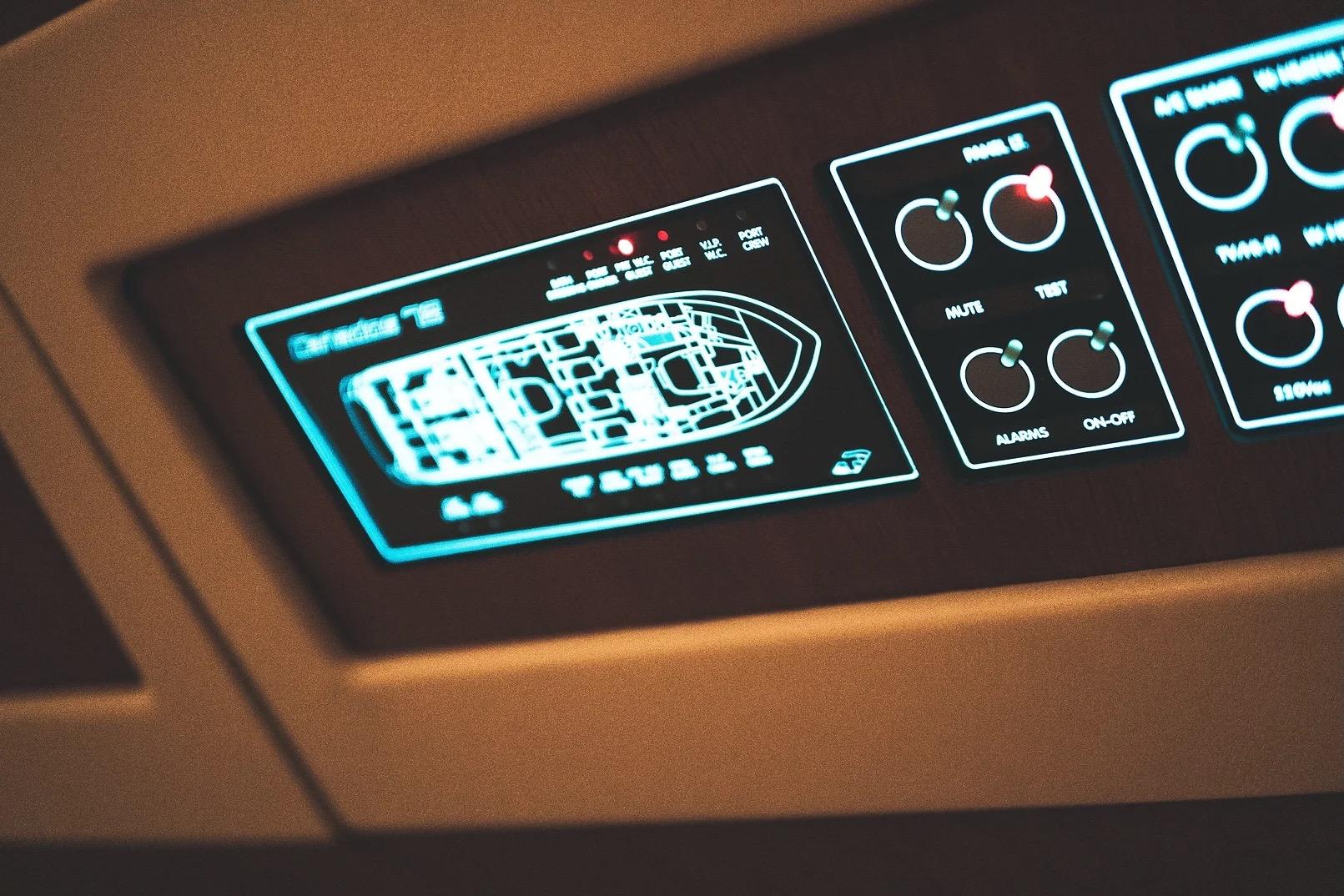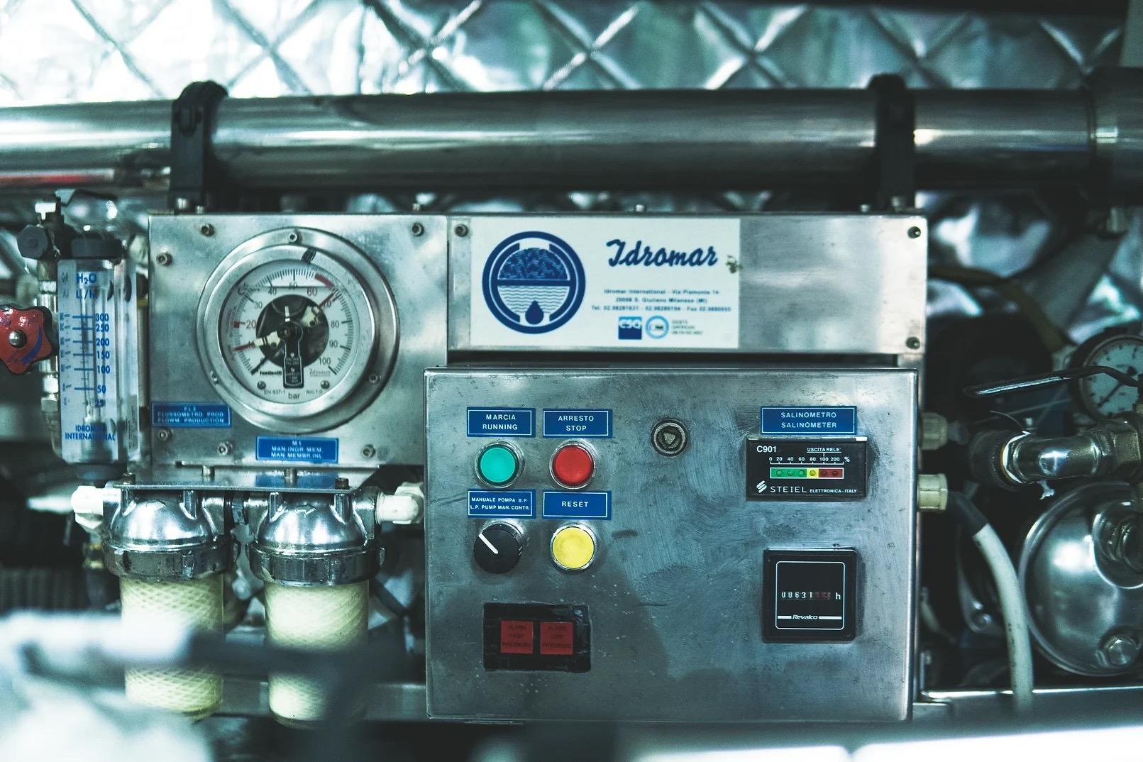 Tra le dotazioni principali figurano: bow thruster, passerella e gru idrauliche, dissalatore Idromar, 8 unità Condaria A/C, doppio generatore Kohler 16 kW, impianto TV e Wi-Fi 4G, luci subacquee e tender Williams 320 idrogetto.