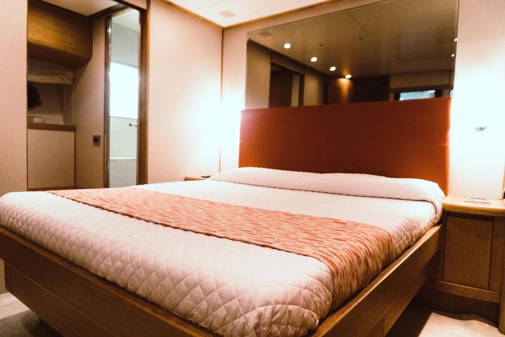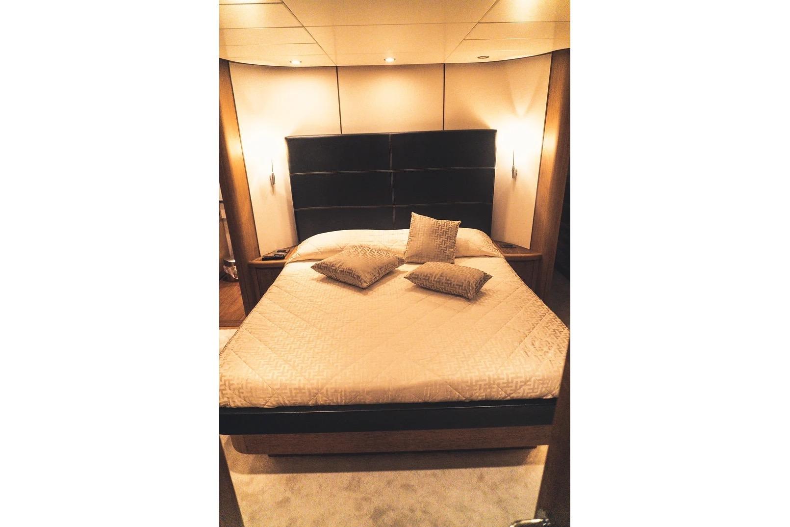 Gli interni offrono quattro cabine con bagno ensuite – armatoriale a centro barca con cabina armadio, VIP a prua e due cabine ospiti laterali con letti Pullman – per un totale di 10 ospiti, più alloggio separato per due membri di equipaggio.
