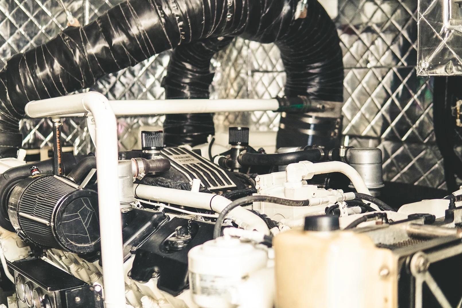 Spinta da due motori Caterpillar 3412E da 1.420 HP, la barca raggiunge 32 nodi di velocità massima e mantiene una crociera stabile a 27 nodi con consumi contenuti.