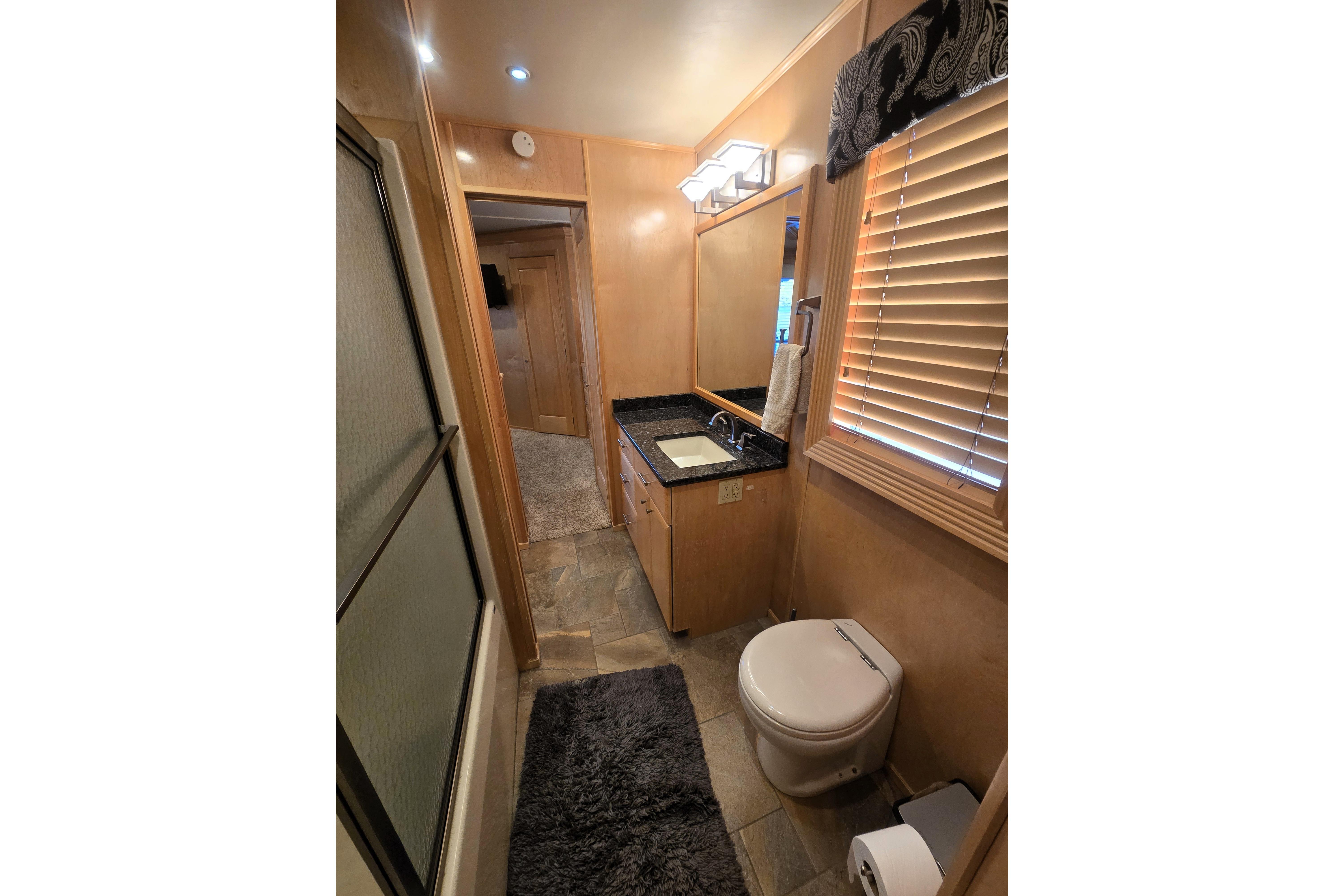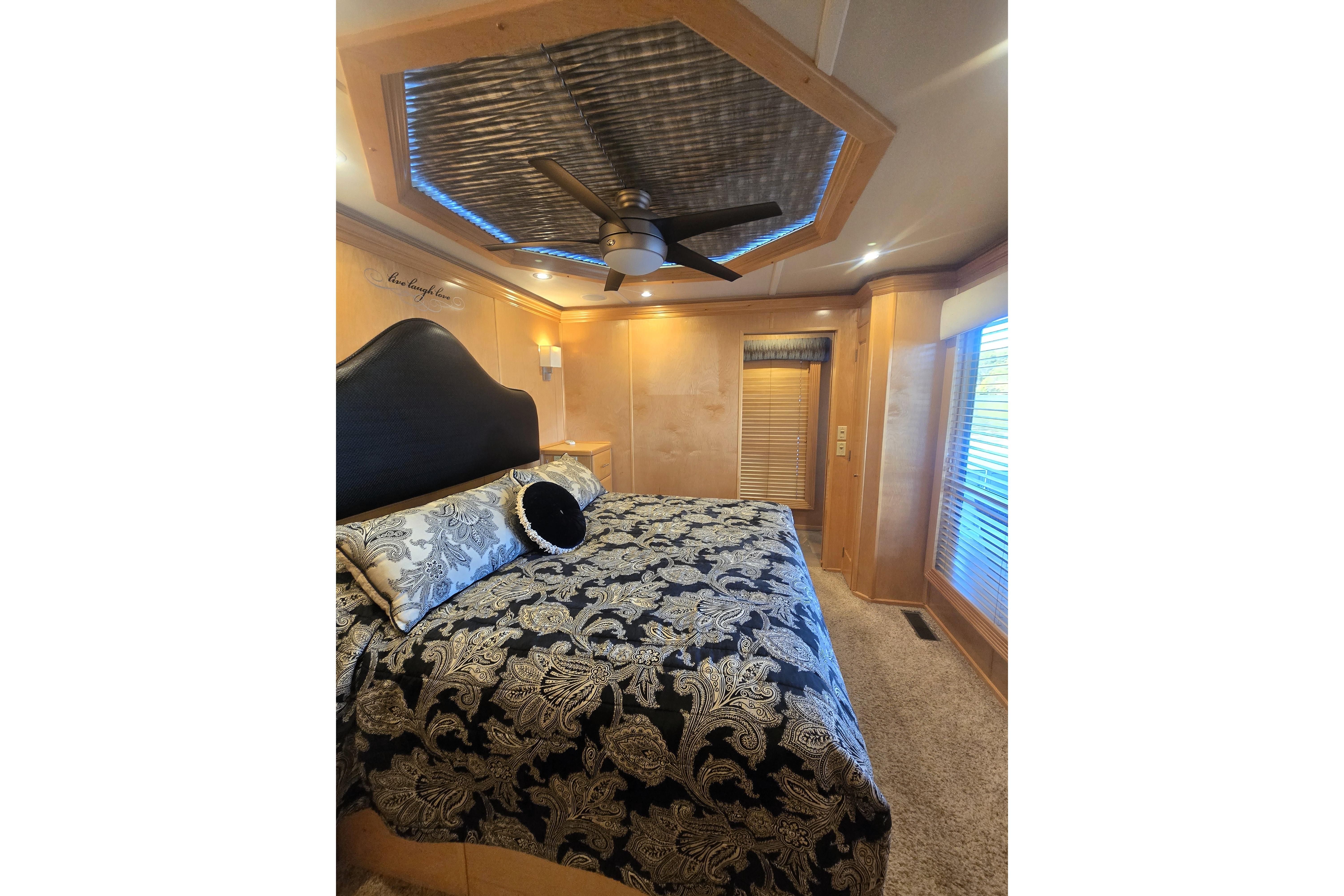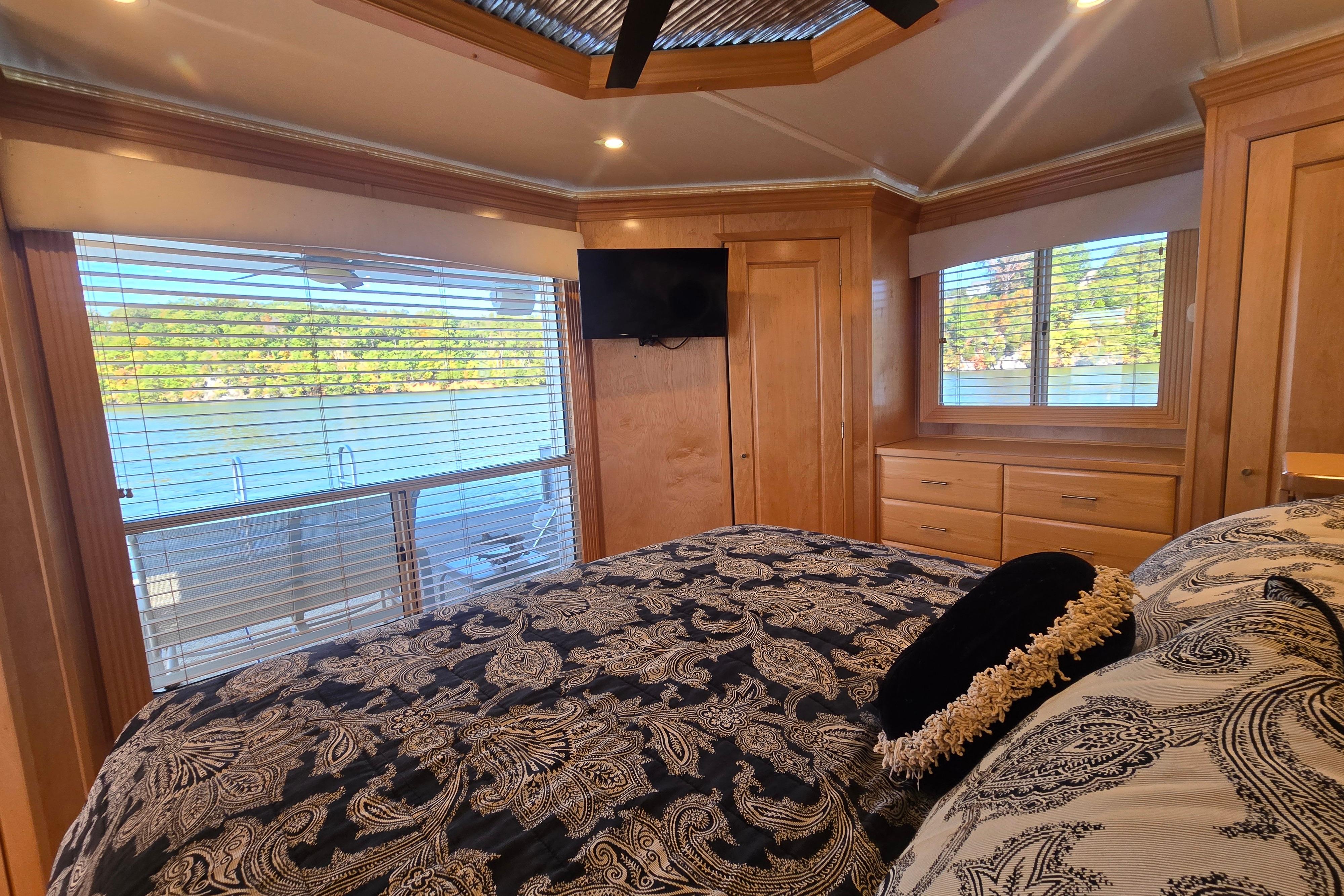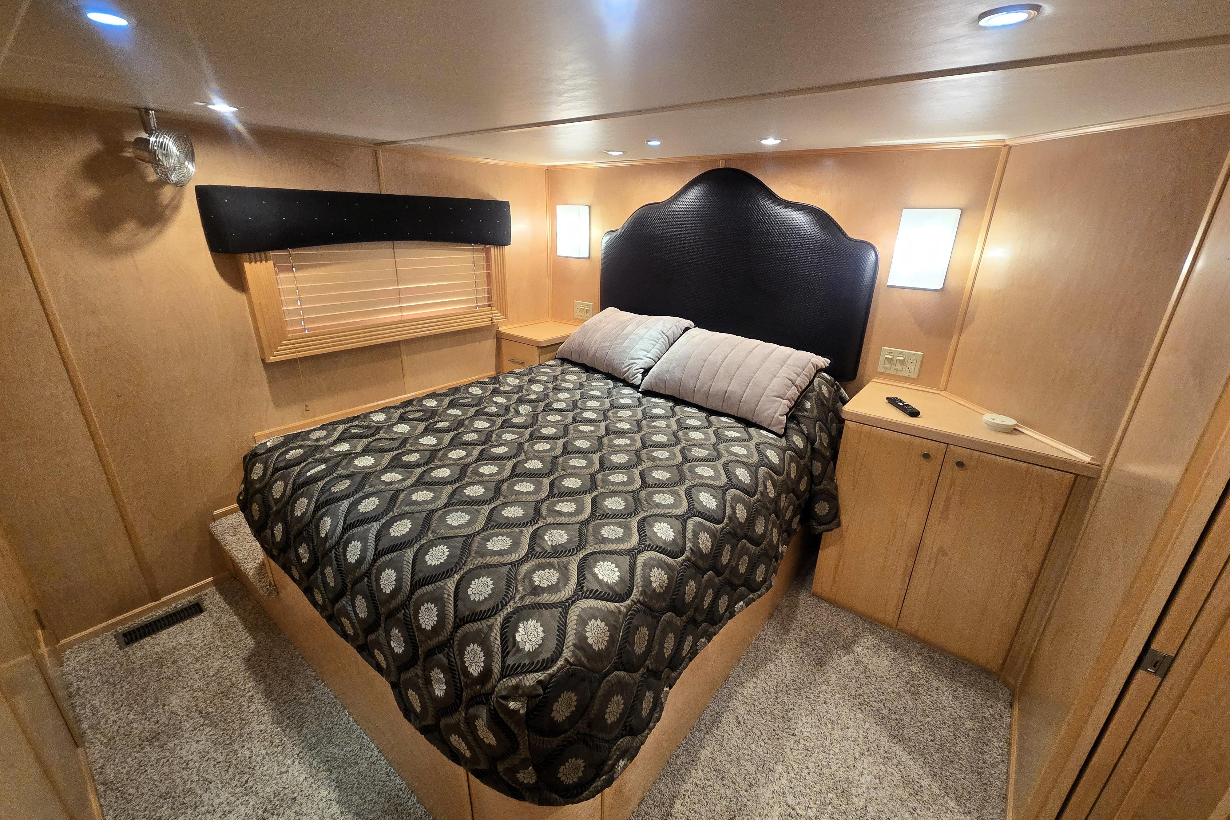 "Reel Lucky" has a 4 stateroom, 2 full head layout. The Master features an ensuite head with walk in shower and jacuzzi tub and a king size walkaround bed. An oversized window on the stern gives you a perfect place to watch the sunrise without getting out of bed to do it. The 2nd Stateroom has a queen bed and a private entry to the 2nd head. The head has a large walk-in shower and ample vanity space. The 3rd stateroom is down a short flight of steps from the salon and has a full-size bed and ample storage. The 4th stateroom is down steps coming from the main passageway. It is currently set up as a storage room.