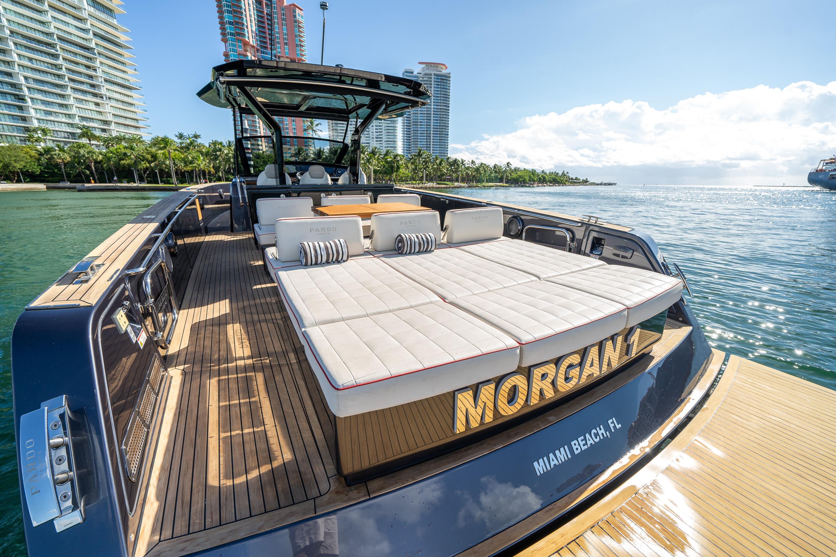 Step aboard this 2023 Pardo 43 MORGAN 1, an immaculate example of Italian craftsmanship and contemporary design. Combining performance, luxury, and style, this yacht delivers an unmatched day boating and weekend cruising experience- perfect for the waters of Miami and the Bahamas. The Pardo 43 is renowned for its walkaround design, and socially oriented deck layout. The large aft sunpad, open cockpit with dining area, and seamless flow to the swim platform creates an effortless connection from bow to stern.