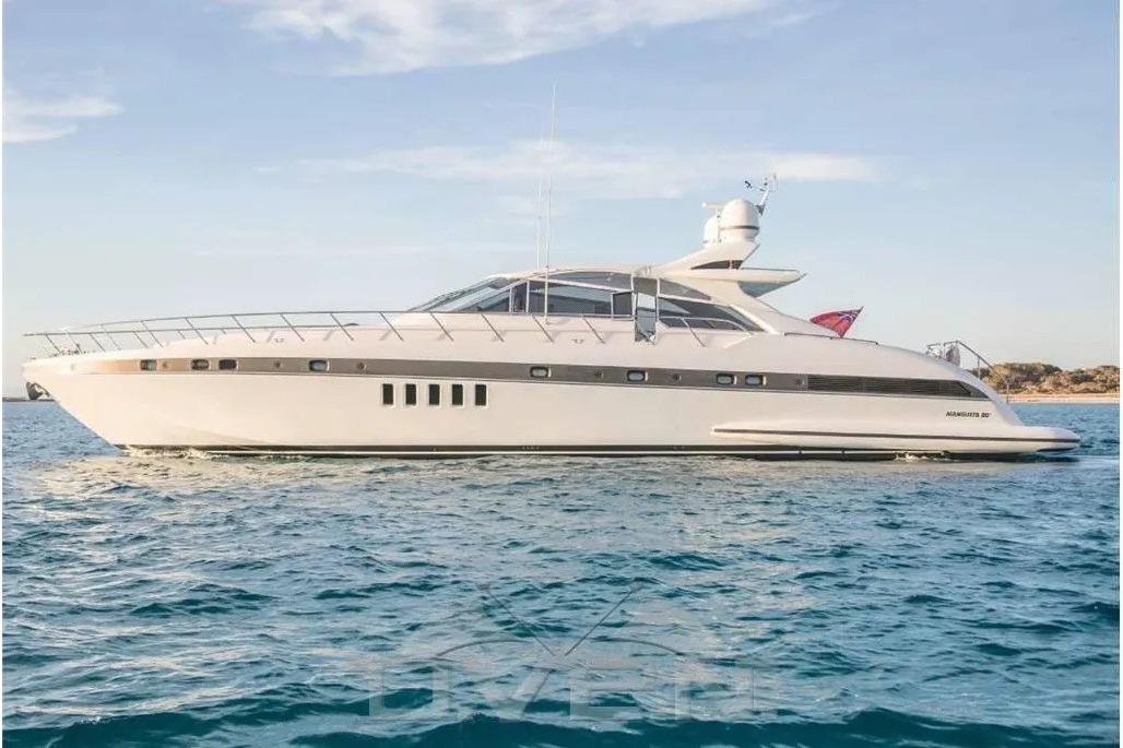 The 2005 Mangusta 80 is a 23.98-meter open luxury yacht known for its speed and performance, powered by twin 2,000hp MTU diesel engines that allow for a cruising speed of around 37-40 knots and a top speed of 43-46 knots. It features a sporty, sleek design with a GRP hull and a planing hull for efficiency, a full-beam salon with Italian design, and large sunbathing areas on the bow and stern. The interior typically includes three cabins for up to six guests and is designed for comfort, while the exterior offers a tender garage and a large swim platform.