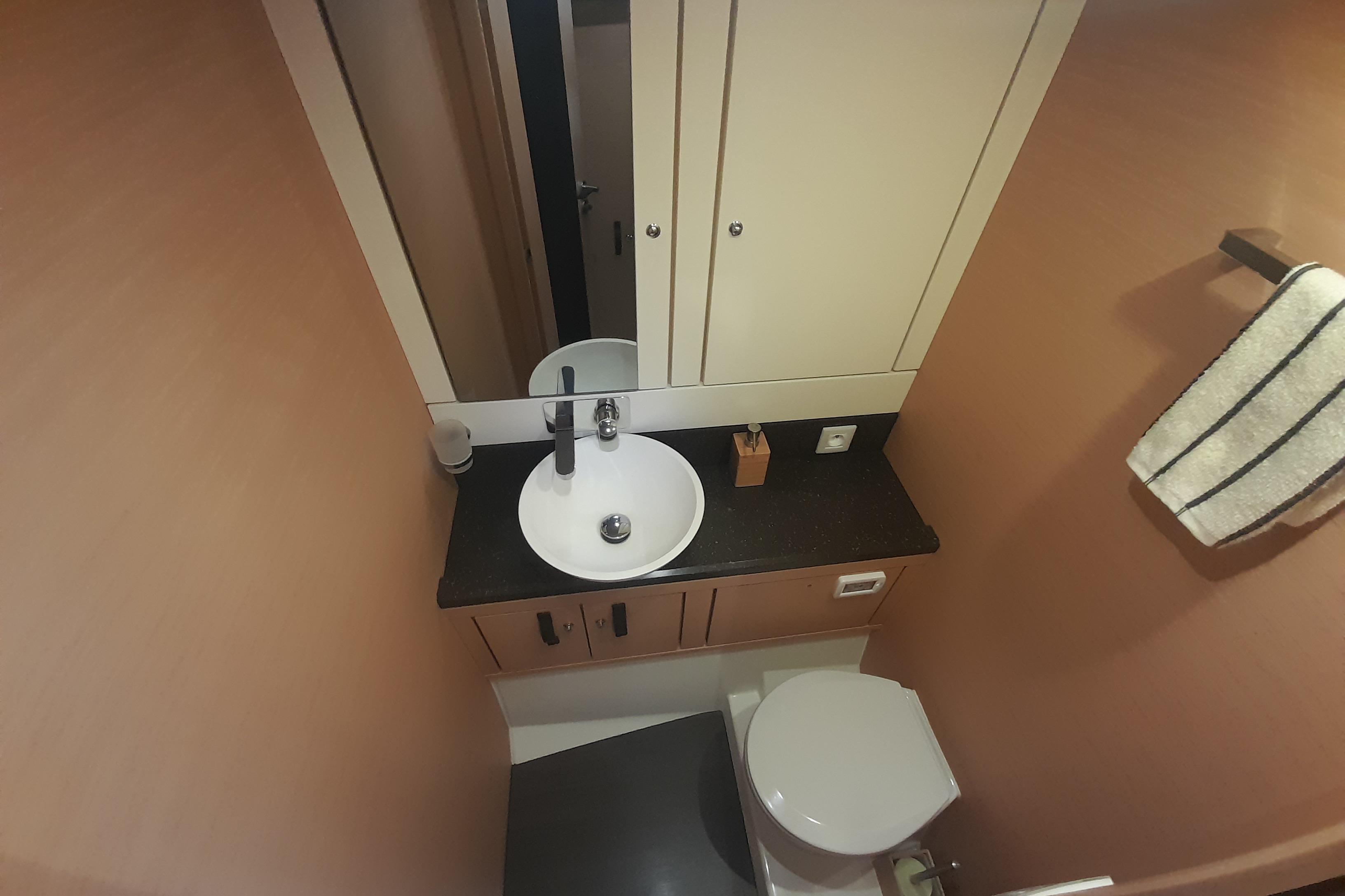 - 2 cabinas proa simétricas: camas dobles + aseo privado (inodoro eléctrico, lavamanos, ducha separada)
