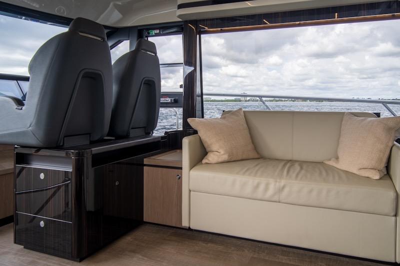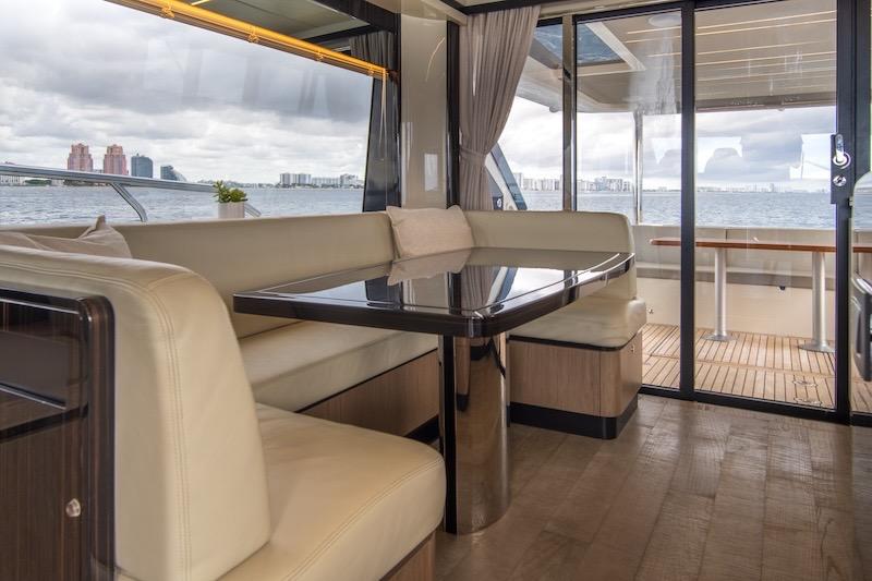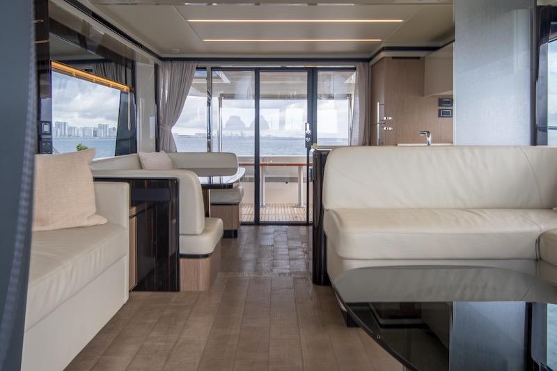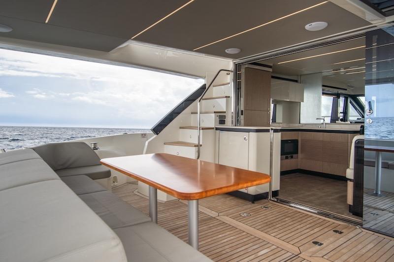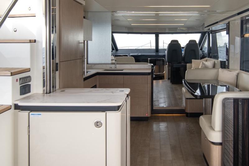 Aboard the Absolute 62 FLY, every room gives you an exclusive experience, maximizing entertainment, and functionality. The spacious, versatile aft cockpit features a cozy sun lounger area, walkways to easily access the aft platform, the fly, the bow, and the beautiful main deck. Here, the layout and interior decor offer you and your guests an absolute level of comfort. Combinations and contrasts, in pure Italian style, enhance the elegance of the space with essence, leathers, and fabrics worthy of the best artisan tradition. Moreover, the galley, the table, and the outdoor area can be lived as a single large space for dining, thanks to a retractable glass screen and a sliding access door.