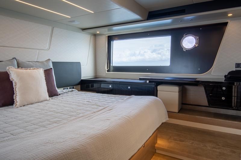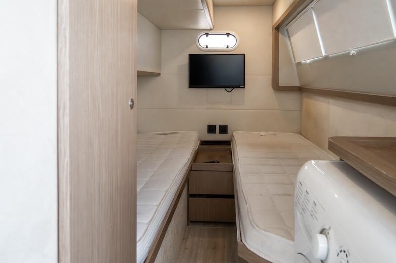 Below deck, there is plenty of space to experience your yacht to the fullest and comfortably accommodate eight guests. The master cabin is full-beam and takes full advantage of the hull’s beam (17 feet). It has a large double bed, spacious bedside tables, a two-seater sofa, and a roomy vanity area. The en-suite head is large and has a voluminous shower box. The VIP cabin is positioned diagonally: an ideal solution that ensures large surfaces—furnished with elegance and equipped with high-level en-suite services. Furthermore, the sleeping area has a twin cabin with separate berths that, through an electric control, can turn into a third double bed. The last cabin is aft and with similar living standards, perfect for an extra couple of guests or the crew.