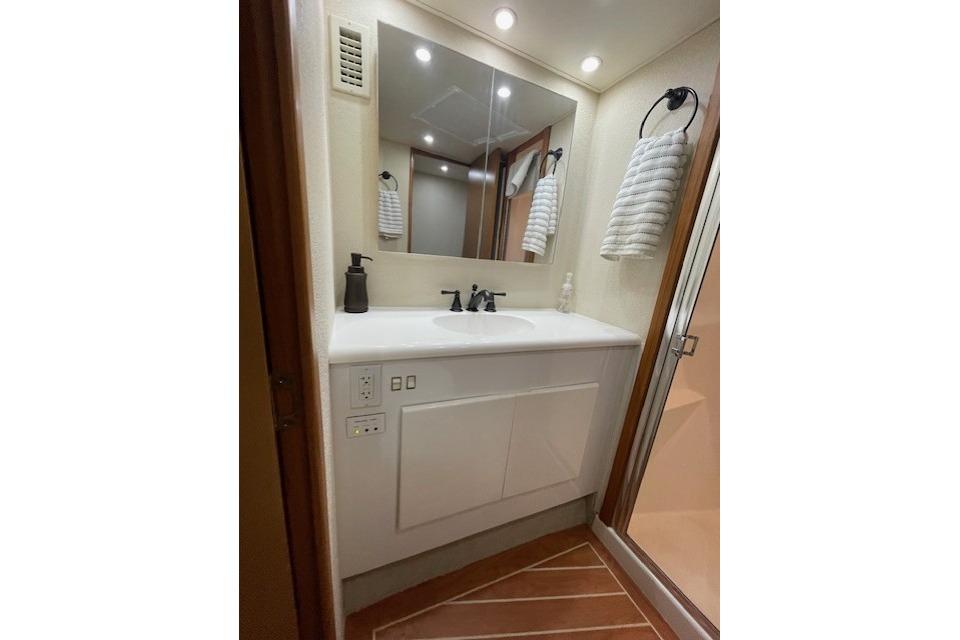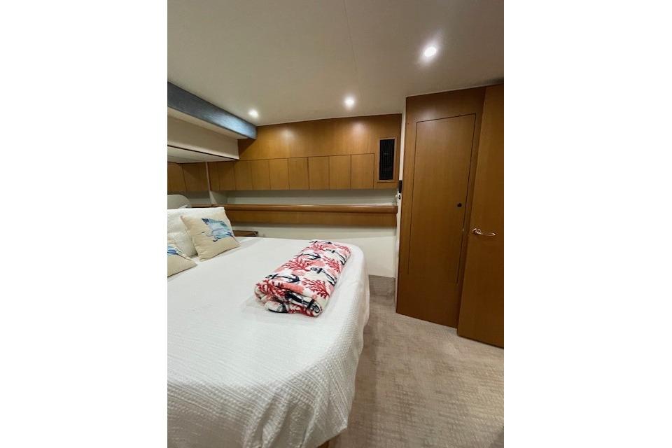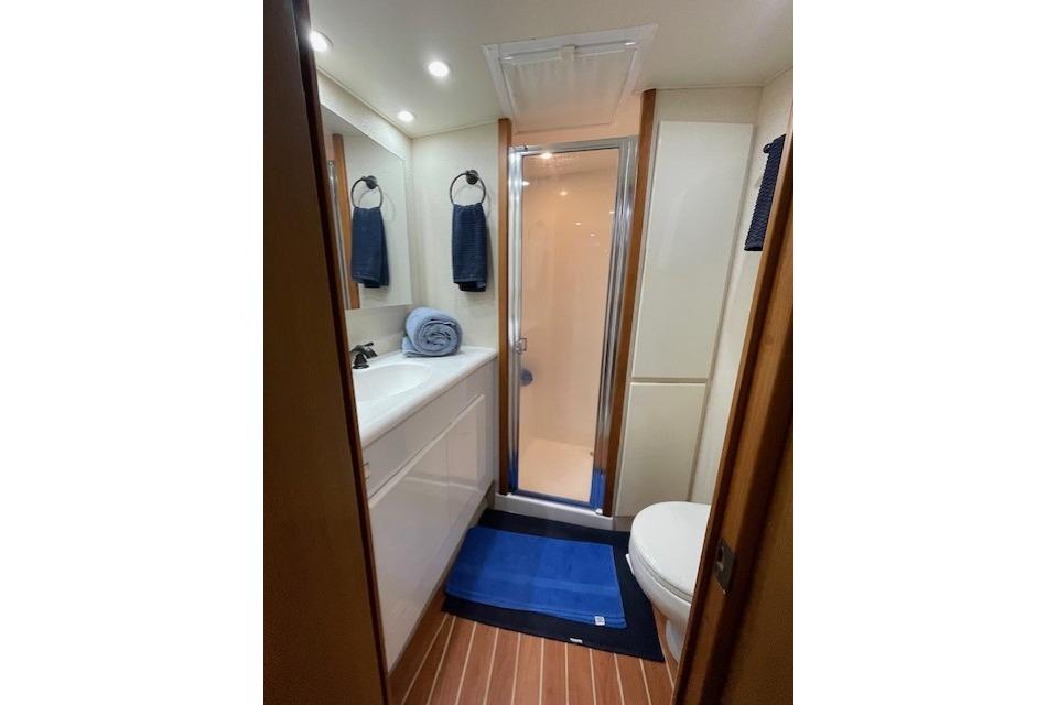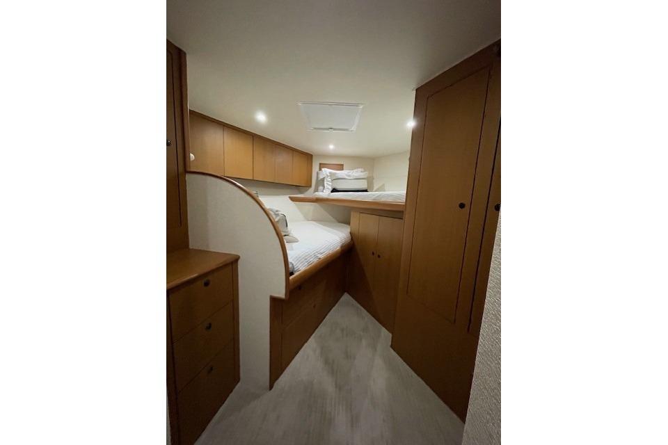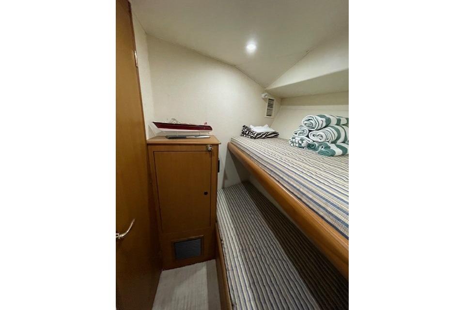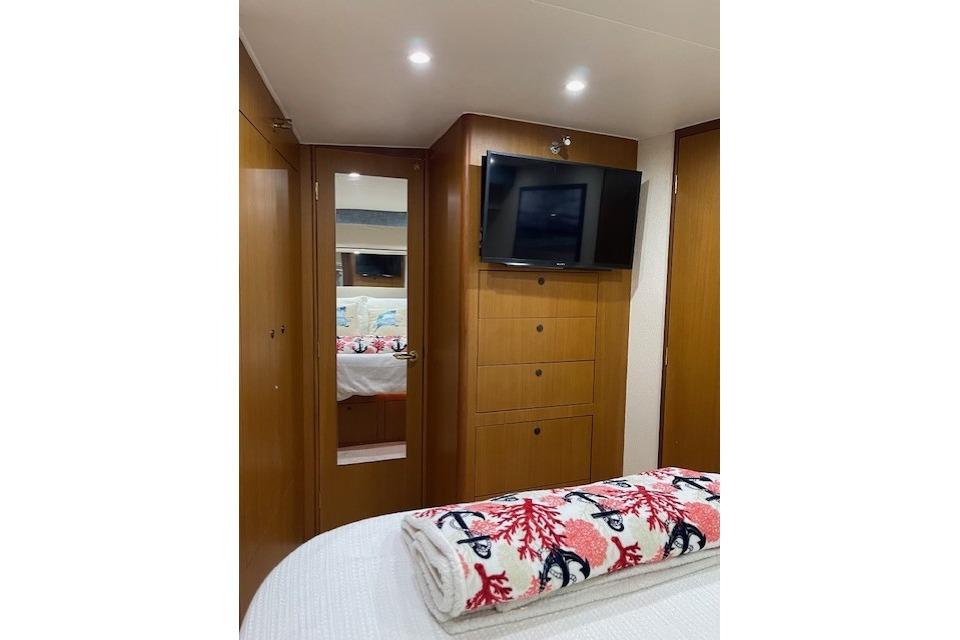 Walking forward in the companionway on the lower deck to port is the Master ensuite stateroom with a walkaround queen bed with Handcraft System 5 mattress, ample drawer, locker and large cedar lined hanging closet storage, 24" Flat Screen TV, a private ensuite head with shower, vanity with sink and a teak and holly sole. Highlights: Air Conditioning digital controls, 24" Flat Screen TV, Stereo w/ speakers, mirror, carpeting, reading lights, under queen bed hinged storage, upholstered headboard To starboard is one guest cabin with over and under berths, drawers and a cedar lined hanging closet. Highlights: Digital air conditioning controls, reading lights, carpeting Forward is another guest cabin with twin sized lower berth to port and a single upper berth to starboard with ample drawer, locker storage and large cedar lined hanging closet. An adjoining, semi-private full head has a vanity with sink, shower and a teak and holly sole also serves as the day head with another door from the companionway. Highlights: Digital air conditioning controls, carpeting, reading lights, private door to full service adjoining head w/ shower and vanity sink, overhead hatch w/ screen and blackout shade