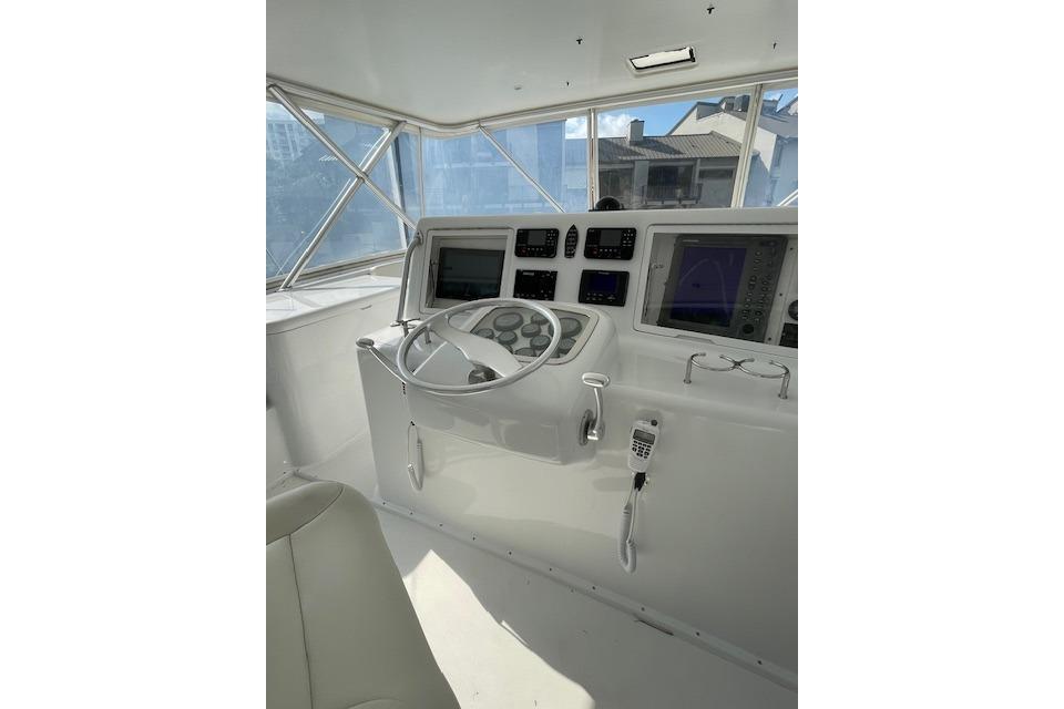The flybridge is spacious and comfortable featuring a Post custom fiberglass hardtop with polished aluminum frame and full EZ2CY clear enclosure. The massive helm console provides all the space needed for easy access to an excellent array of flush mounted electronics and navigation equipment protected from the elements by clear acrylic covers on stainless steel piano hinges. The impressive console features a pedestal captain's station with Glendinning Palm Beach single lever controls with trolling valves and all instrument and MAN engine gauges. There are (2) Pompanette Platinum series helm chairs with multipoint seating adjustment and support providing optimal comfort underway. There is an L-shaped bench seating forward of the console situated to starboard with another bench seat to port (with built-in 20 gallon ice box just aft). Ample seating for all guests that's comfortable with seat and backrest cushions in excellent condition.