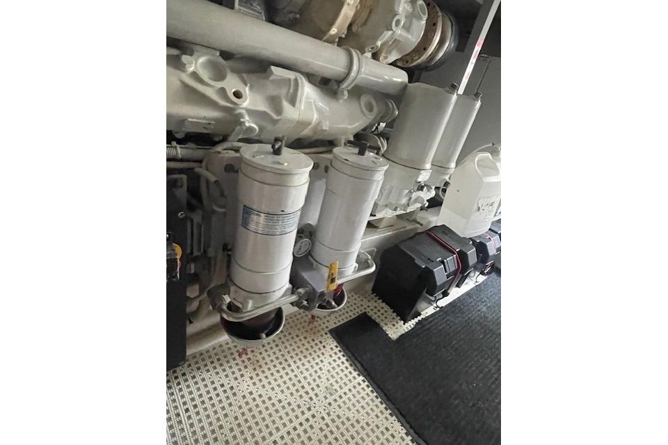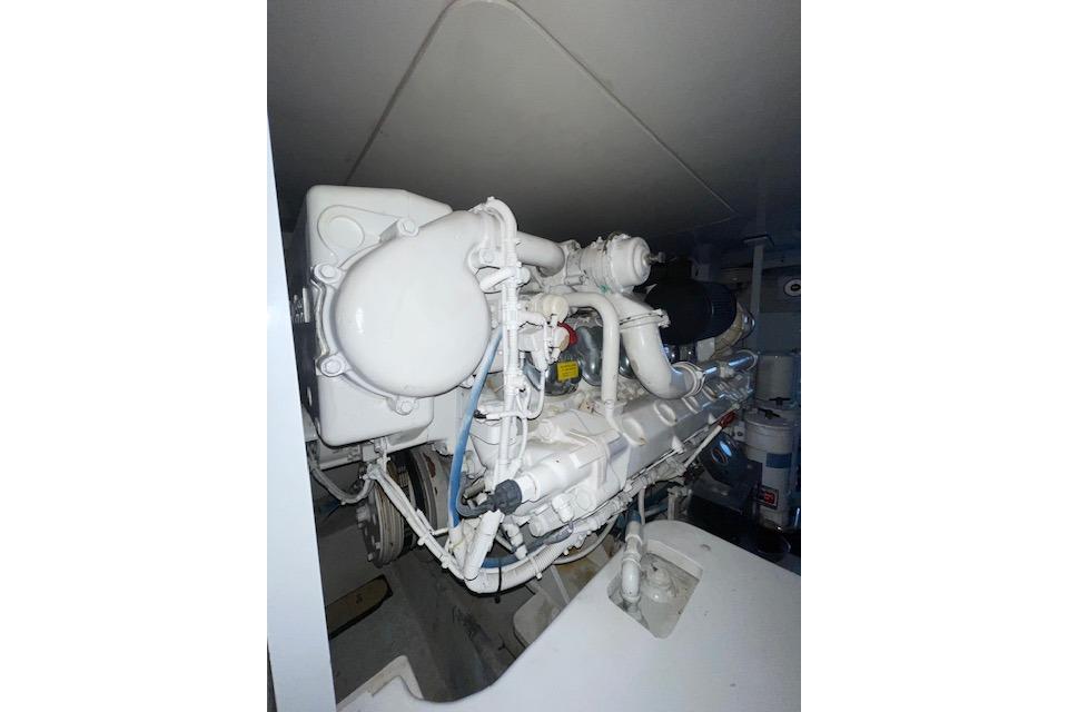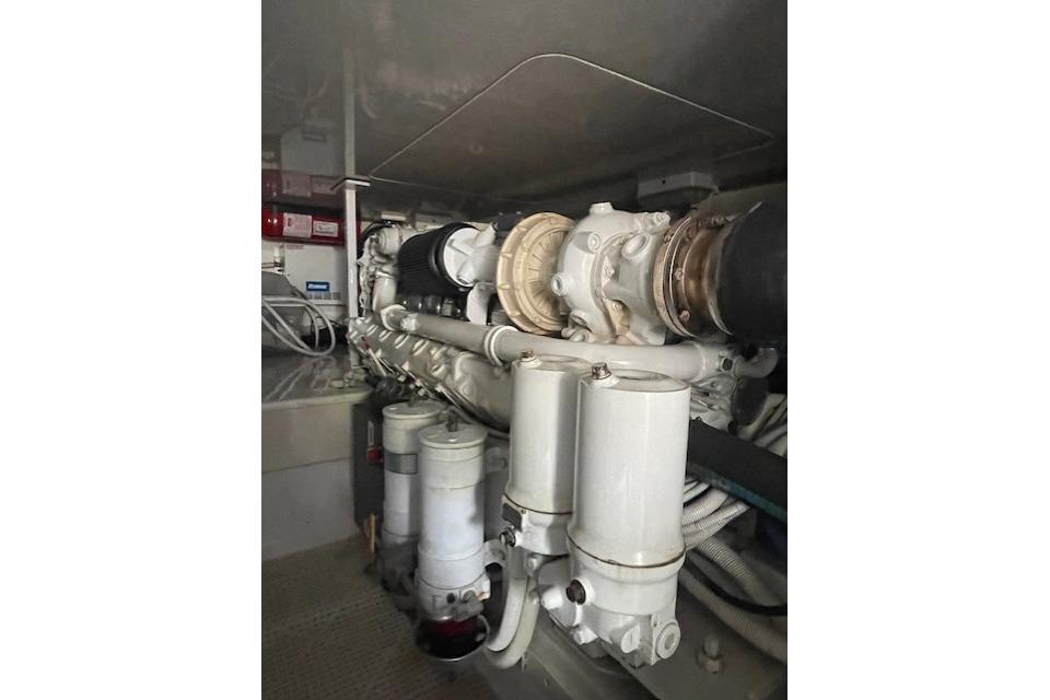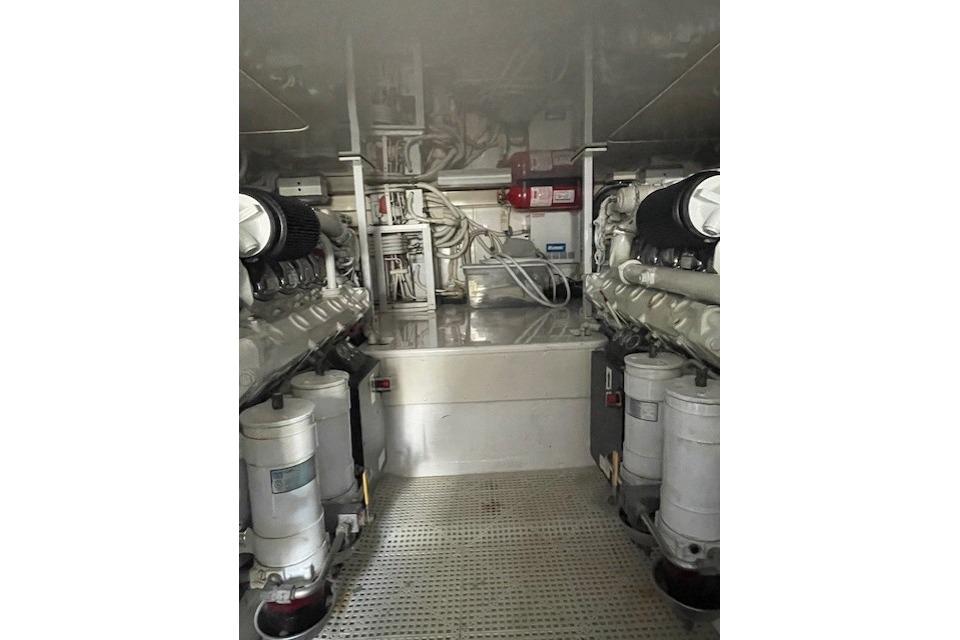 Access to the engine room is from the cockpit. The engine room is Awlgrip painted white, clean dry and orderly with aluminum Diamond Plate removable hatches, Dri-Deck flooring tiles and acoustical and thermal insulation. There is 110v fluorescent and 24v lighting overhead.