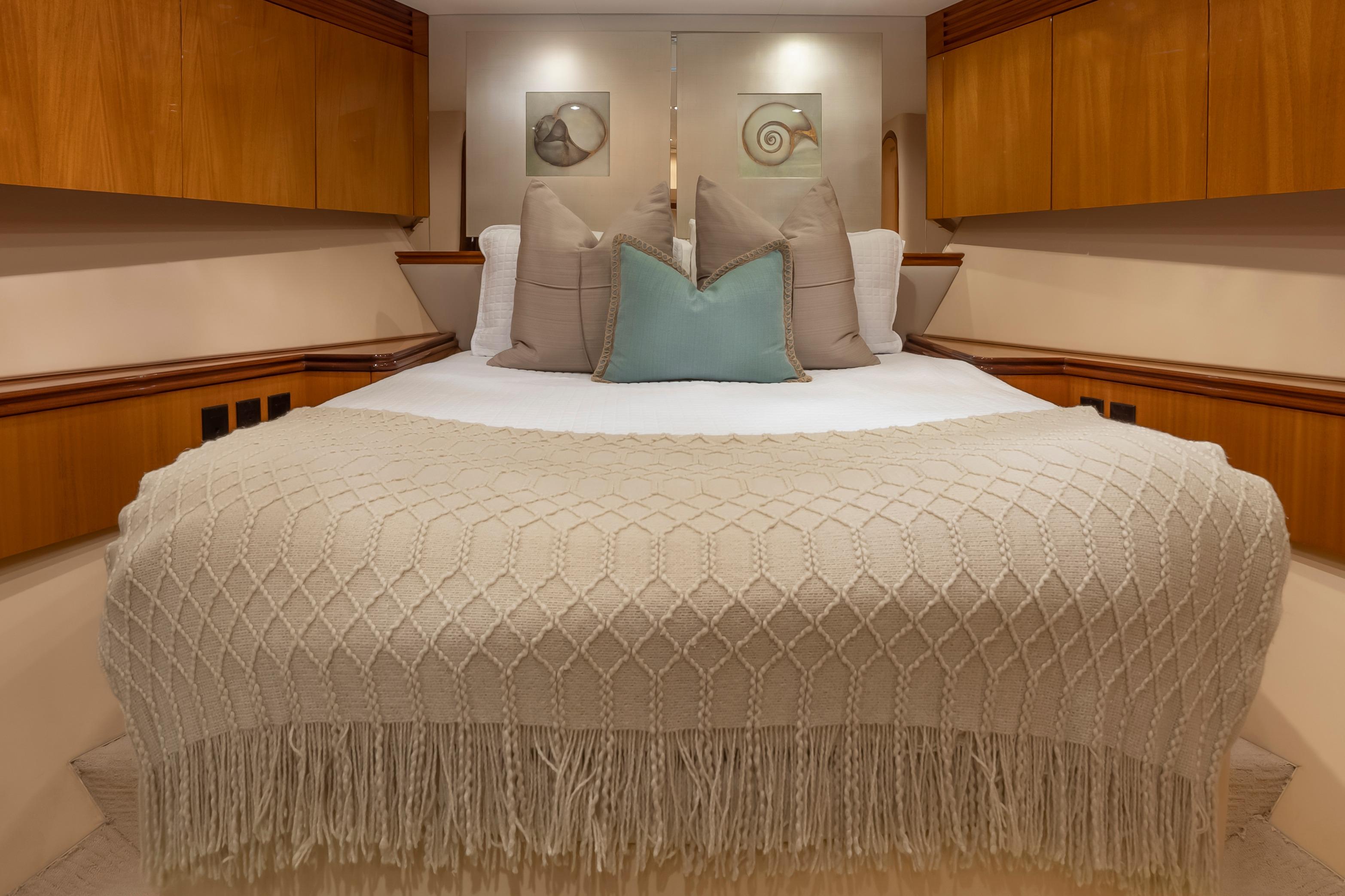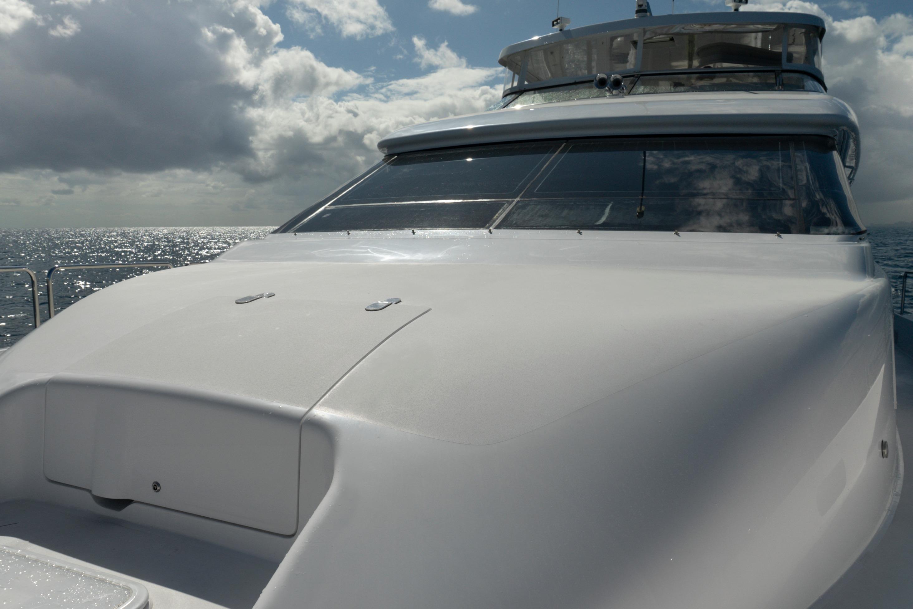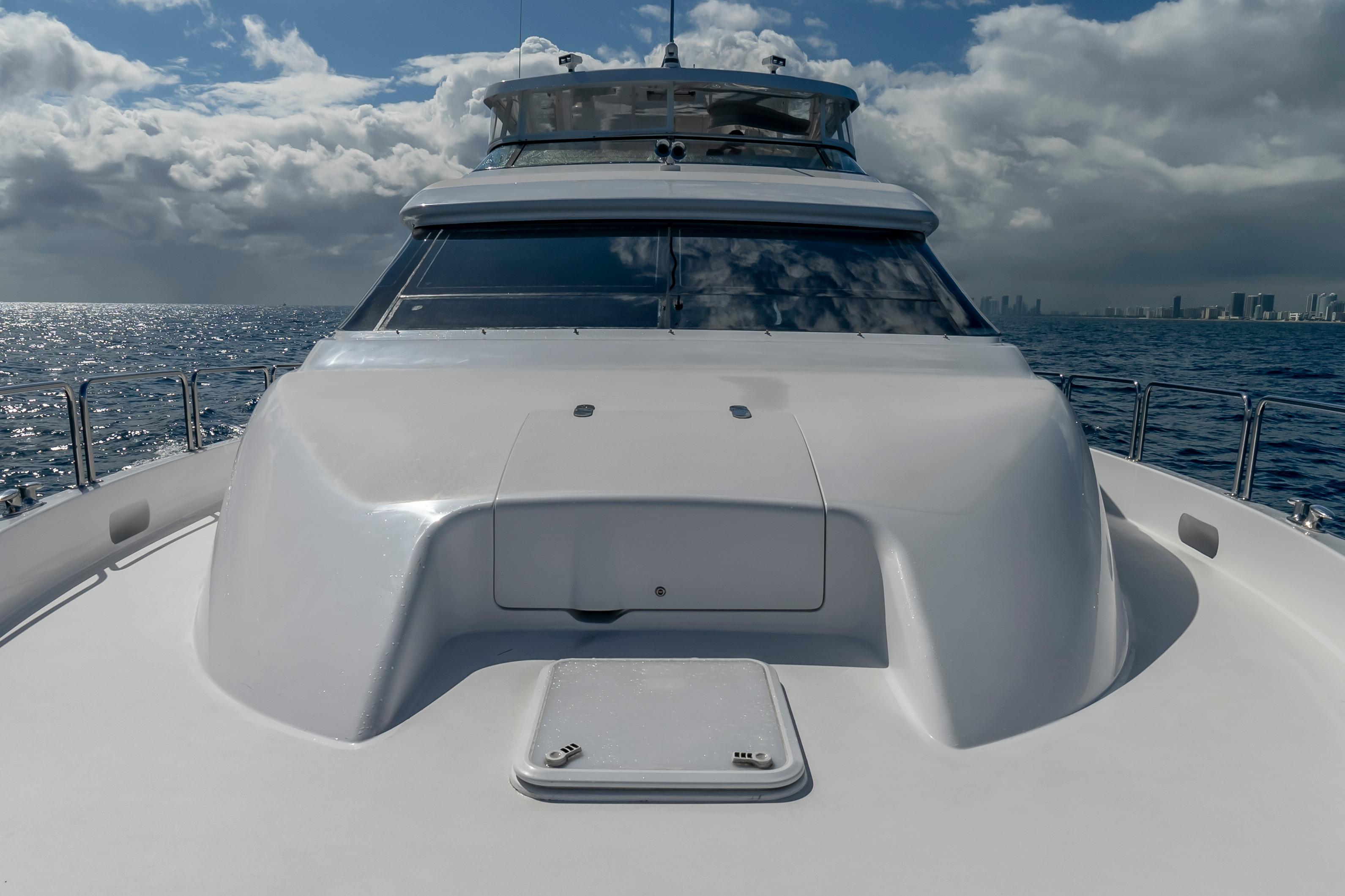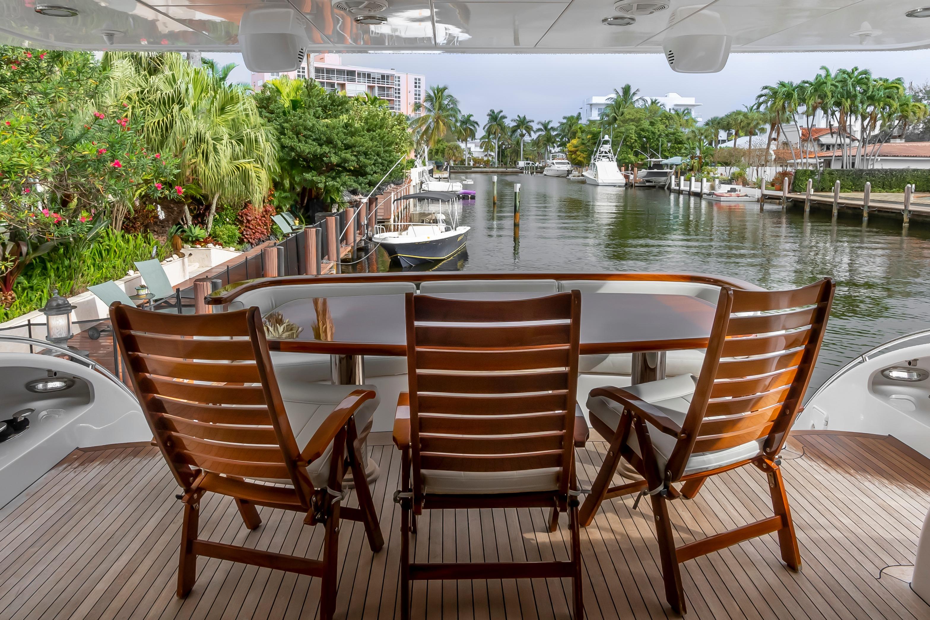 Her spacious flybridge offers panoramic views, a custom hardtop, wet bar, grill, and plush seating — the ideal setting for sunset cocktails or al fresco dining under the stars. Aft, a generous teak swim platform and lounge deck welcome effortless access to the sea, tender, or water toys.