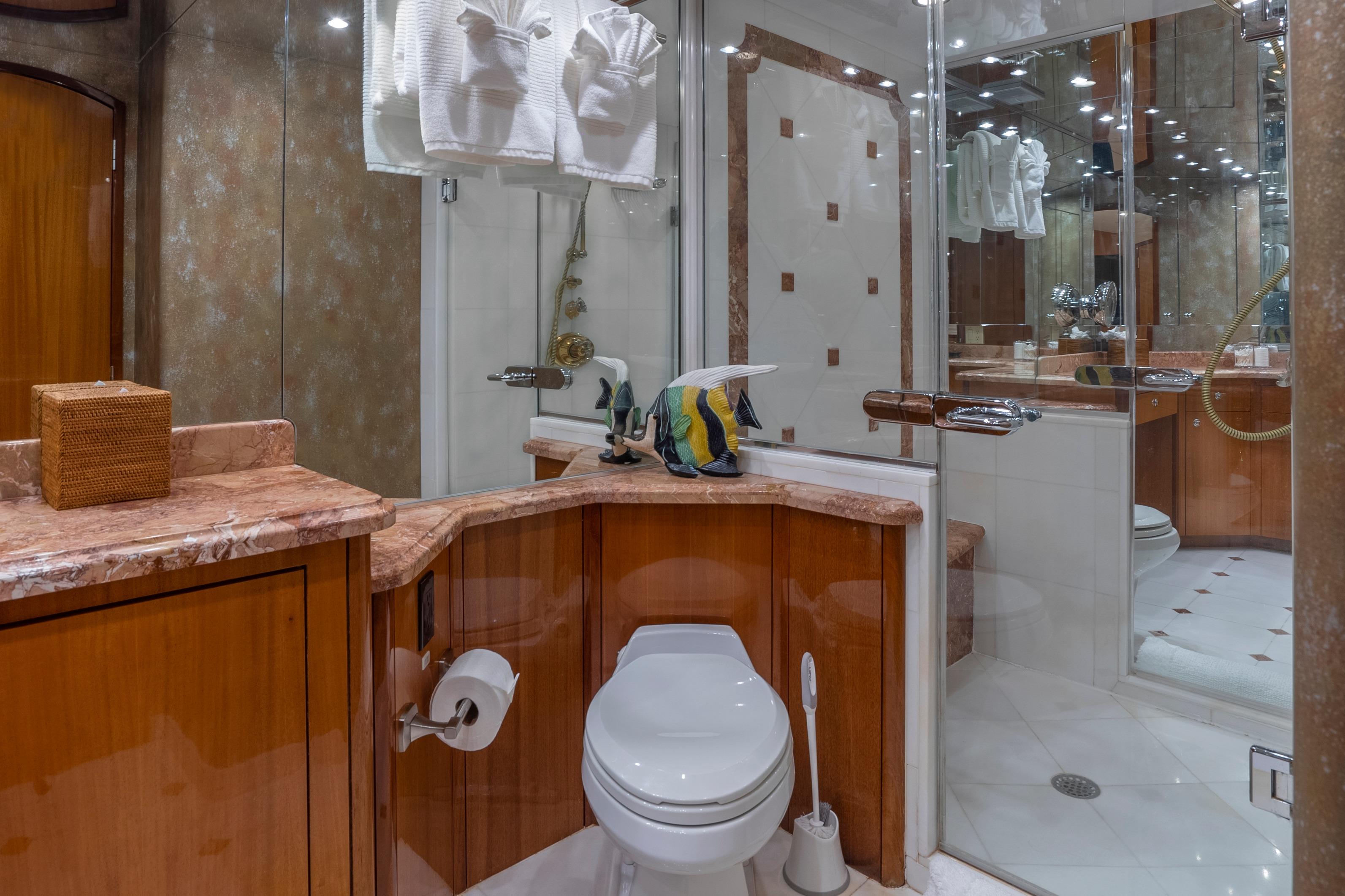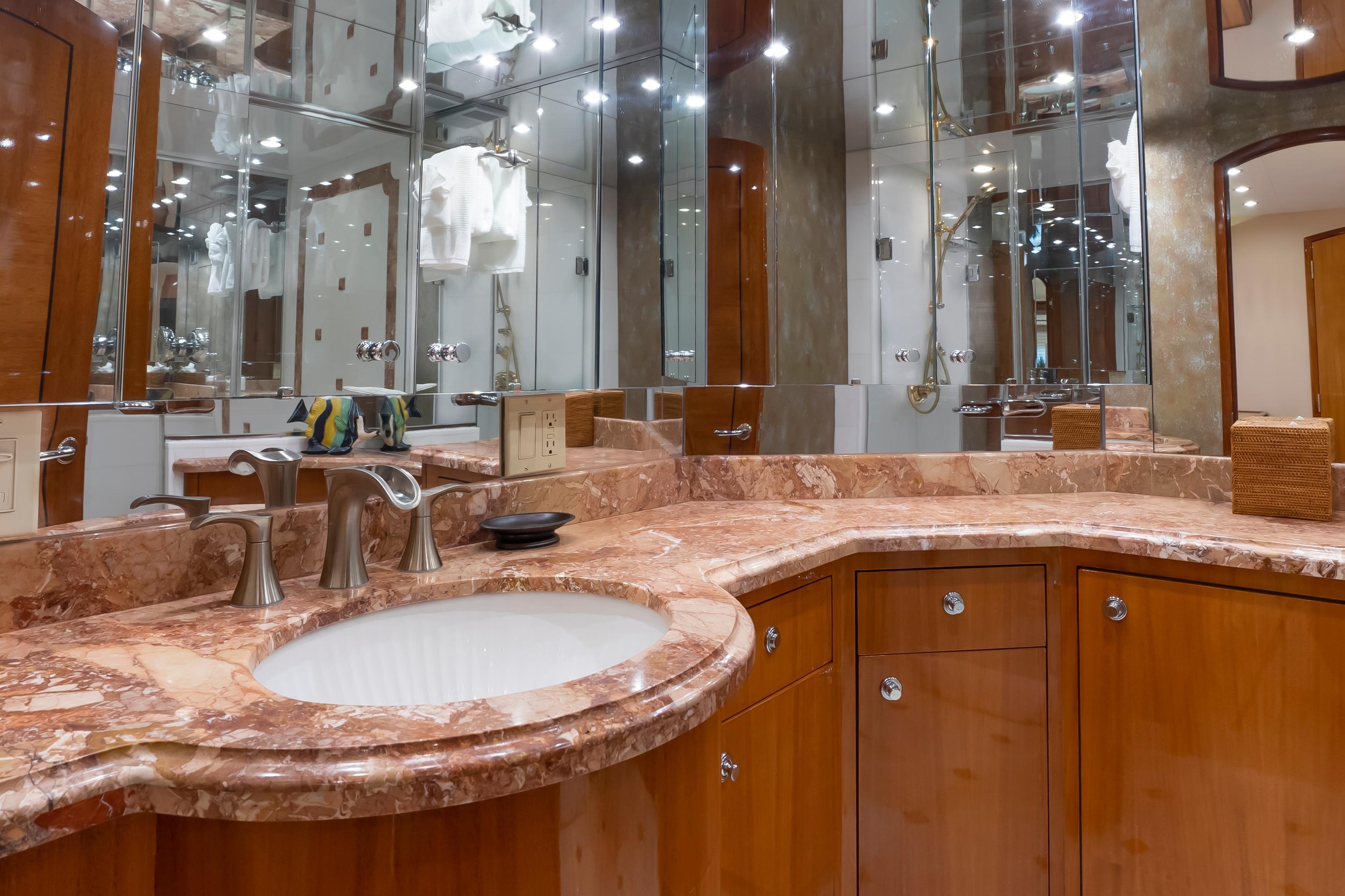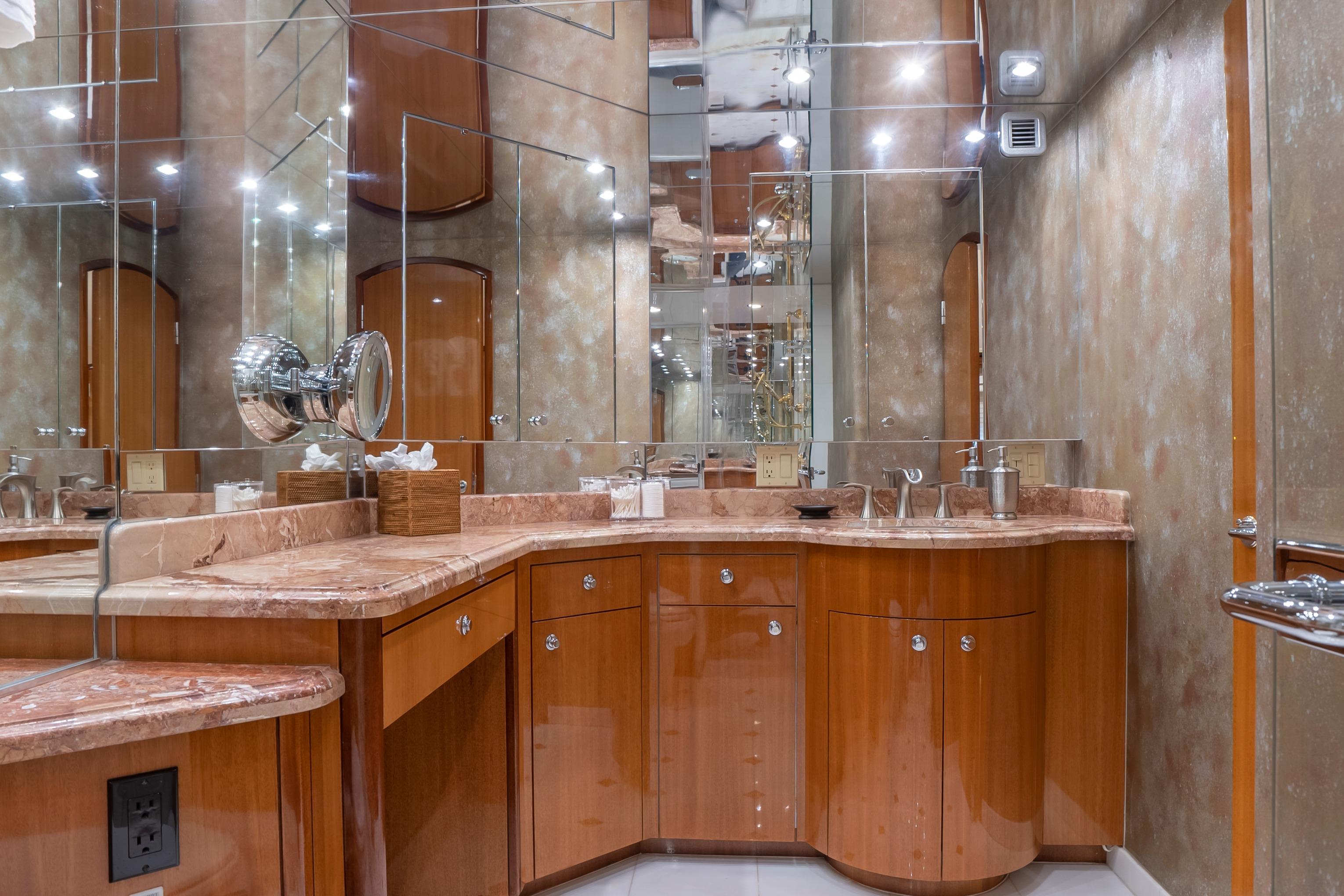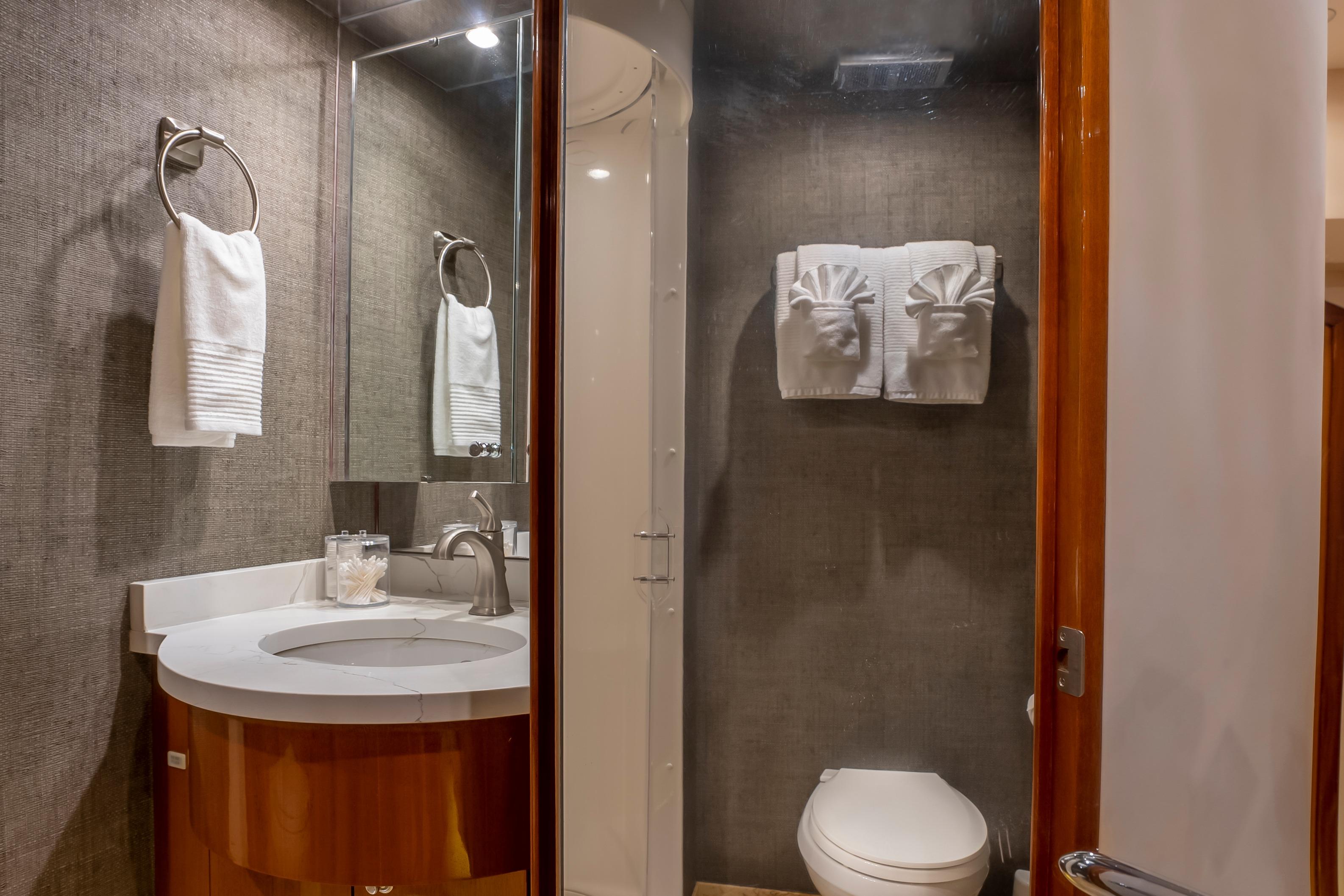 Her spacious flybridge offers panoramic views, a custom hardtop, wet bar, grill, and plush seating — the ideal setting for sunset cocktails or al fresco dining under the stars. Aft, a generous teak swim platform and lounge deck welcome effortless access to the sea, tender, or water toys.