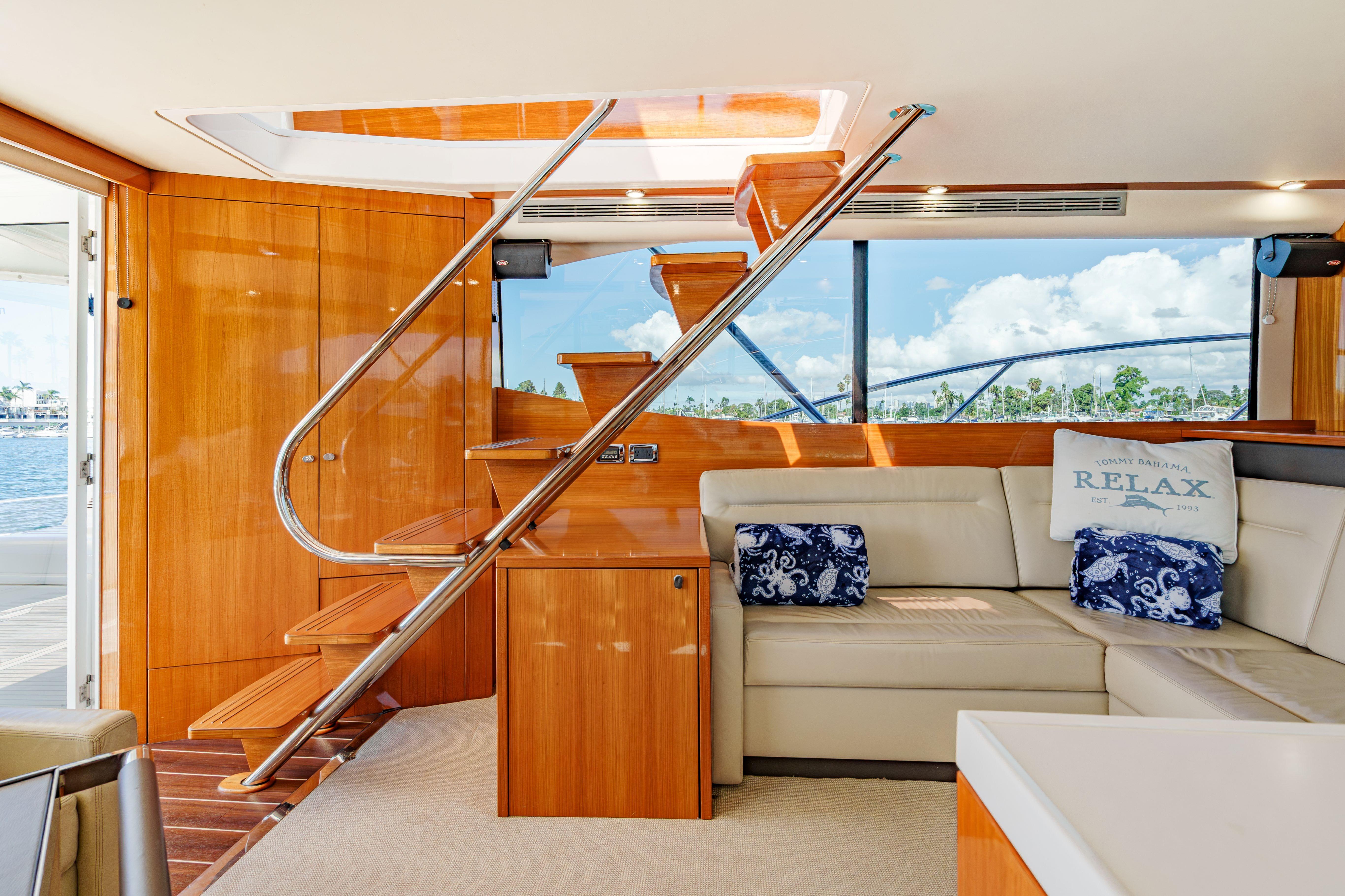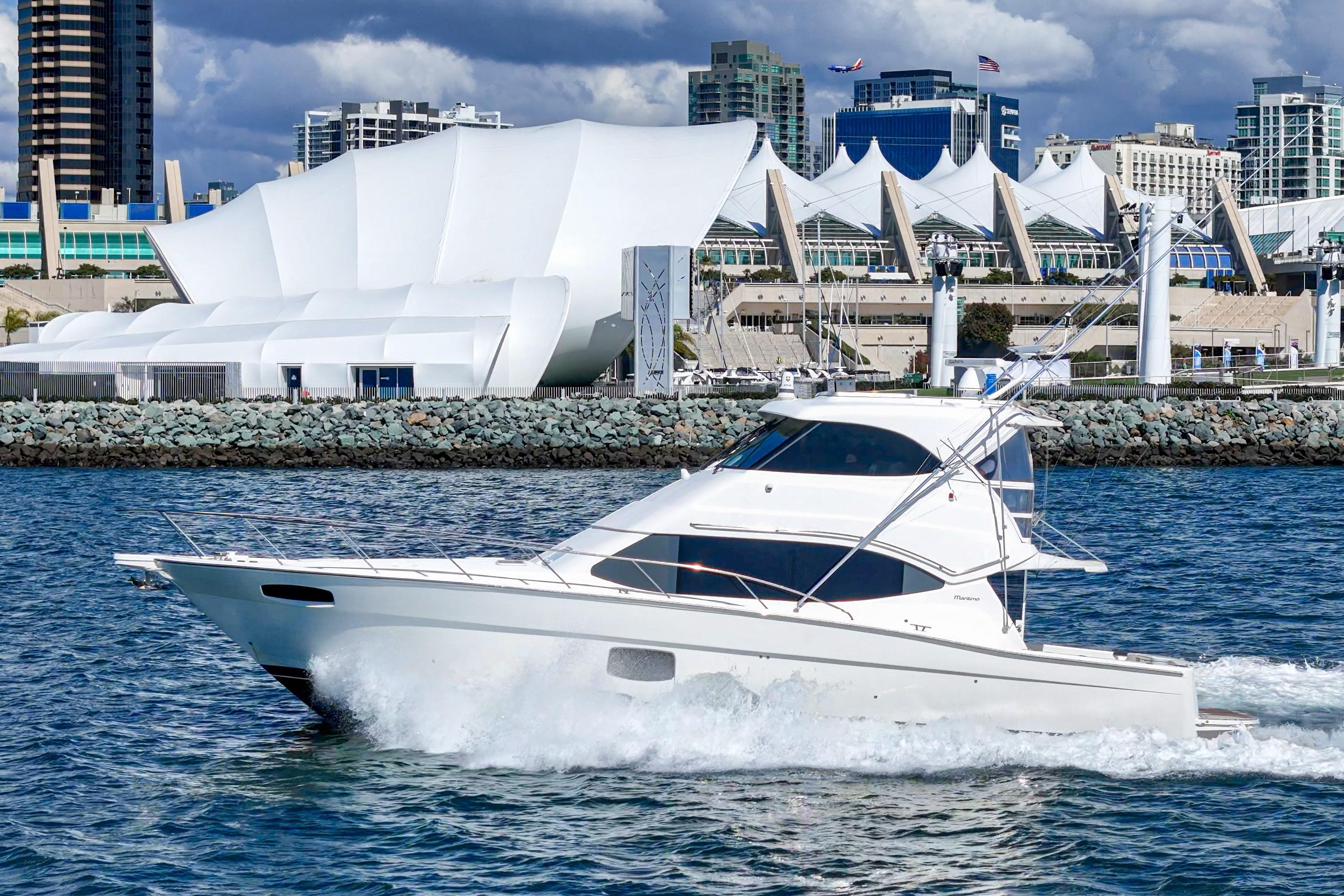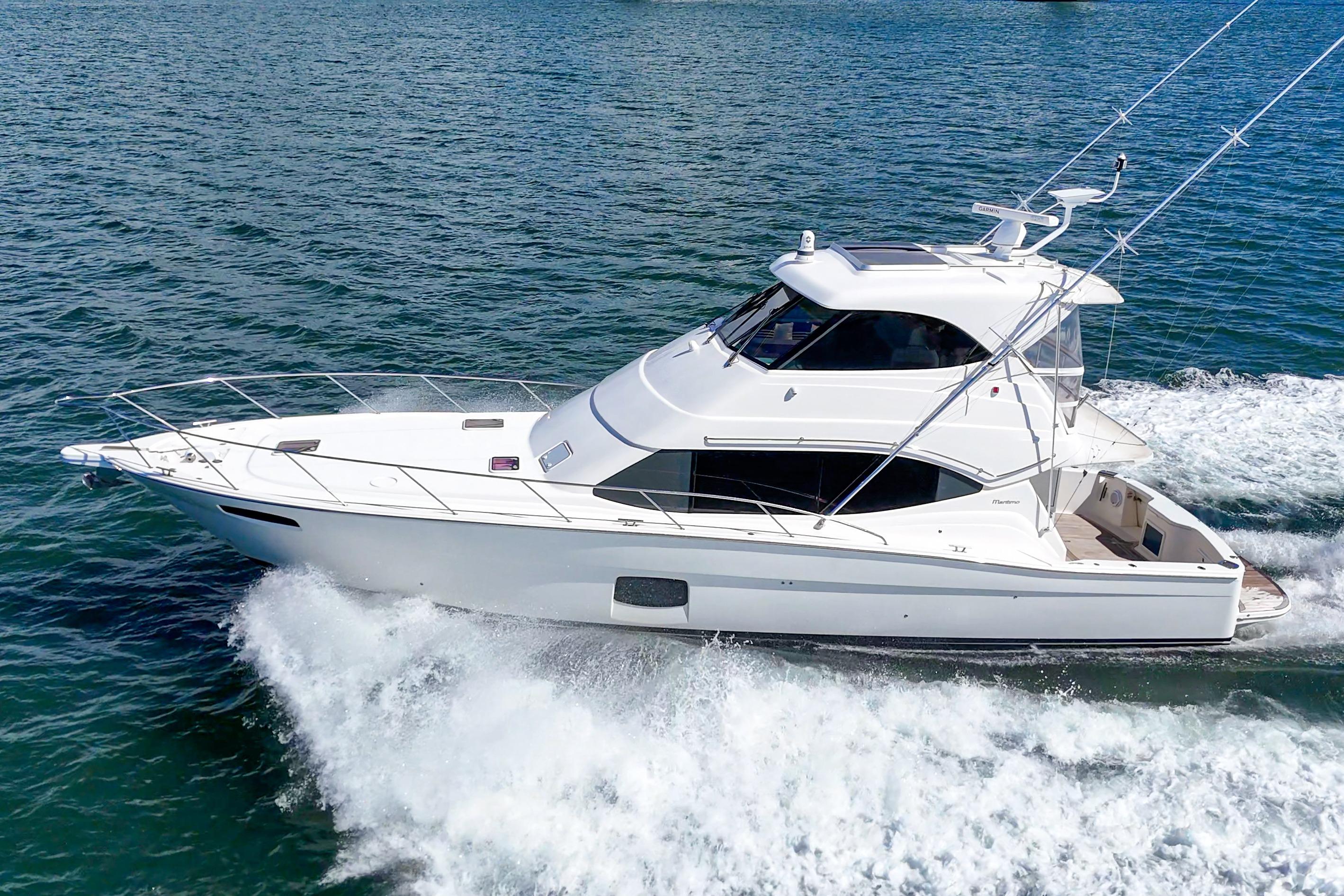 The Maritimo 470 Offshore Convertible enclosed flybridge offers a 3 Stateroom, 2 head layout. Her beautiful high gloss teak interior and custom soft goods gives you the feel of luxury and comfort while giving you the feel of a much larger boat. The enclosed flybridge accessed via straight stairs inside the salon door features an extensive electronics package, a removable teak folding table allowing the L-shaped seating to convert to an oversized bed. Her panoramic views are extraordinary with an opening sun roof that allows the feel of an open bridge. The economical shaft driven D11 Volvo diesels offer a 27 knot cruise and 32 knot top speed. Don't miss a great opportunity on an ideal combination sport fish and cruising yacht.