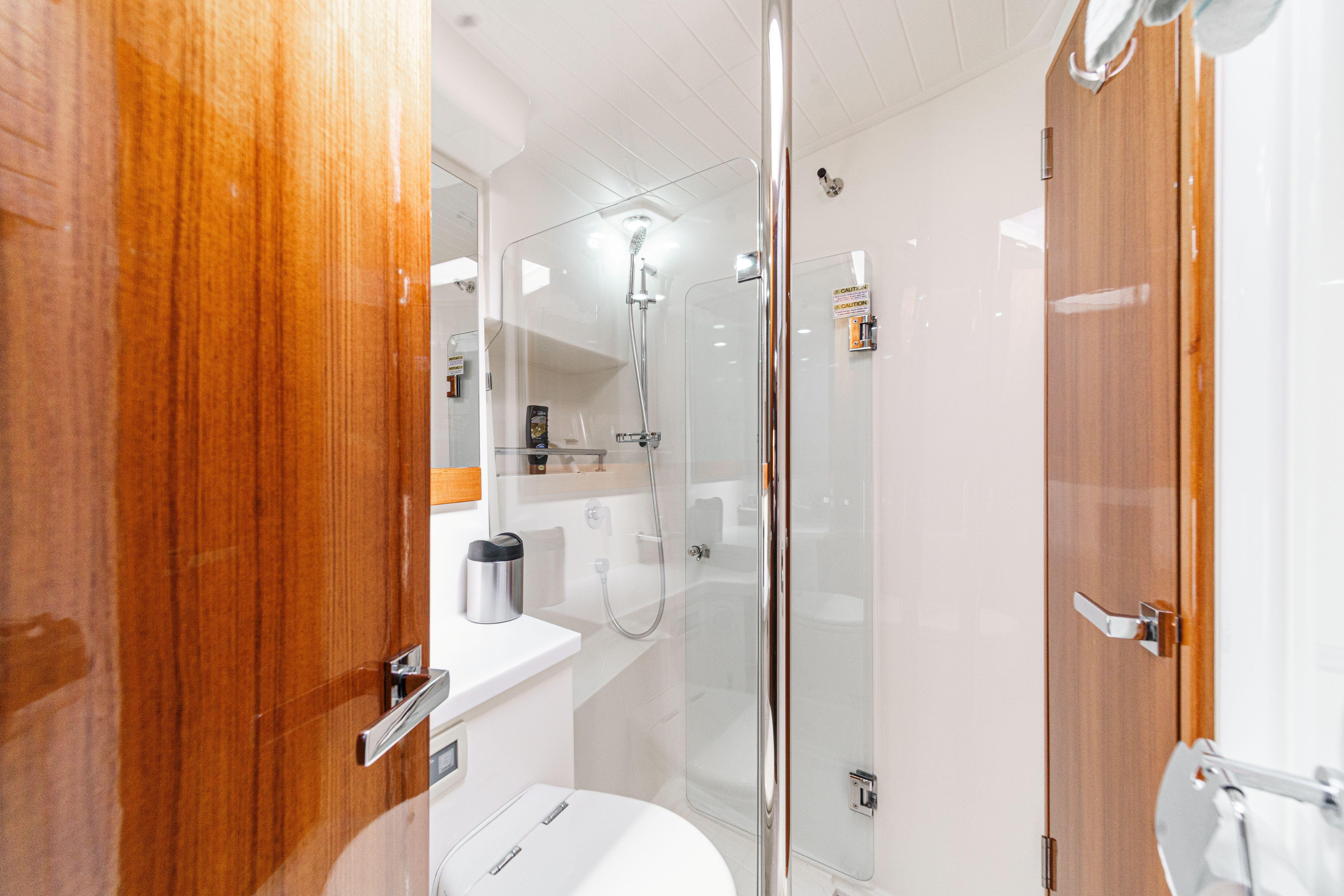 - En-suite head with shower, overhead hatch, and mirrored vanity with shelf storage.