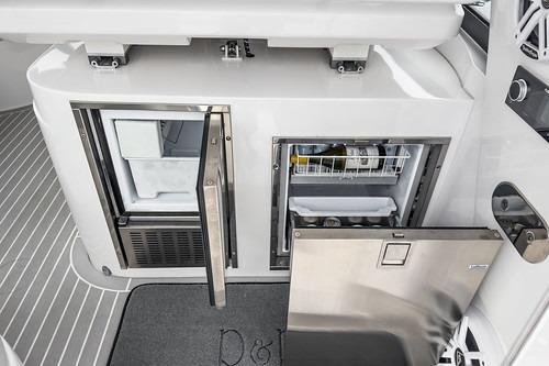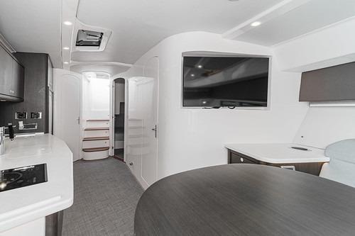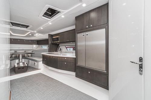 Step aboard from either the hydraulic portside swim platform or the starboard hull side door. The aft cockpit features an oversized lounge area with a hi-low electric table and a folding rear bench seat for catching some rays. Other cockpit features include a retractable electric sunshade, a wetbar, electric grill, refrigerator and icemaker. During inclement weather, everyone can stay dry inside the full insinglass enclosure while still enjoying the feeling of being outside.