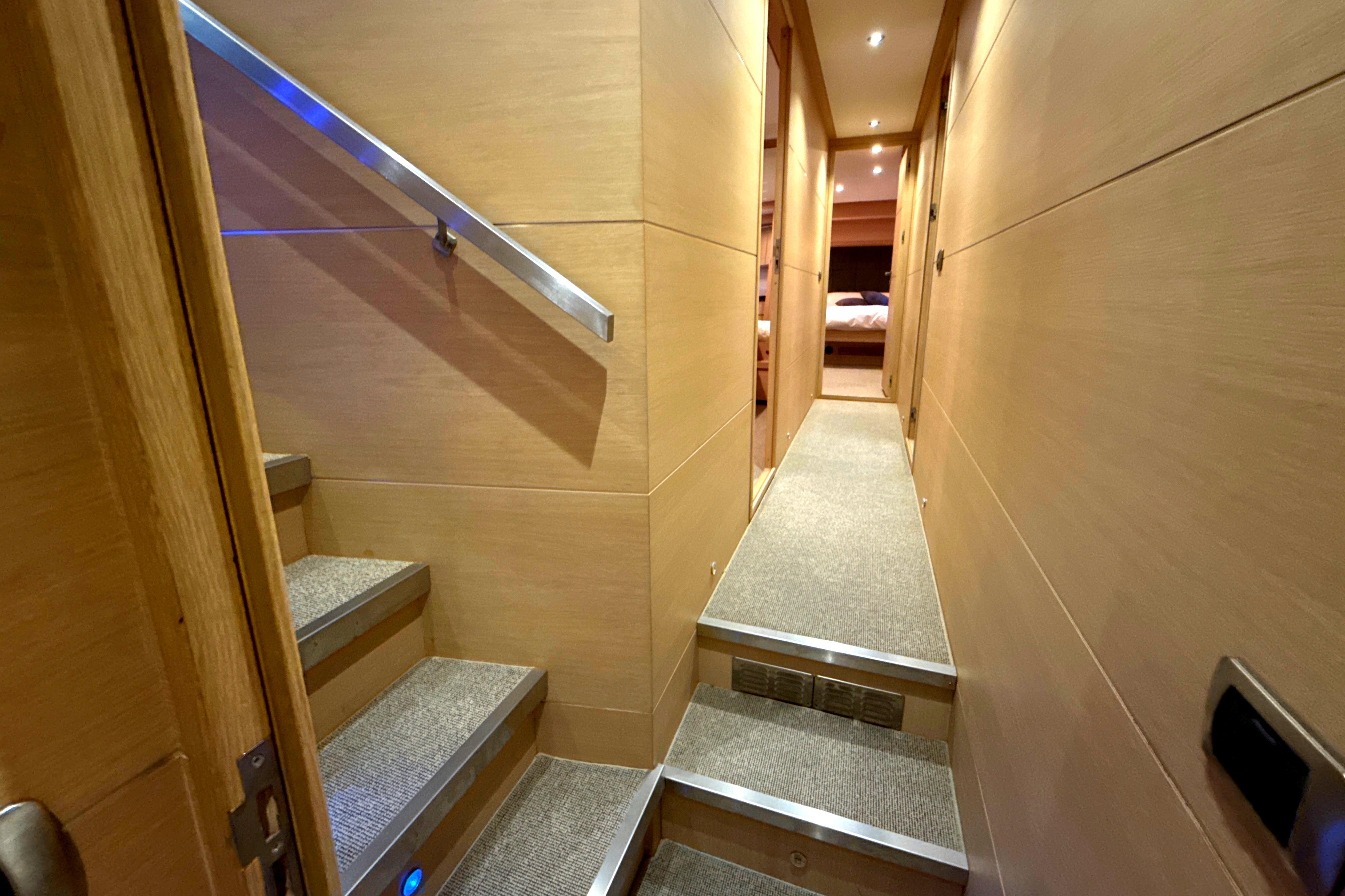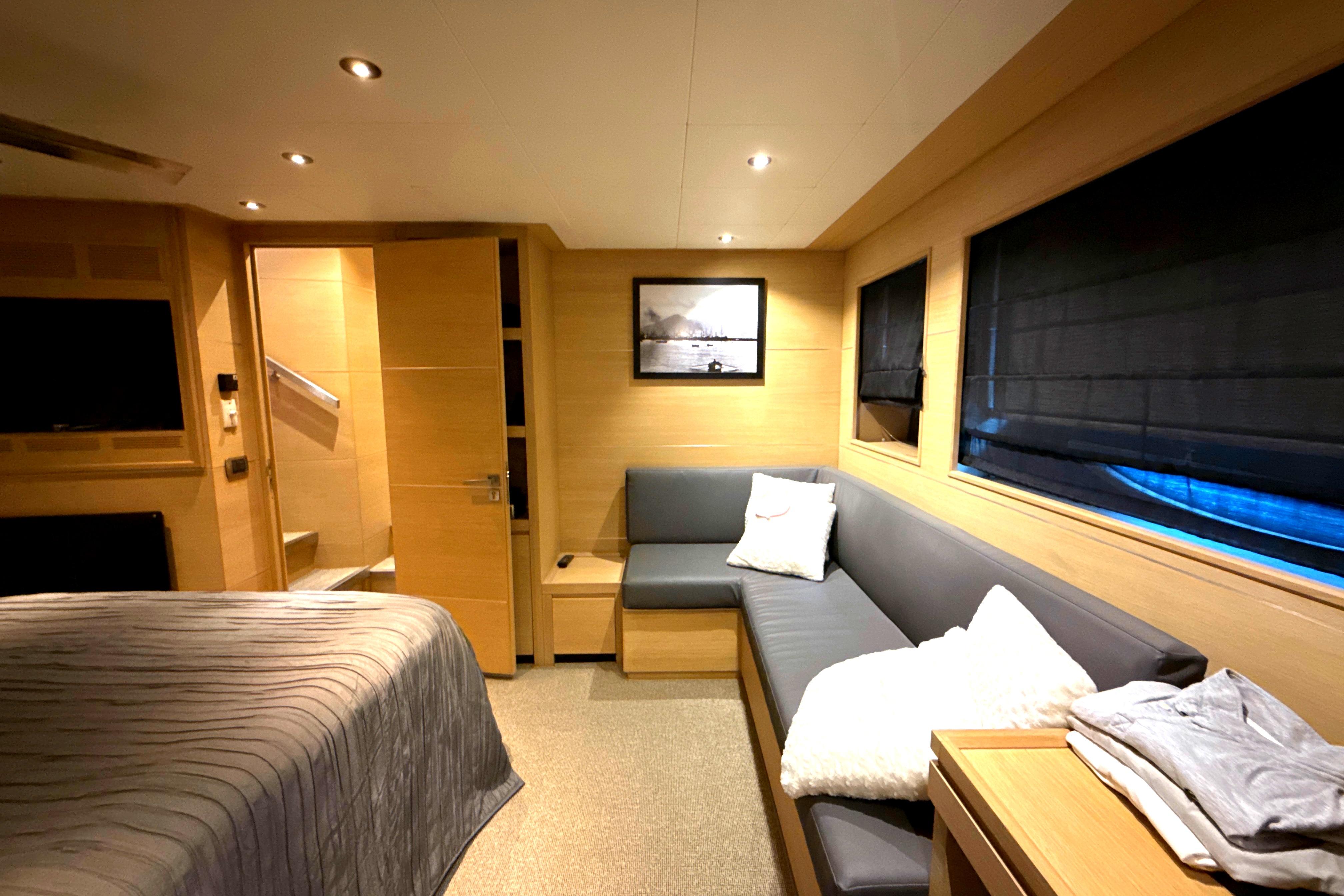 Outdoor Spaces: The yacht boasts a large flybridge with a dining area, sun loungers, and a wet bar—ideal for entertaining or relaxing while enjoying the views. The aft deck provides additional alfresco seating, while the foredeck offers a private sunbathing area.