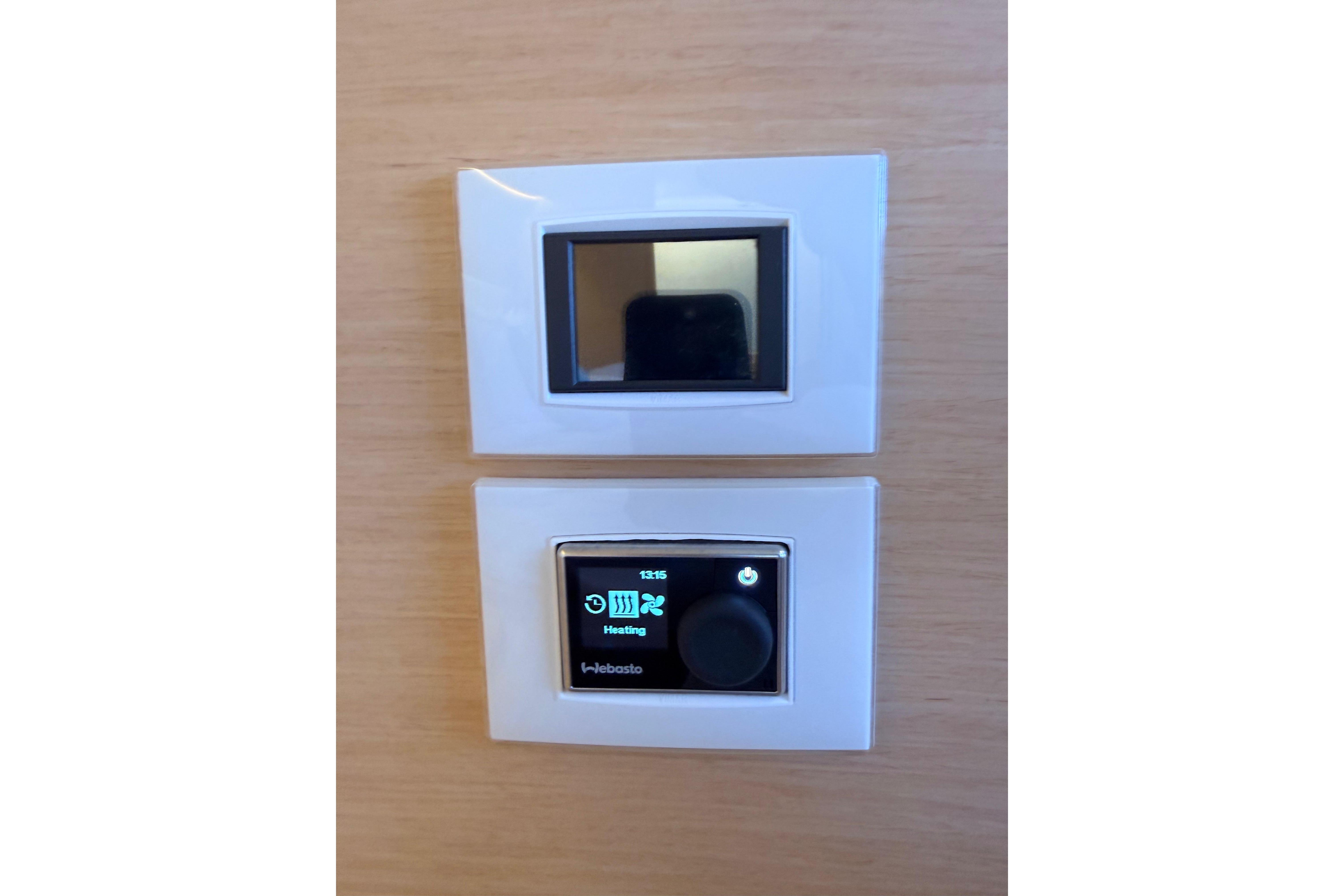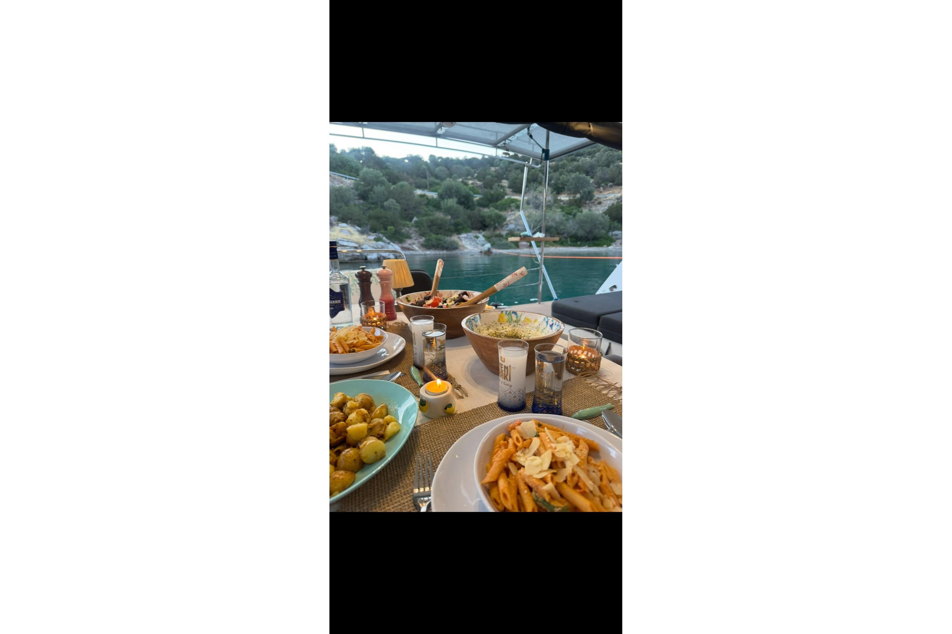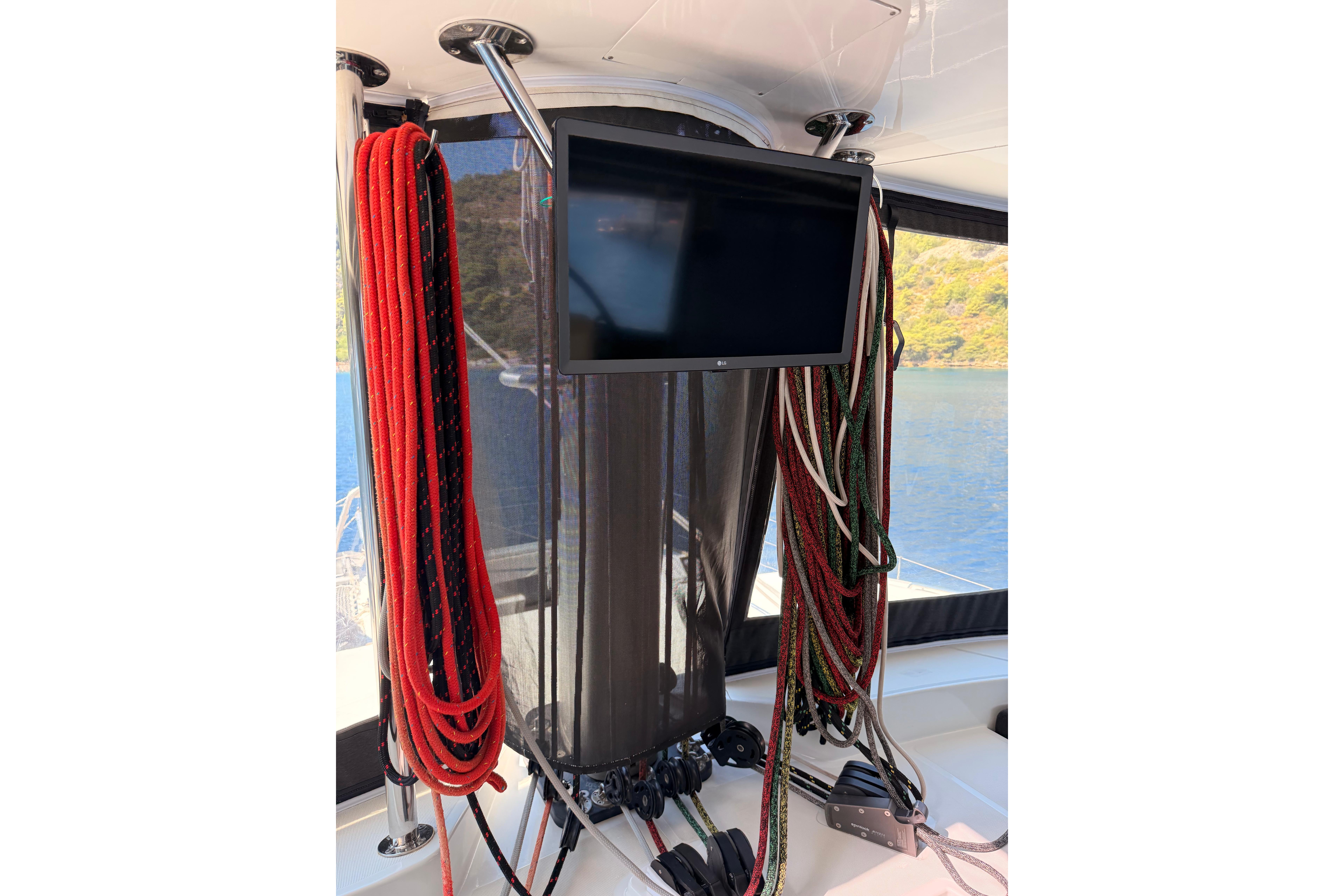 Additional upgrades include Webasto diesel heating for both hulls , LED indirect lighting, Fusion AV-755 multimedia, and a custom teak extendable table in the cockpit.