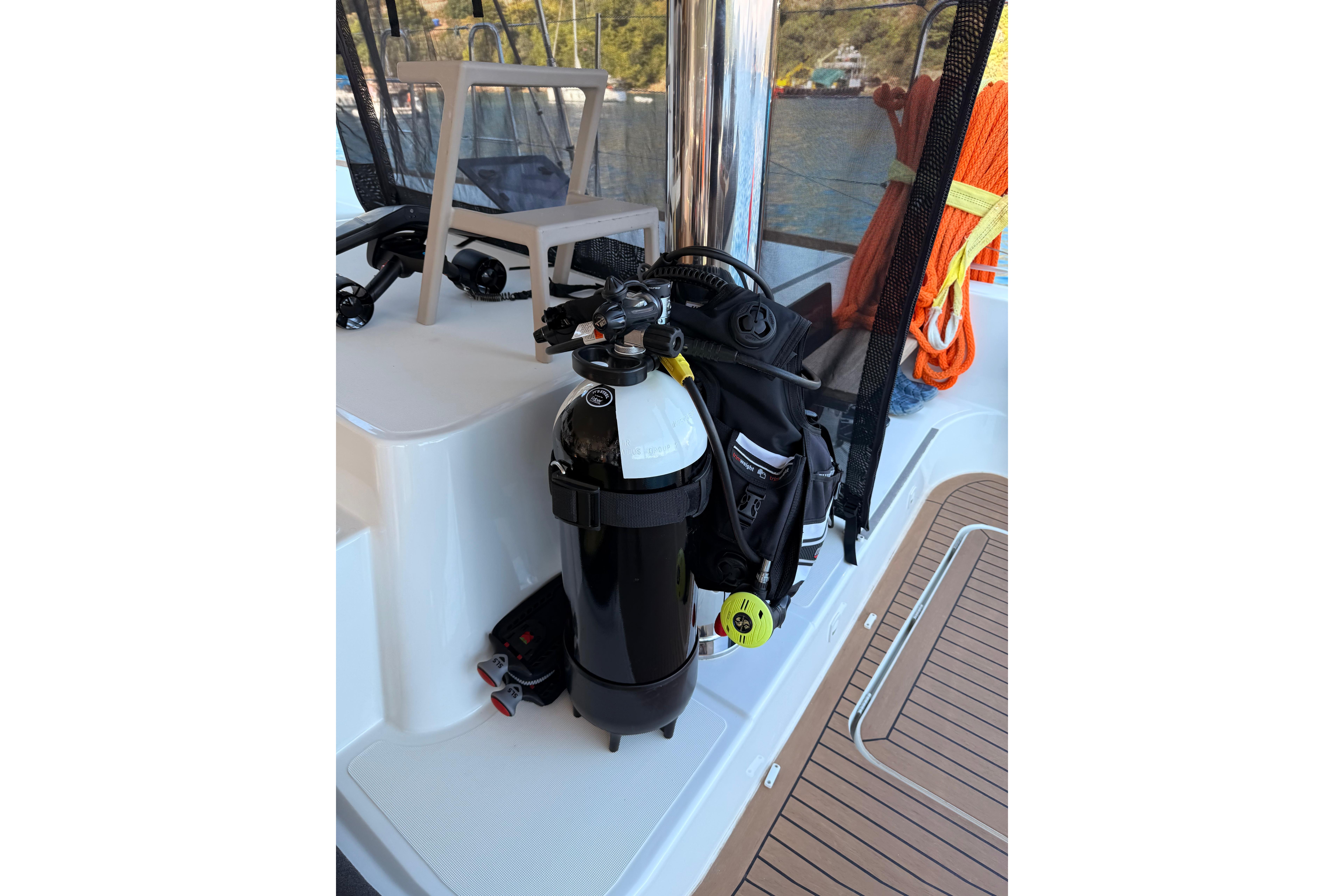A full diving setup (Nardi compressor, scuba sets, paddle board, sea scooter, and banana) adds to the adventure-ready spirit of this yacht.