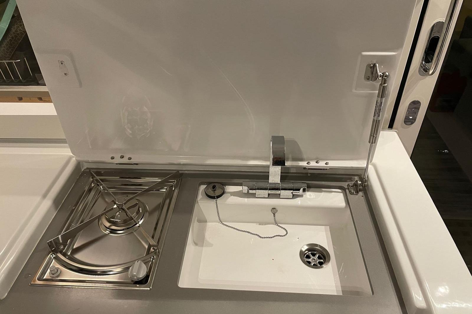 The galley features Bosch premium appliances, including a dishwasher, oven, 4-burner stove, and microwave, plus a dedicated three-stage filtered water system.