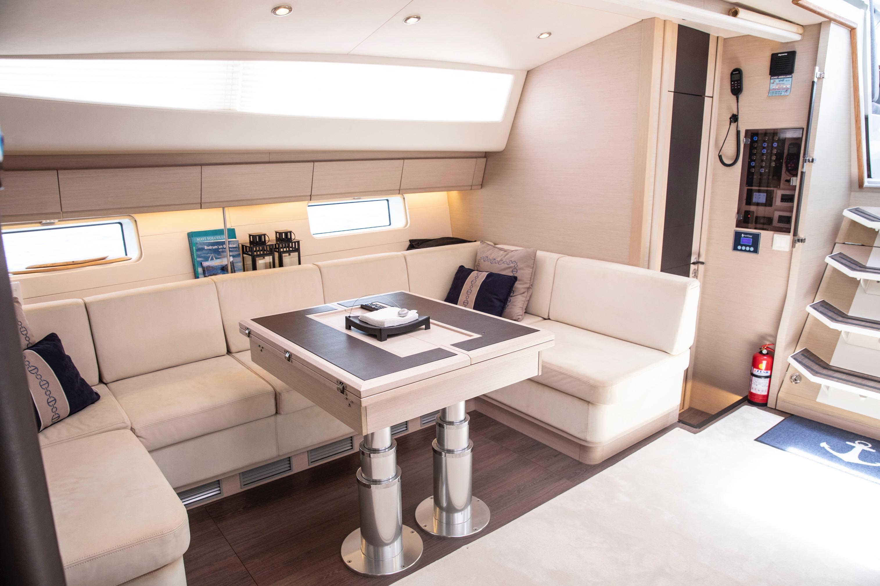 - Large cockpit table with integrated fridge