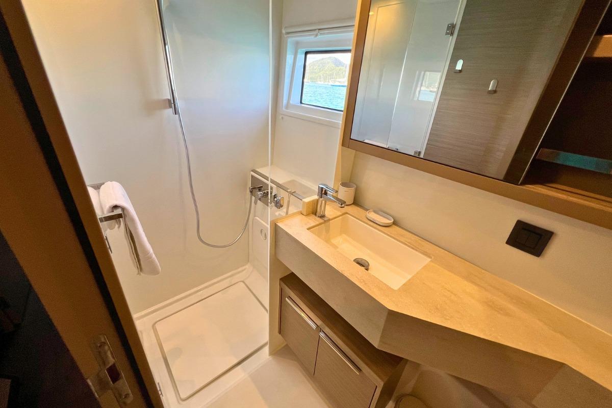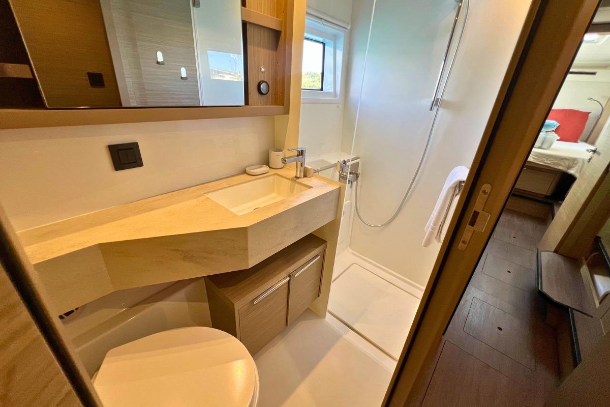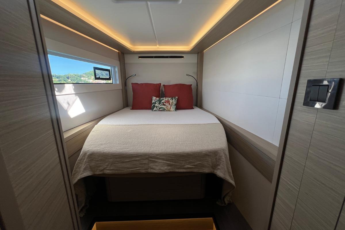 À bord, la version 4 cabines comprend une cabine supplémentaire dans la pointe avant tribord, chaque cabine disposant de sa salle de bain privative avec WC, douche et lavabo. Les cabines offrent sommier à lattes, rideaux et ventilateurs, tandis que la sellerie intérieure Grand Comfort Nature ajoute confort et élégance. Les espaces de vie sont lumineux et accueillants, avec un carré central spacieux et un accès facile au cockpit et au flybridge.