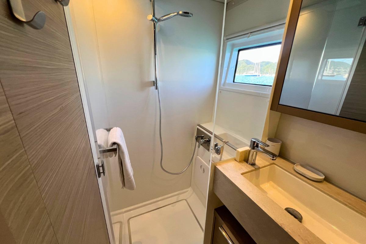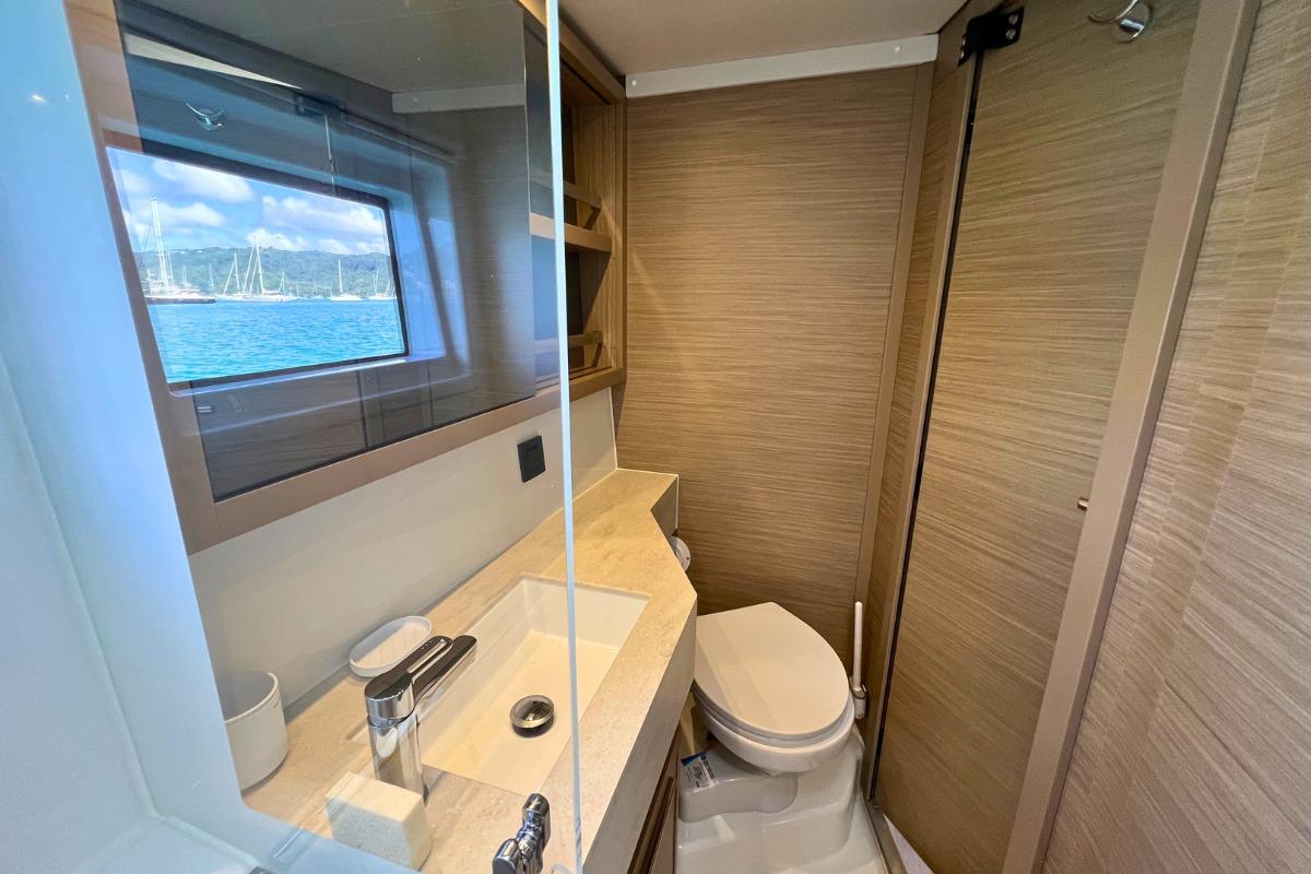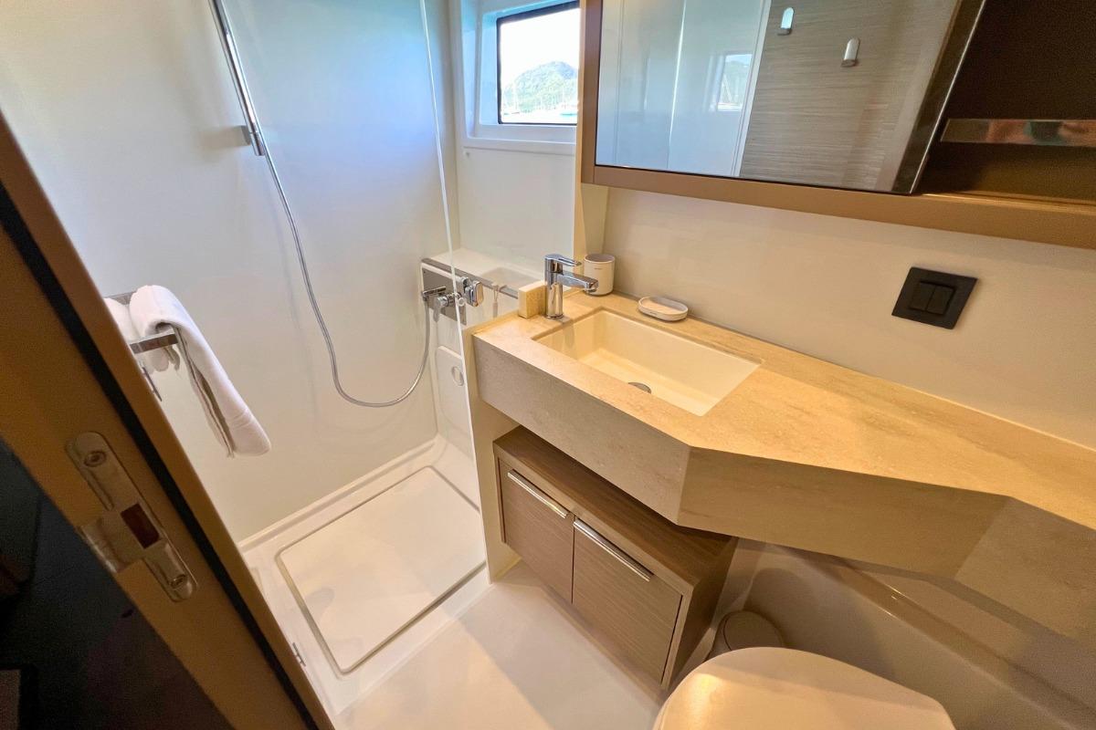 Inside, the 4-cabin layout includes an additional cabin in the starboard forward hull, with each cabin featuring a private bathroom complete with a toilet, shower, and sink. Cabins are fitted with slatted beds, curtains, and fans, and the Grand Comfort Nature upholstery adds both style and comfort. The main saloon is bright and spacious, seamlessly connecting to the cockpit and flybridge, creating an inviting social area.