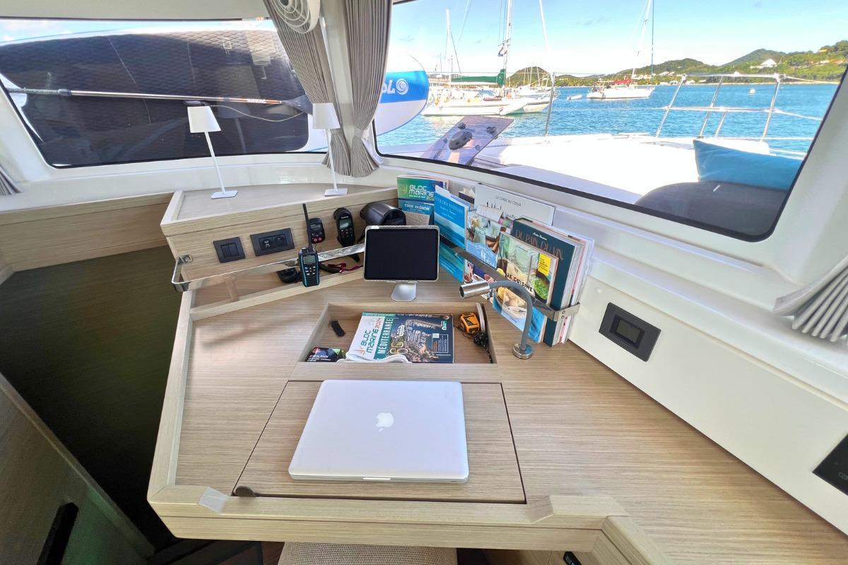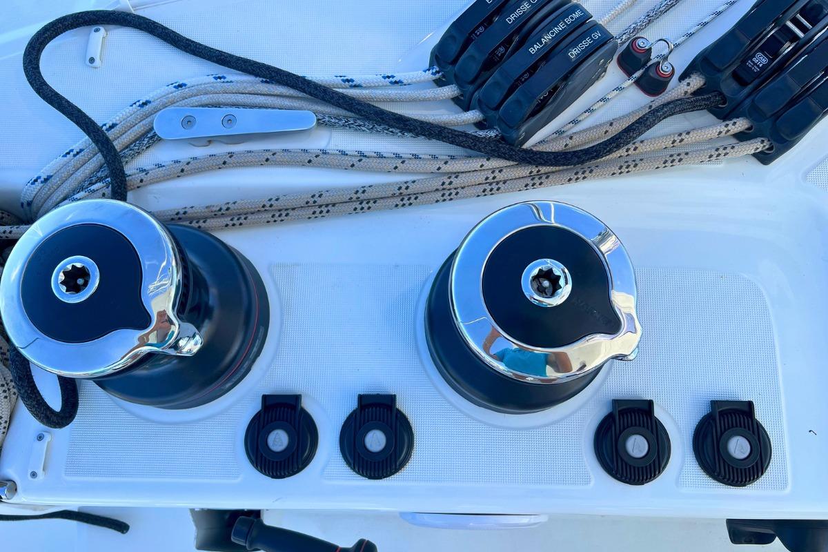 Le confort à bord est renforcé par une climatisation réversible WEBASTO 220V, un grand vitrage de roof ouvrant, et un système audio Bose FreeSpace 3 dans le carré. L’eau et l’énergie sont gérées par un dessalinisateur 100 L/h, un générateur, un convertisseur 12V/220V 2000 VA et des pompes d’eau douce et de mer dédiées.