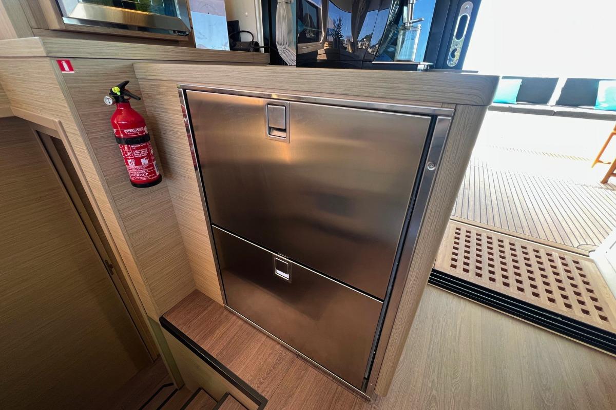 La cuisine est entièrement équipée : four inox Force 10, lave-vaisselle 220V pour 6 couverts, réfrigérateur 155 L, conservateur 90 L, réfrigérateur de cockpit 80 L, et un ice-maker 220V. Le cockpit dispose d’une banquette coulissante, de coussins de confort, d’une table en bois avec housse et de bains de soleil avant et sur le flybridge, offrant des espaces de détente et de convivialité exceptionnels.