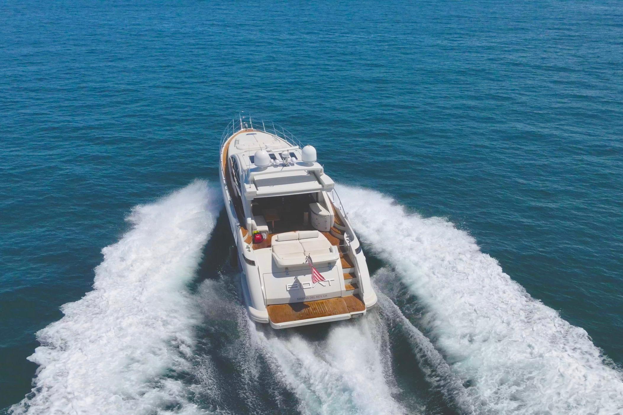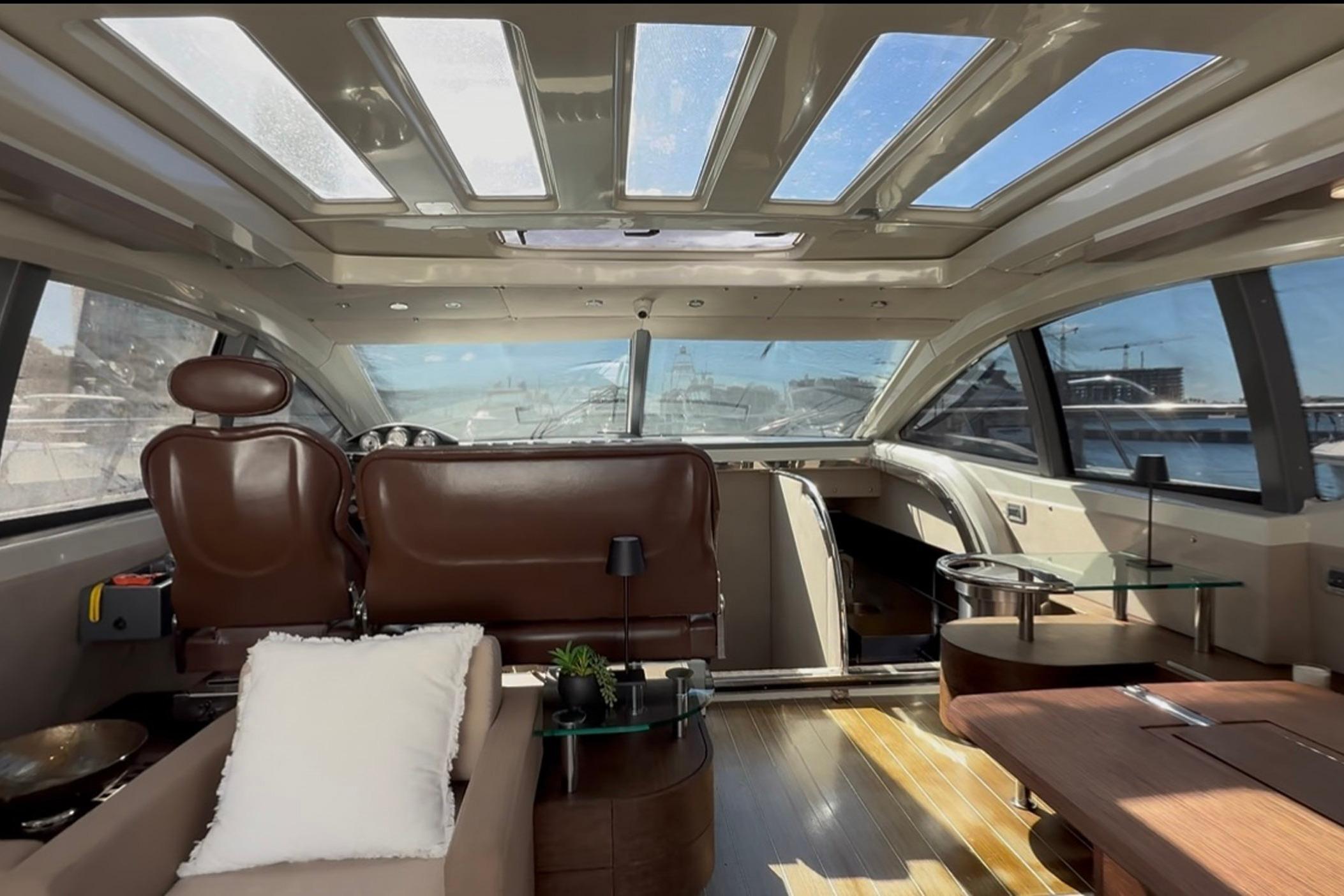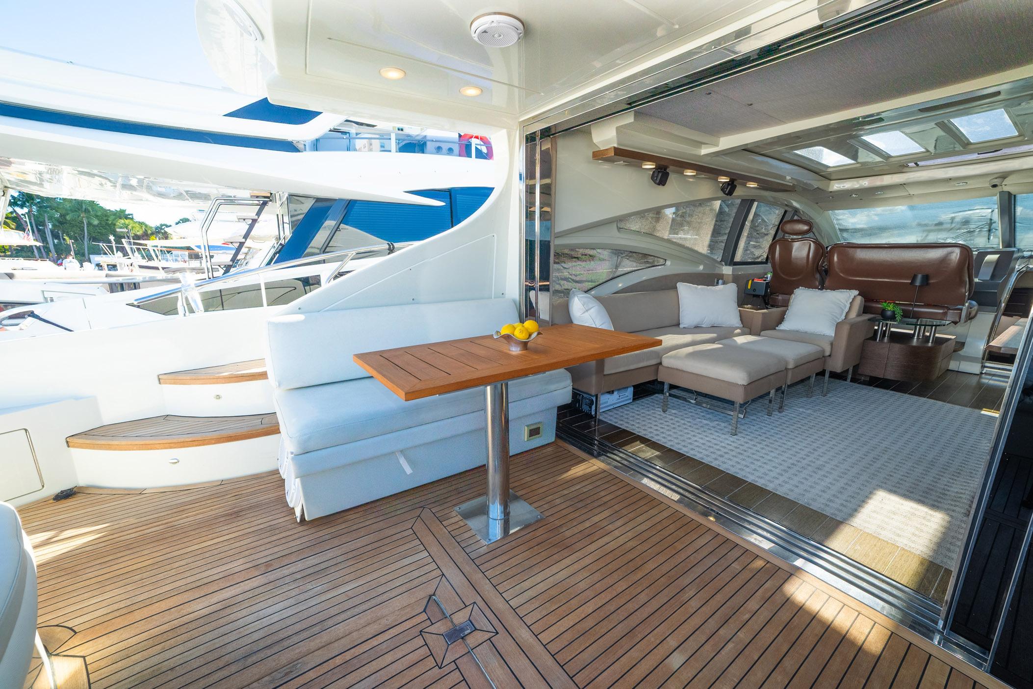 Features smart and social layout, perfect for entertaining. Spacious salon with tons of natural light, a wide aft cockpit with alfresco dining area and oversized sun bed, JL Audio, and a foredeck lounge deliver plenty of space to relax or entertain party guests with ease. She features sliding pocket doors and a retractable sunroof offering a full open-air experience. She also features a hydraulic swim platform and garage for tender/toys.