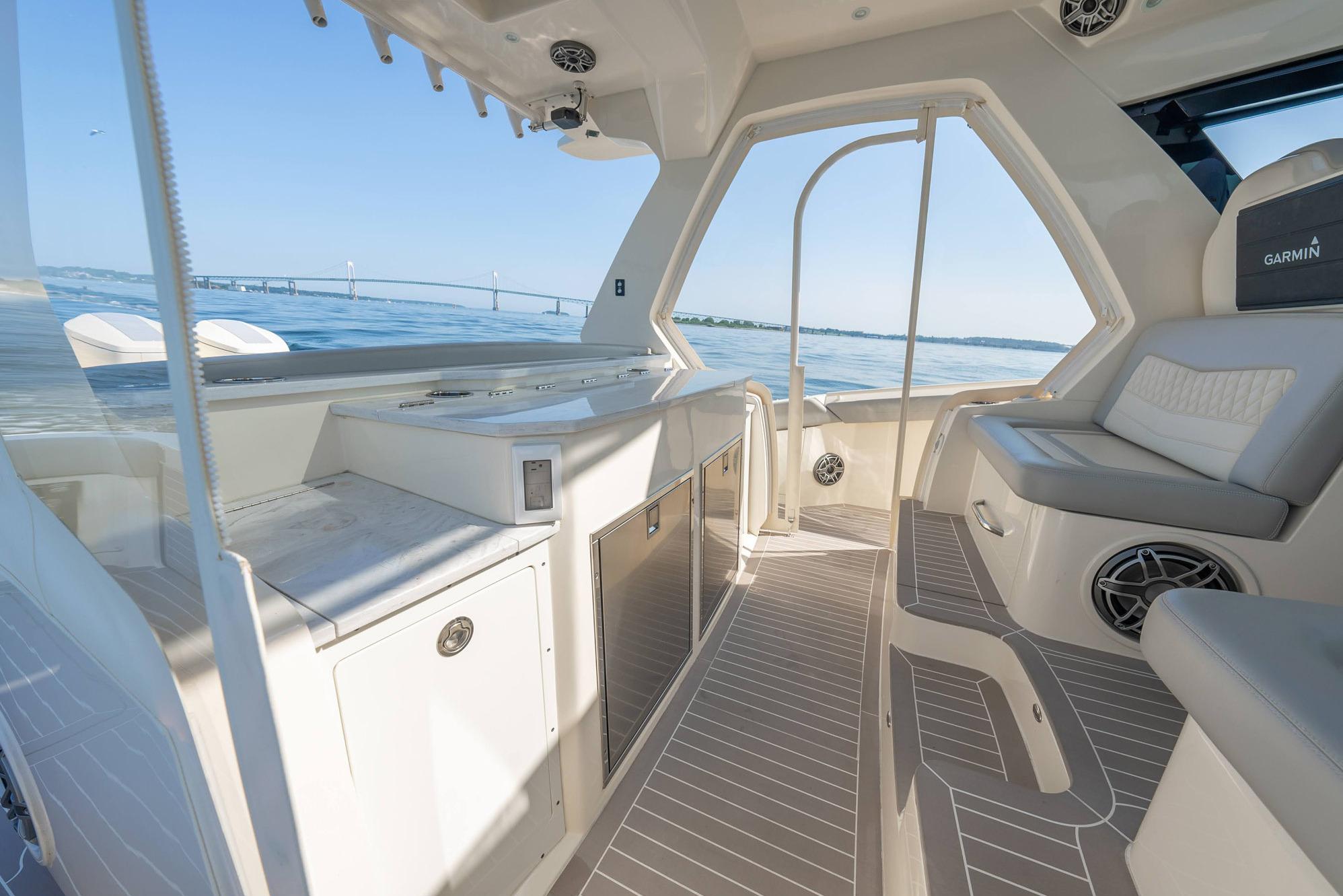 Moving aft to the cockpit, there are dual hydraulic beach platforms that expand the beam space to 17’ Beam with 150 ft.² of added entertainment space. If any inclement weather pops up, the opportunity to escape is available heading to her enclosed helm area and salon with climate control to provide luxurious comfort onboard.