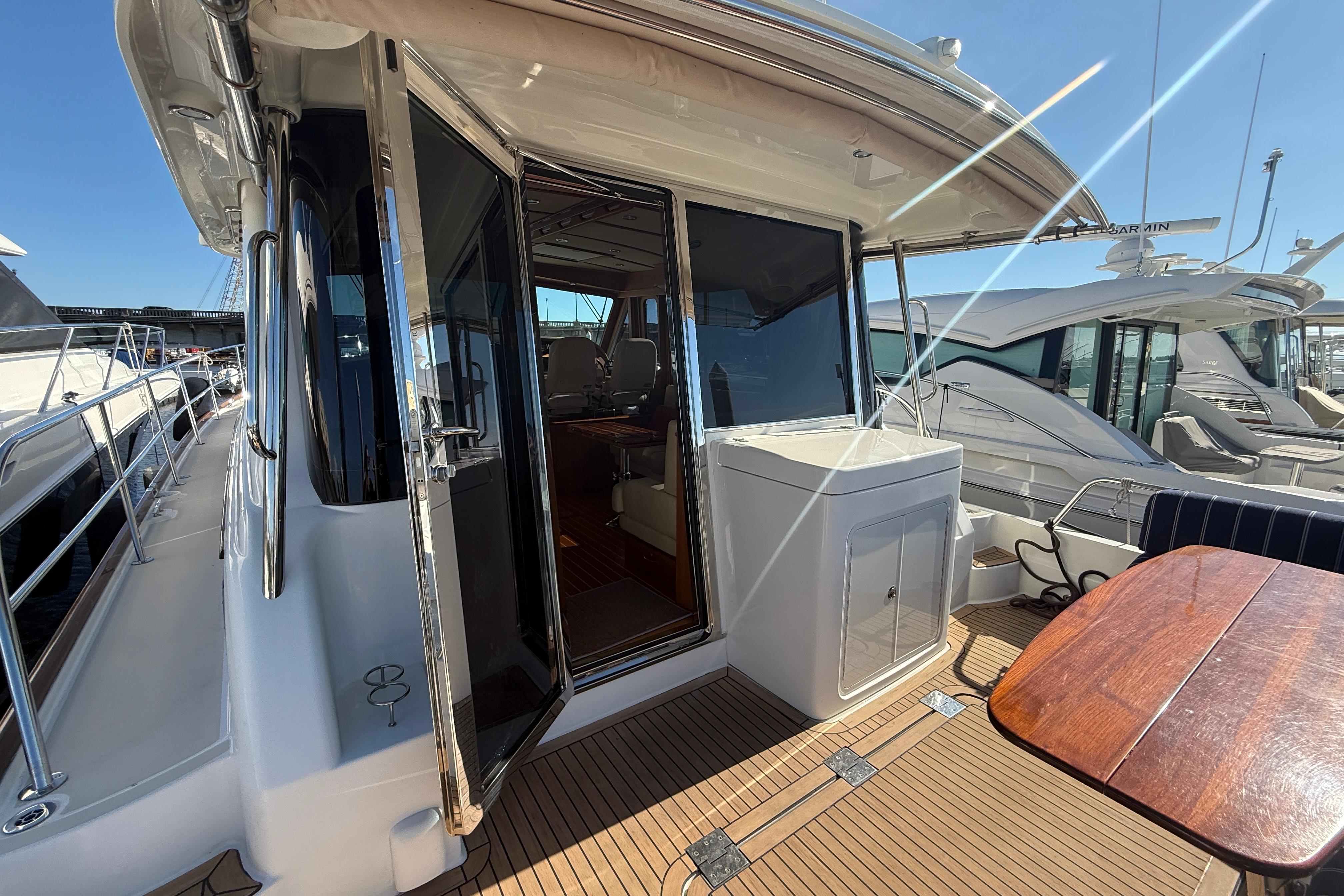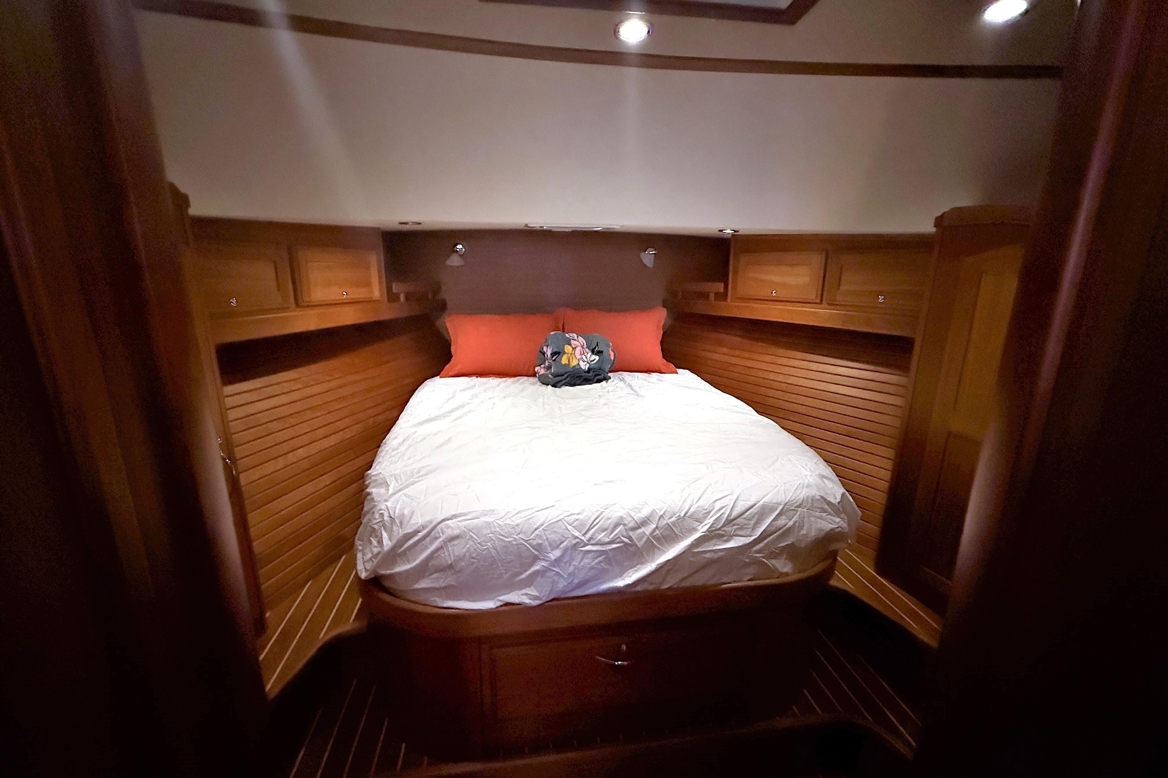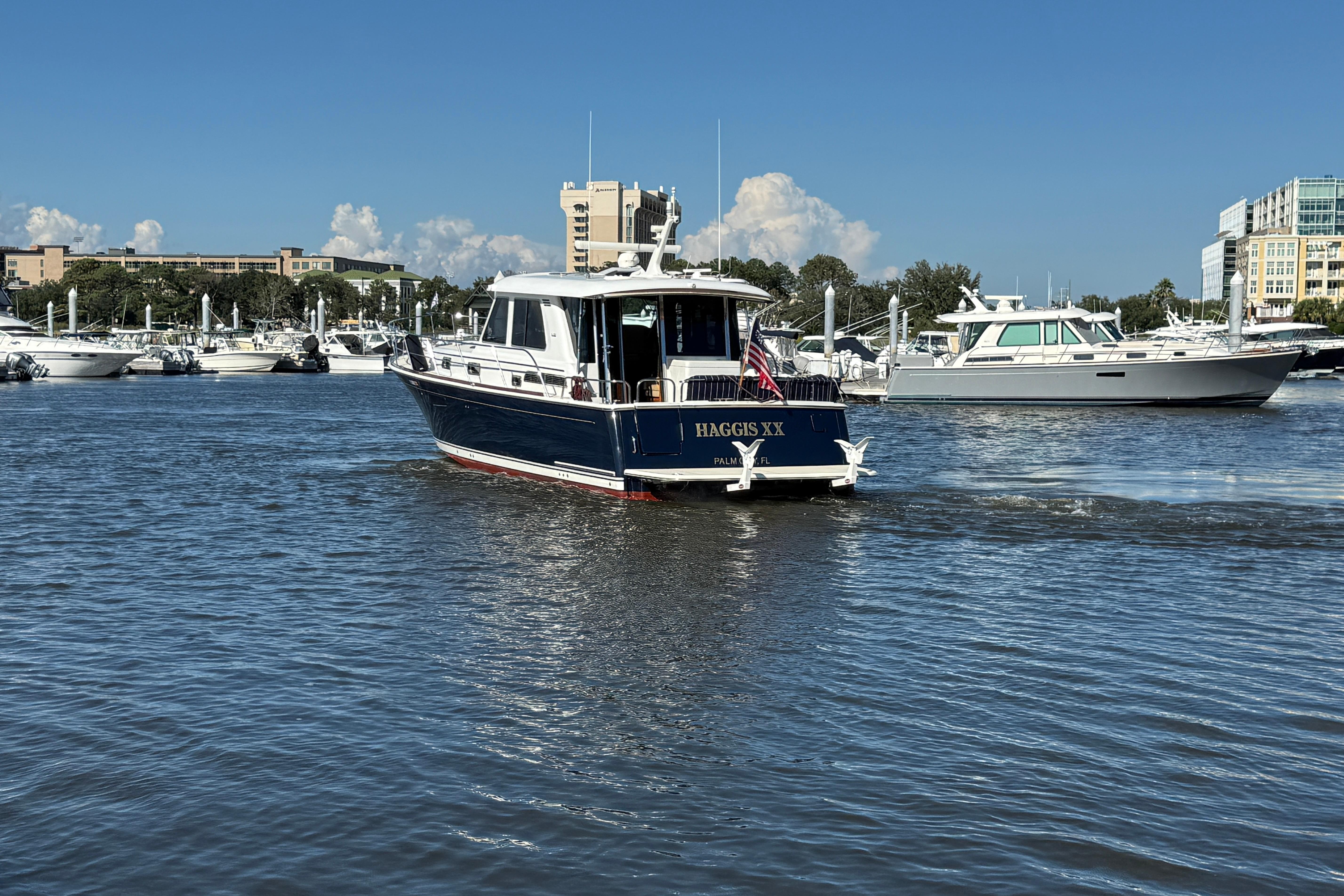 The 2017 Sabre 48 Salon Express is a luxury Downeast yacht known for combining elegant design with performance, featuring a deep-vee composite hull, twin Volvo Penta engines, and joystick-controlled Volvo pod drives for exceptional maneuverability. It has an open salon with an electric rear window that fully connects to the aft cockpit, an electric windlass, and two cabins and two heads. With a cruising speed of approximately 27-29 knots and a maximum speed over 32 knots, it's built for comfortable, quiet, and capable cruising.