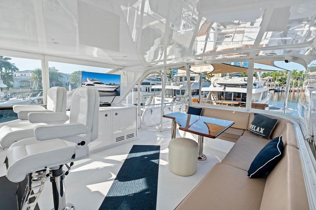 - Oversize L-shape fly bridge seating with underneath storage and white stamoid cover