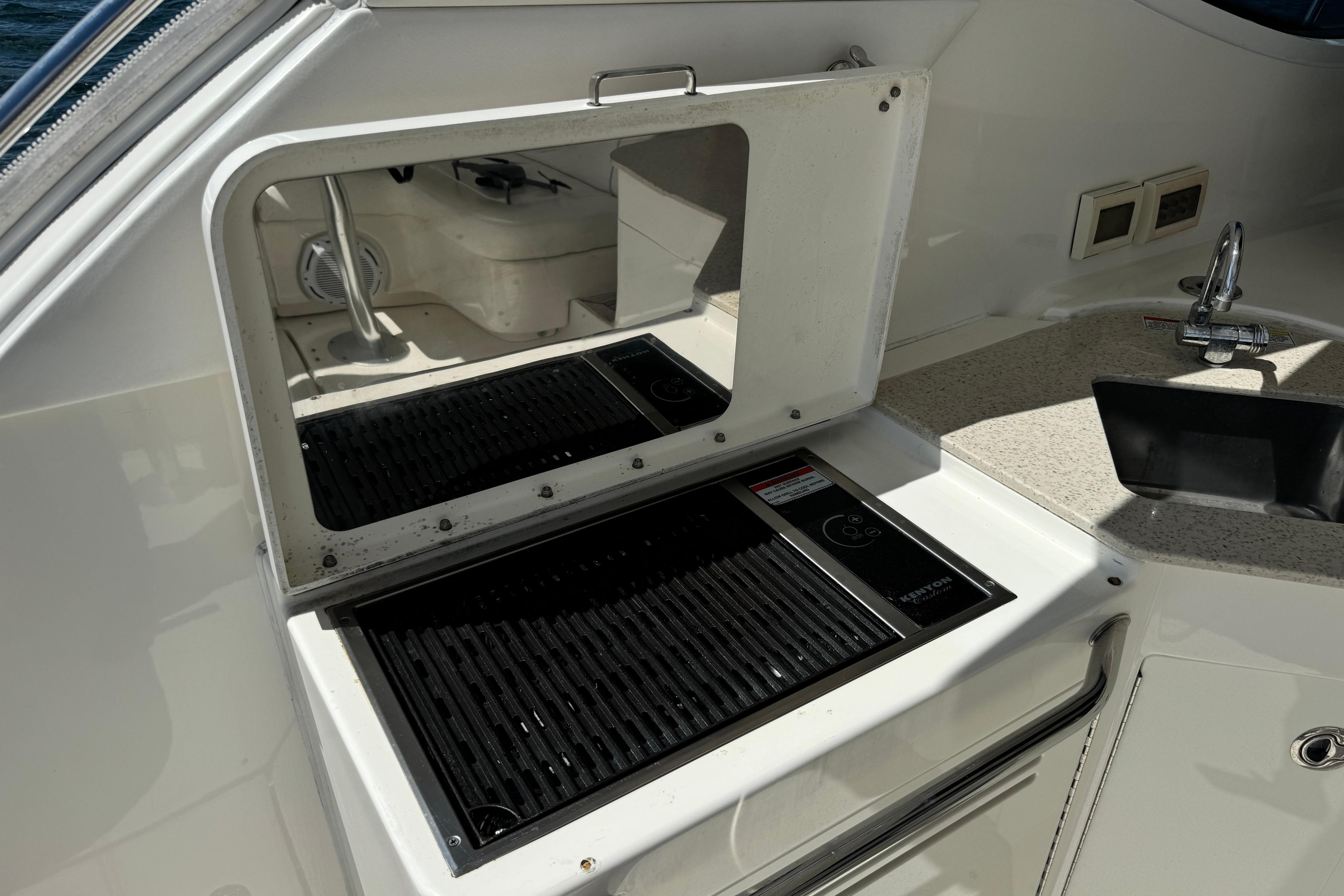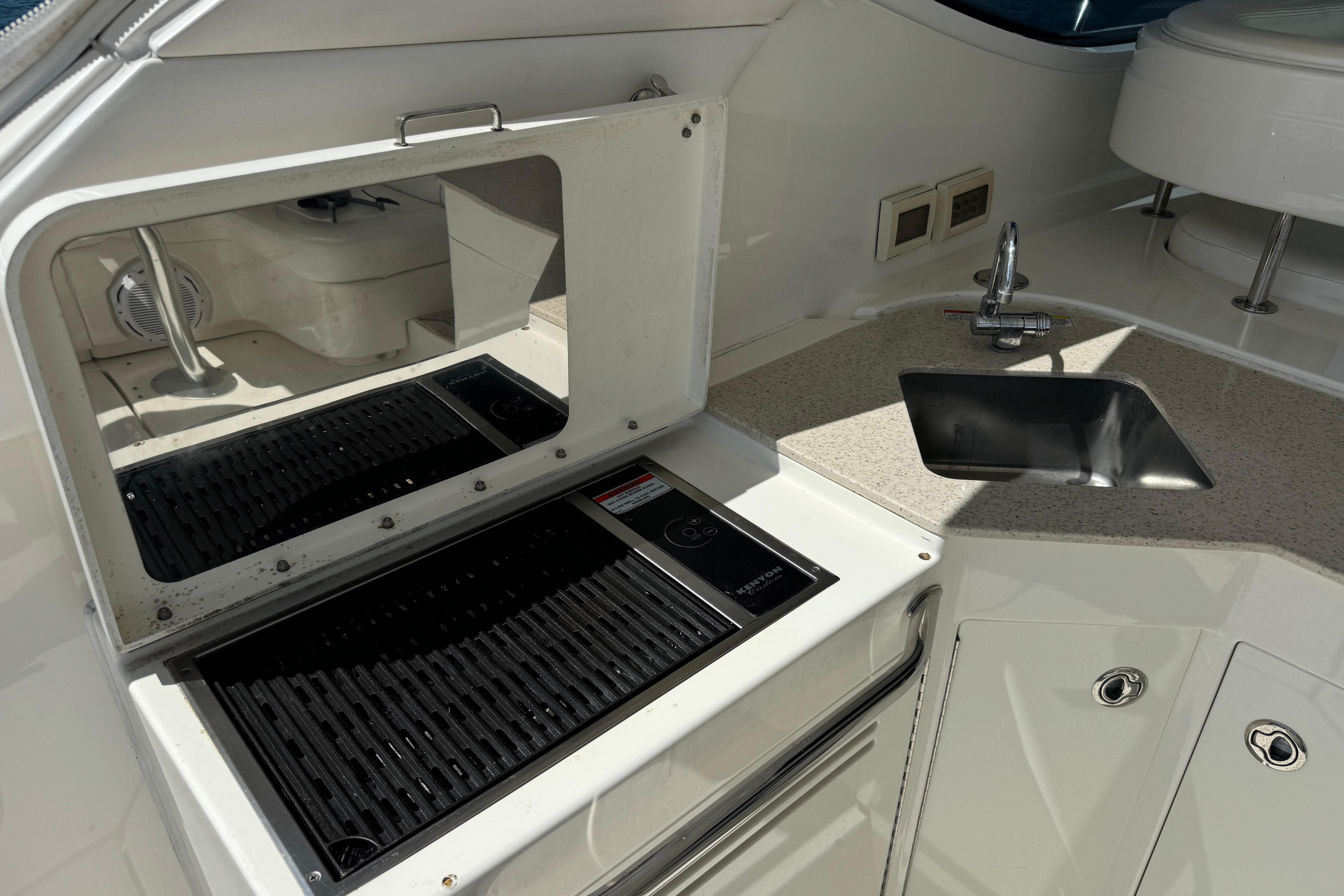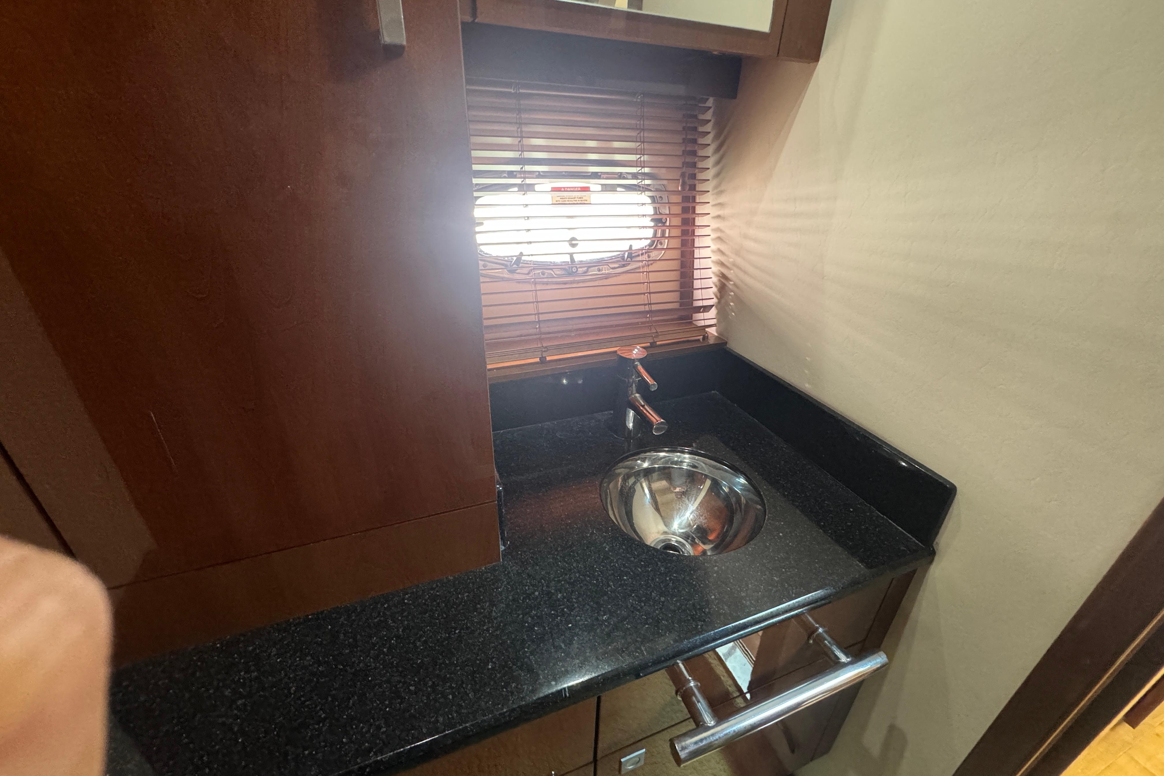 - Cockpit wet bar with sink and faucet, solid-surface countertop, stainless-steel handrail, trash receptacle, and storage cabinet.