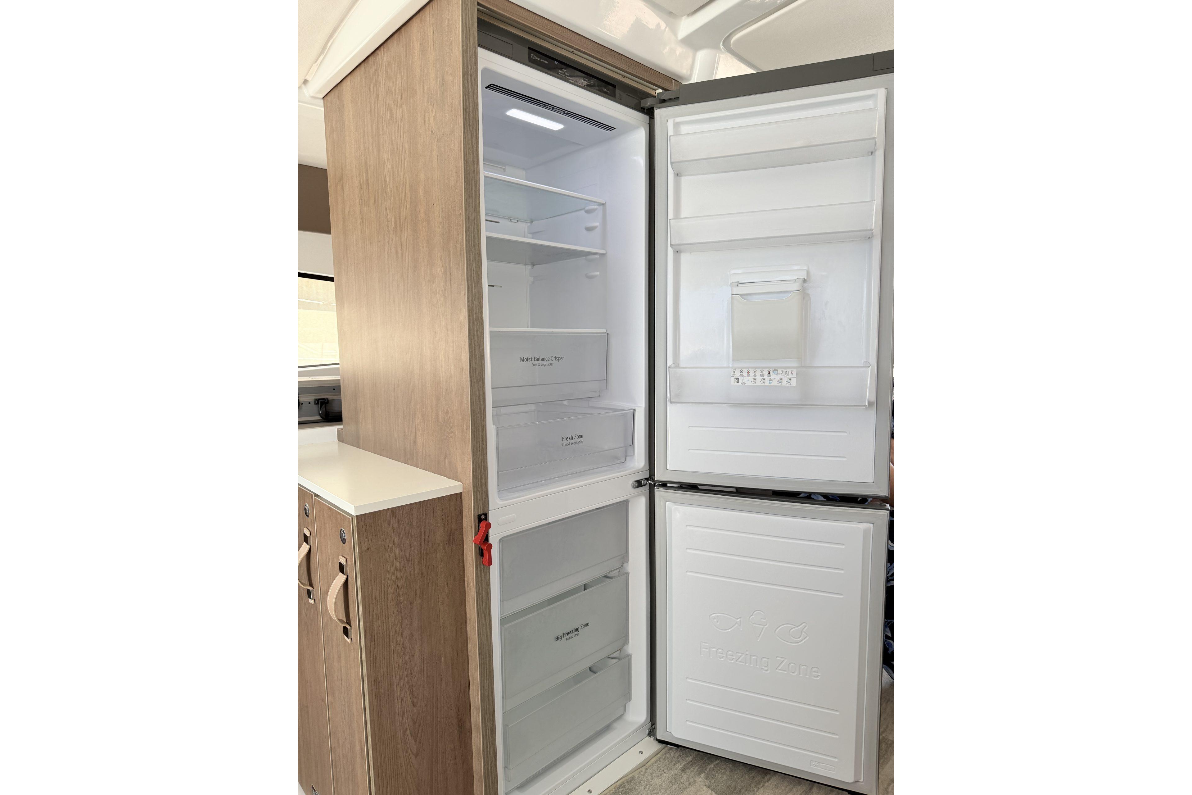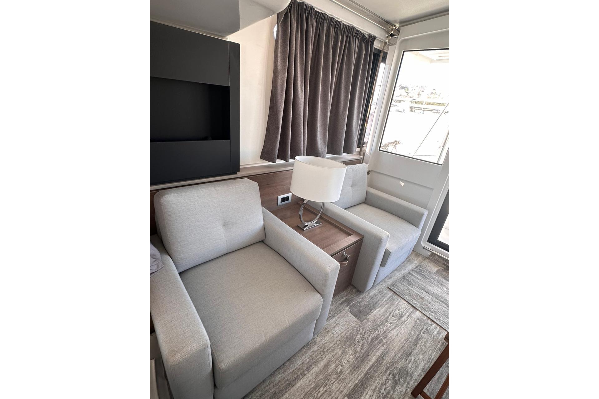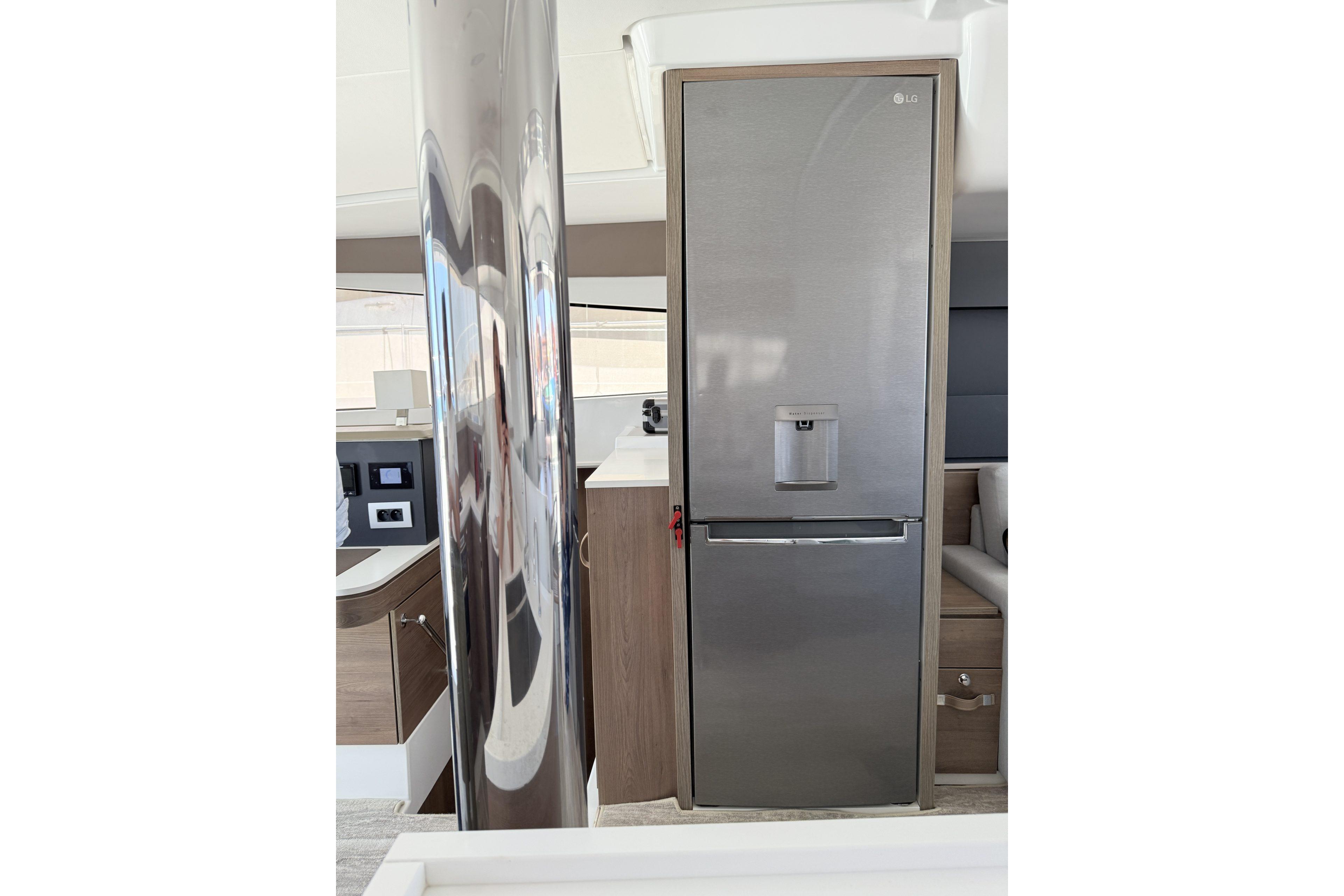 Comfort onboard is enhanced by air conditioning, a freshwater purifying filter, a large 336 L fridge and freezer, gas oven and stove, microwave, and a Nespresso coffee machine.