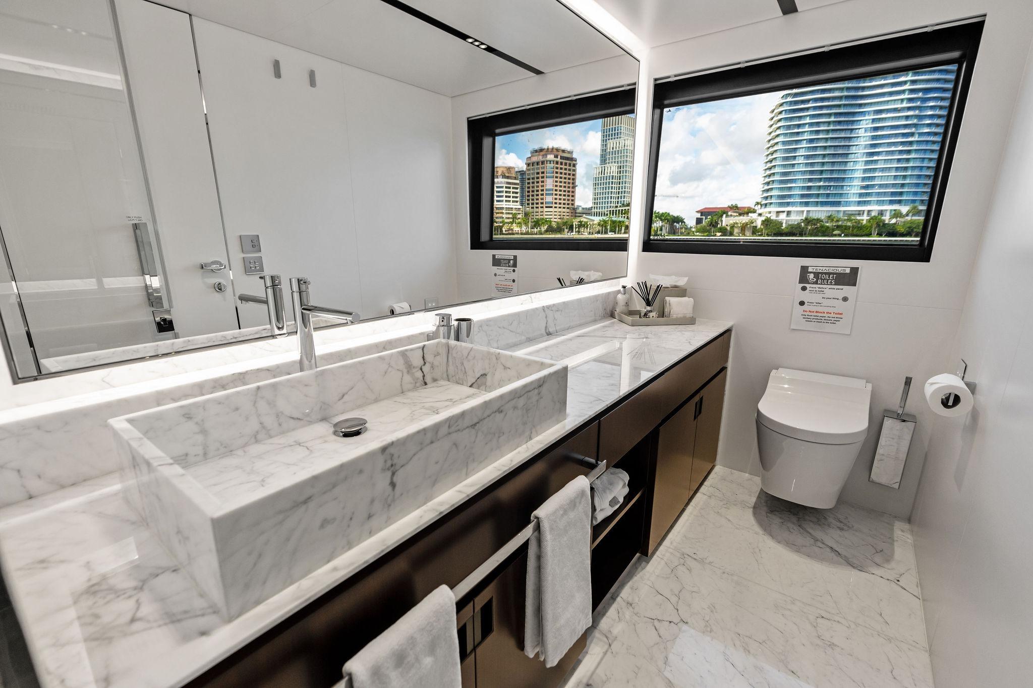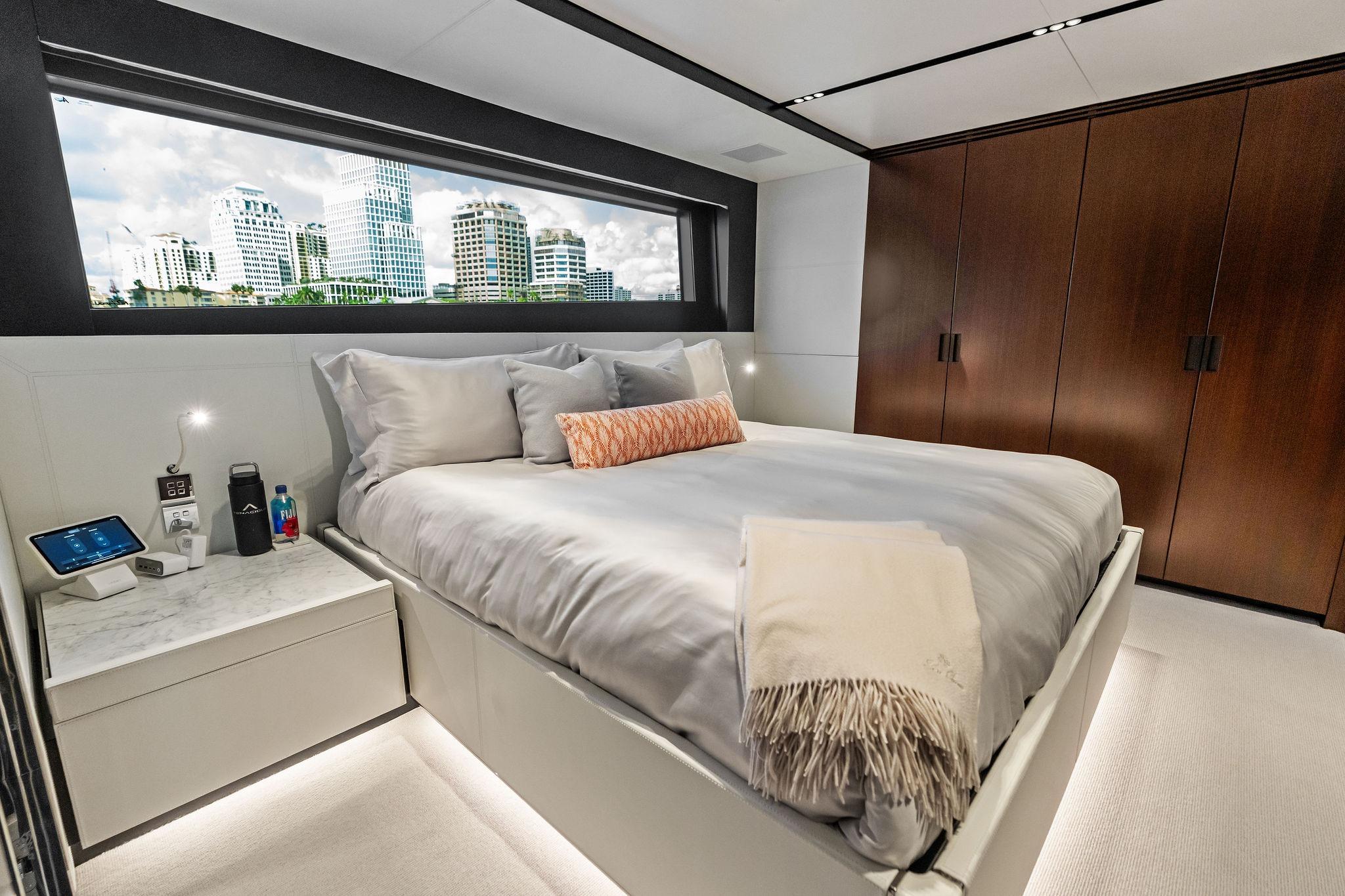 OWNER’S SUITE: A substantial full-beam owner’s suite, with a private lounge and a study area. Extensive glazed surfaces highlight the abundance of natural light offering magnificent panoramic views.
