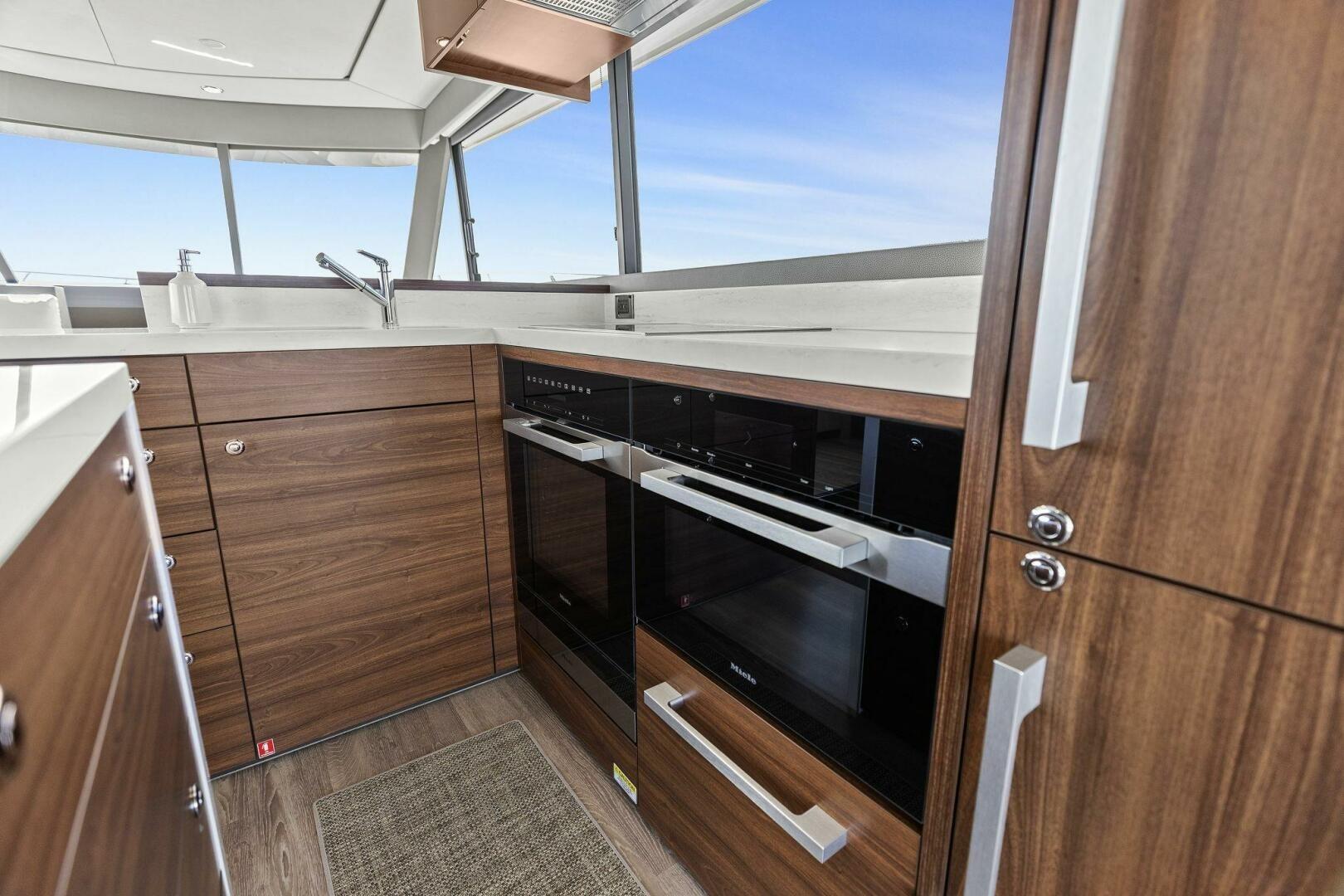 - Galley Upgrades: Miele package with two-door fridge, convection microwave, range hood, 4-burner cooktop, and wine fridge