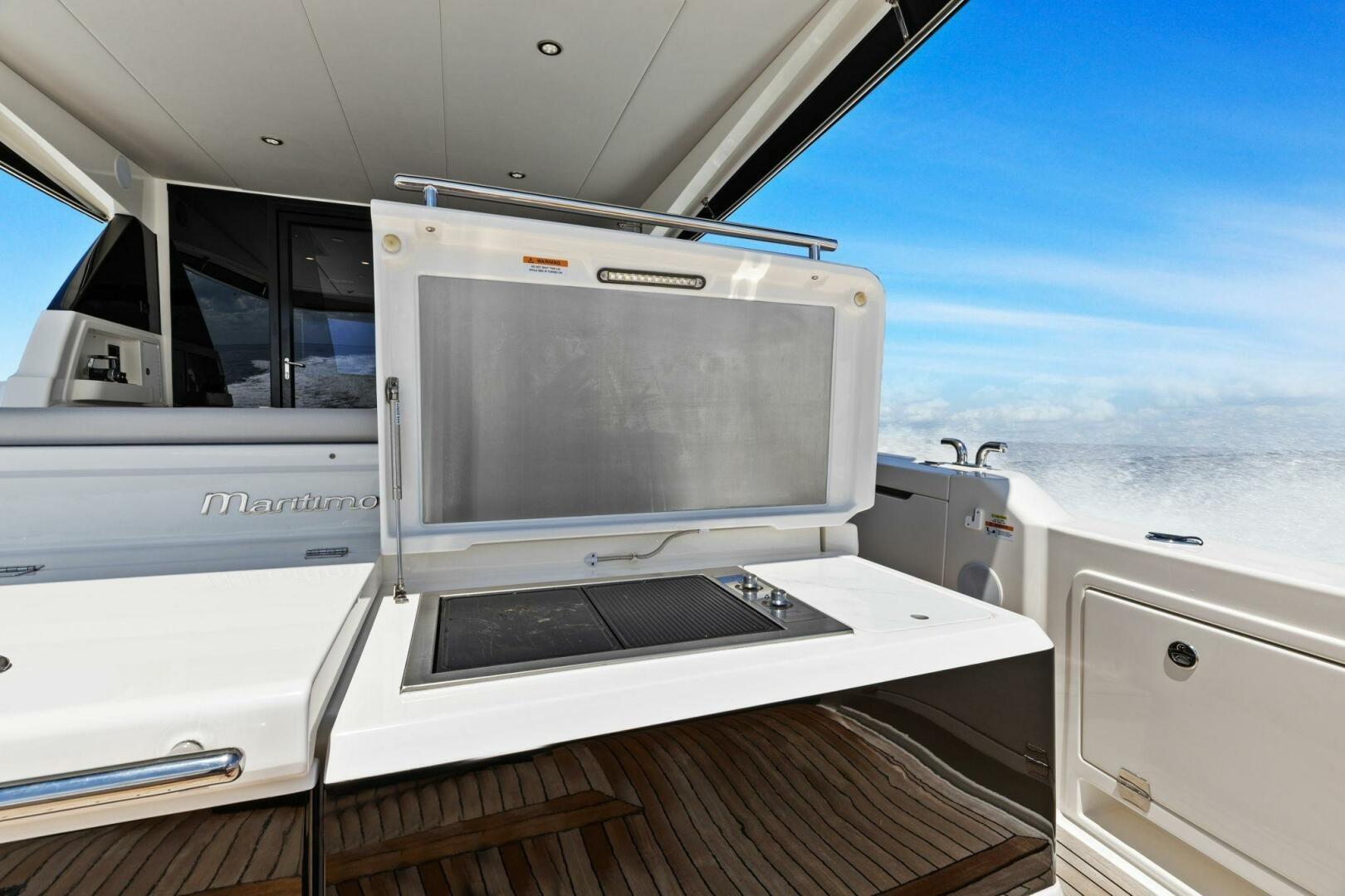 - Windows & Doors: Maritimo panoramic sliding windows (salon & flybridge), bi-fold doors to galley