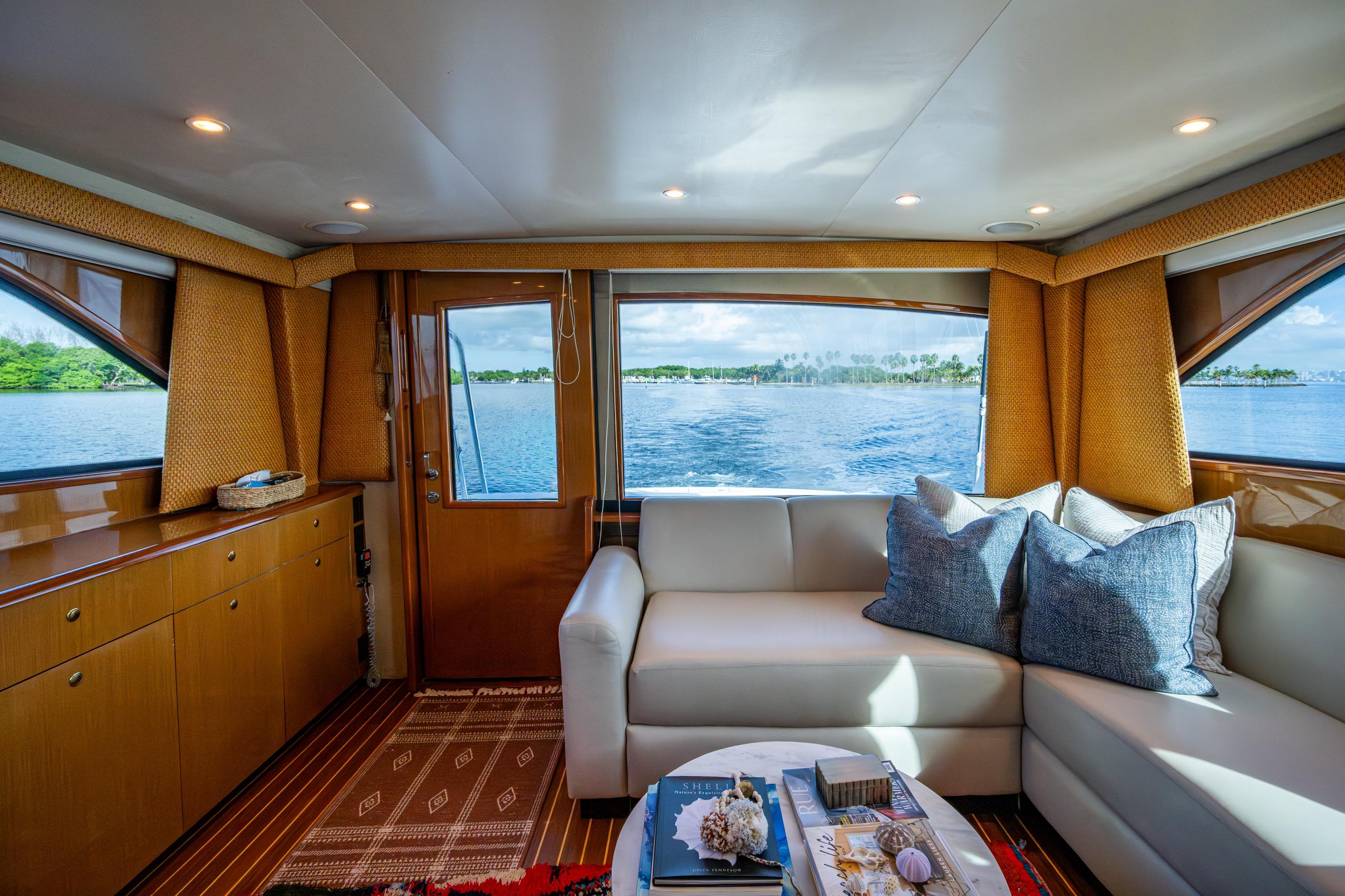 Entering the salon through the fiberglass sliding door ,the ultra-leather couches in the salon and dinette are as comfortable as they are attractive and practical. The high gloss teak cabinetry and rich looking Matterhorn Corian countertops make for a very attractive interior.