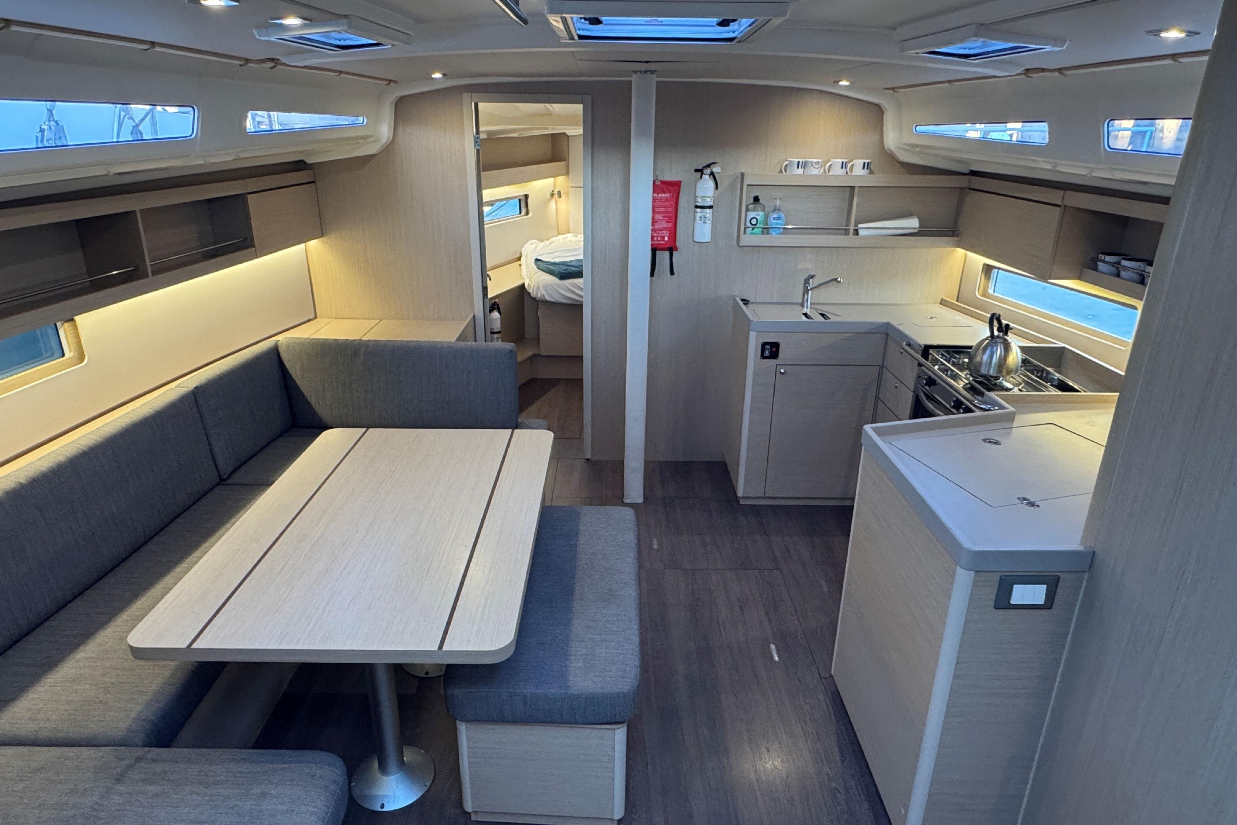 With a light oak ambiance, the styling of the interior by Italian designers Nauta, is remarkably bright and excels in the skillful arrangement of the living spaces. She is available with three cabins and a C-shaped galley on the starboard, offering lots of storage and a spacious worktop. On the port side, there is a large saloon with a table and a removable bench, and a chart table at the foot of the companionway provides ample working space. Everything is modular, so that everyone can live the way they want and enjoy sailing wherever the wind takes them.