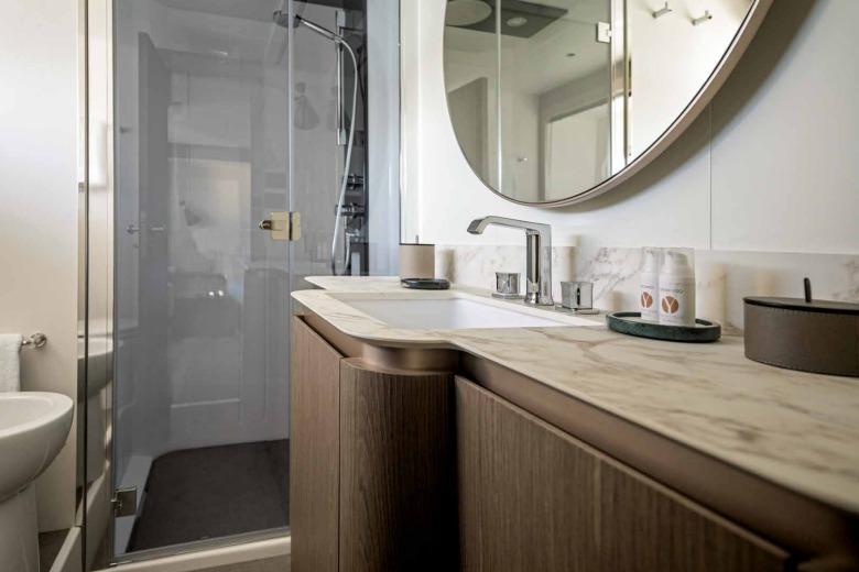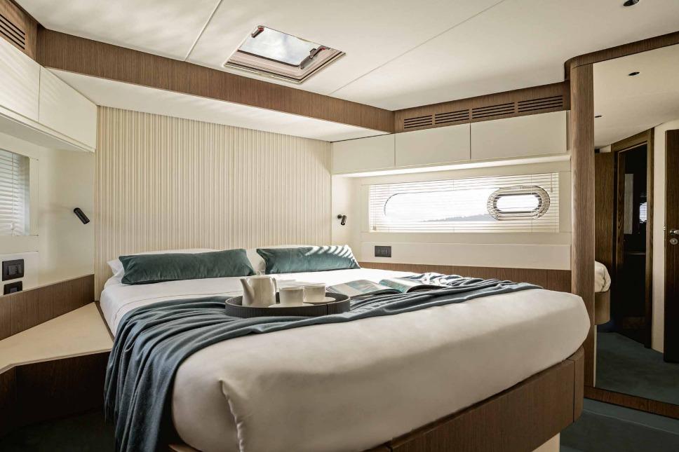 Conceived for blissfully reserved sea voyages, the Magellano 66 complements its crossover character through the possibility of a privacy-oriented onboard design. The large, single-level main deck aptly appeals to diverse lifestyles, offering either a unique open space solution with semi-secluded flows to lightly separate guests from crew or the Navetta layout for a completely independent galley and wheelhouse. The Magellano 66 perfectly embodies the DNA of the Magellano Collection with elegant lines and a powerful hull, whose bulwarks that rise to protect the side walkways. Below, elongated hullside windows recall nautical tradition with a rounded shape, and, above, wooden louvers positively punctuate the superstructure’s aft end.