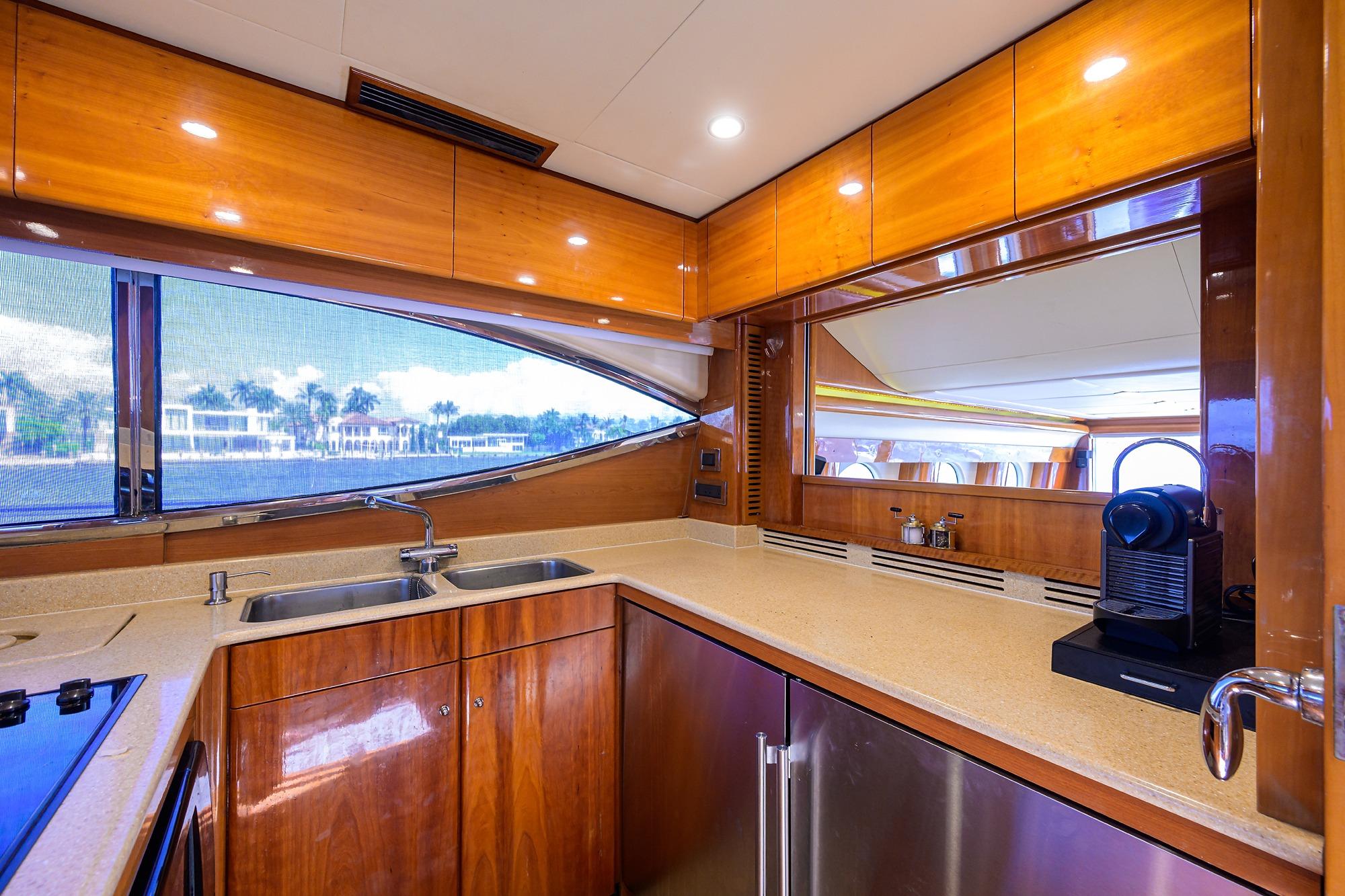 Main DeckForward is the command bridge which is fitted with a full-console helm station forward to starboard followed by a watertight door outboard and a bulkhead with an electrically raised and lowered partition, the U-shaped galley, and a bulkhead fitted with a second electrically raised and lowered partition. A raised dinette is opposite the helm to port. Two steps down is the salon which is fitted with an entertainment console to port followed by locker stowage containing a large flat-screen TV which can be raised and lowered electrically. A U-shaped settee is to starboard with stowage under. A sliding glass door and fixed glass partition aft provide access to the cockpit. The cockpit is fitted with locker stowage outboard of the main cabin door to port and starboard, a hatch in the sole forward to starboard accessing the equipment/mechanical spaces, and a larger hatch in the cockpit sole aft on centerline providing additional access to the mechanical spaces. Access to the engine room is by means of a watertight door forward on centerline in the mechanical spaces.