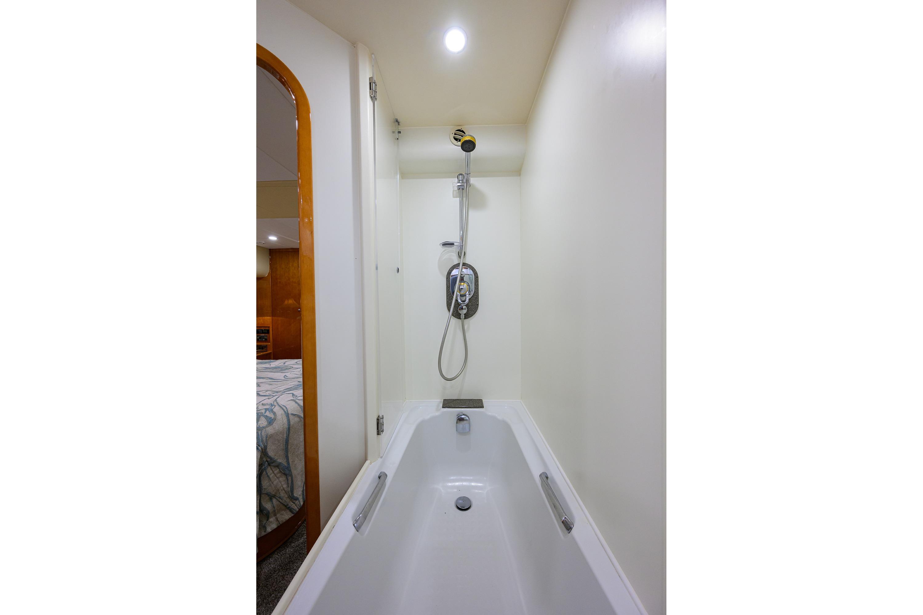 The master stateroom is located amidships and features an island queen bed with abundant storage. The master stateroom head features a split head arrangement with the head on one side of the cabin and the separate shower stall on the other. Master bath features a jetted tub for the ultimate comfort. Moving forward and located to port is a guest room with both upper and lower berths. Moving slightly forward and to starboard is another guest room with two twin beds and a private head. Ideally designed, the shower stall is a circular design which maximizes the allocated space and looks very contemporary. Moving forward again one enters the VIP stateroom. It also features an island queen berth and private head.