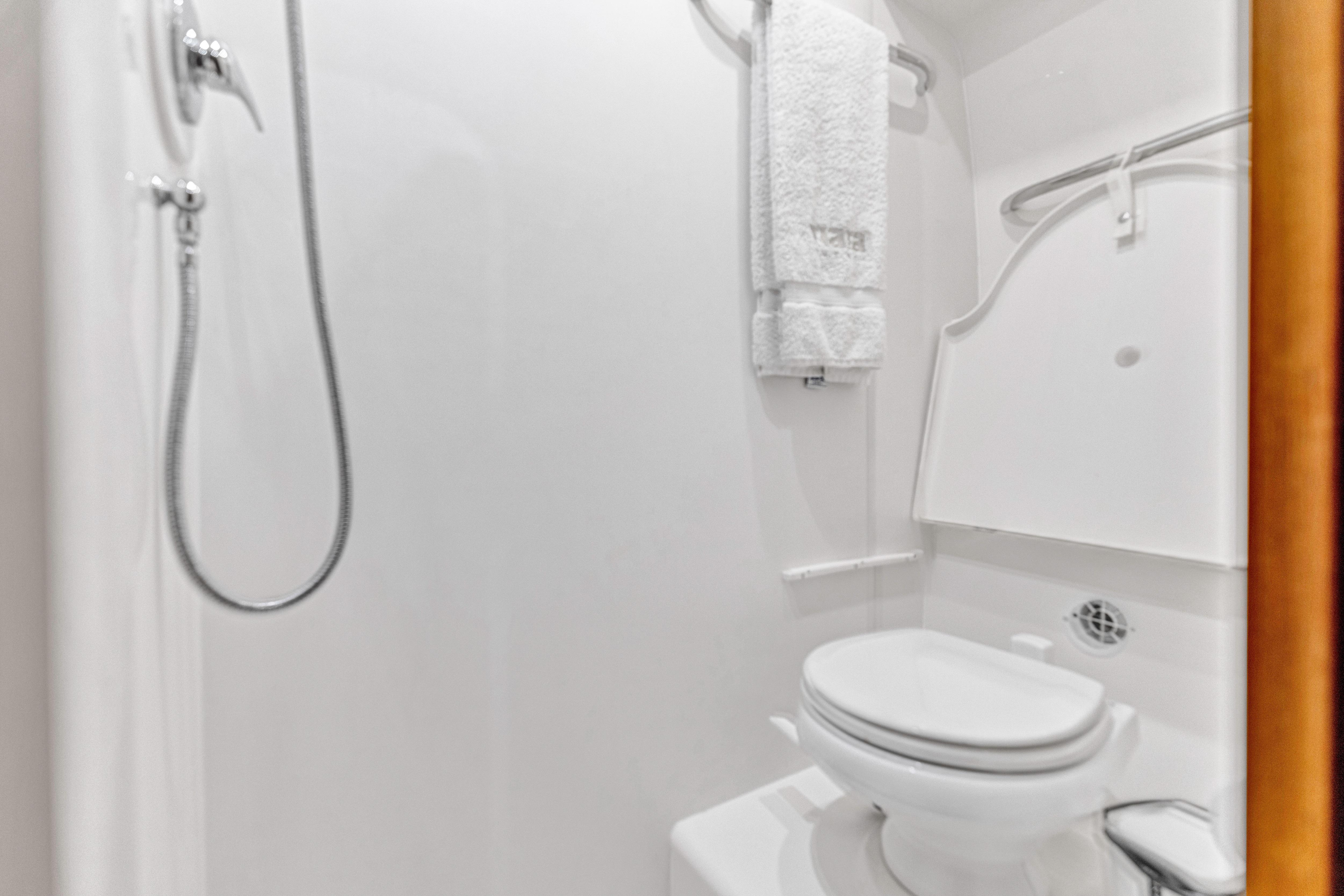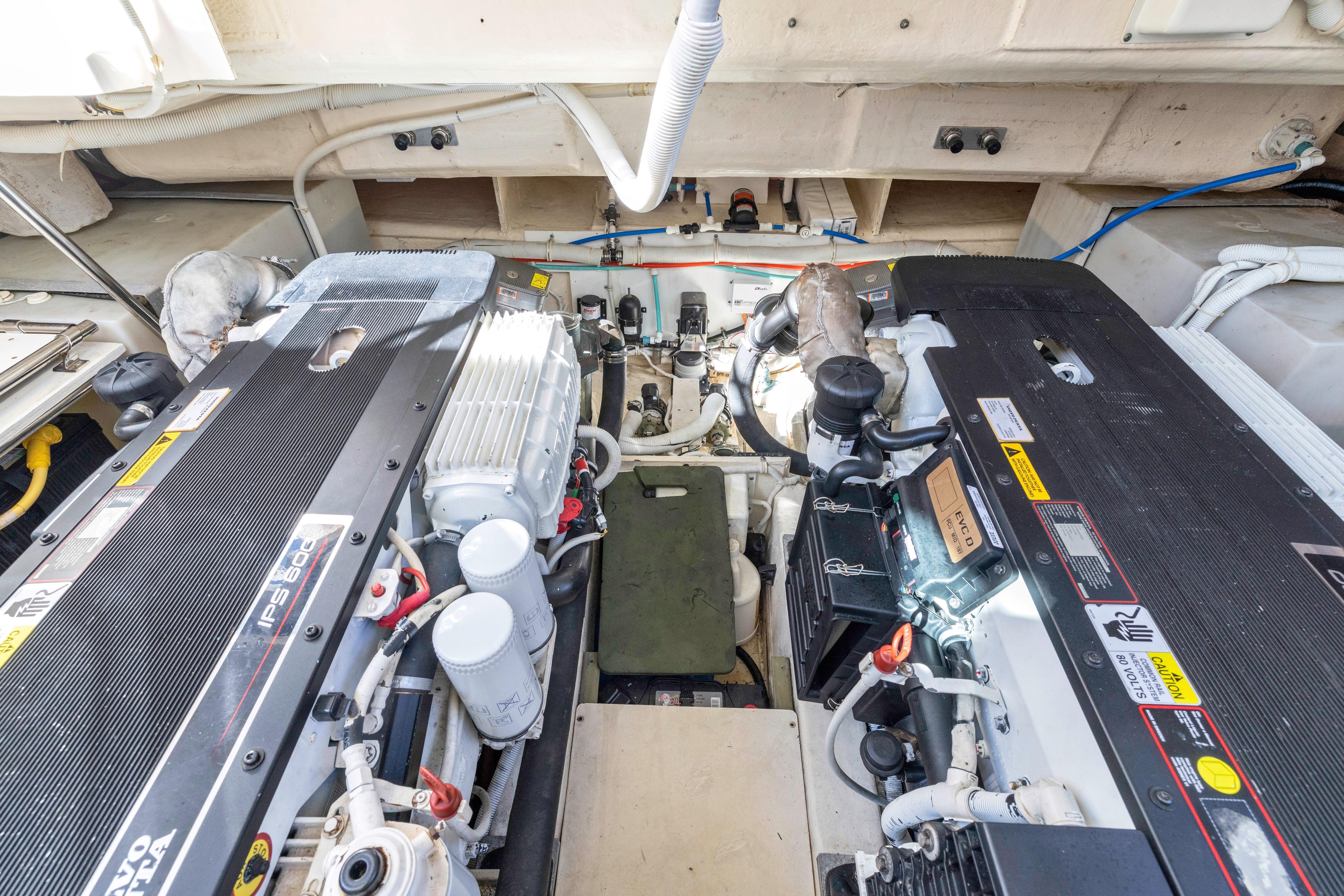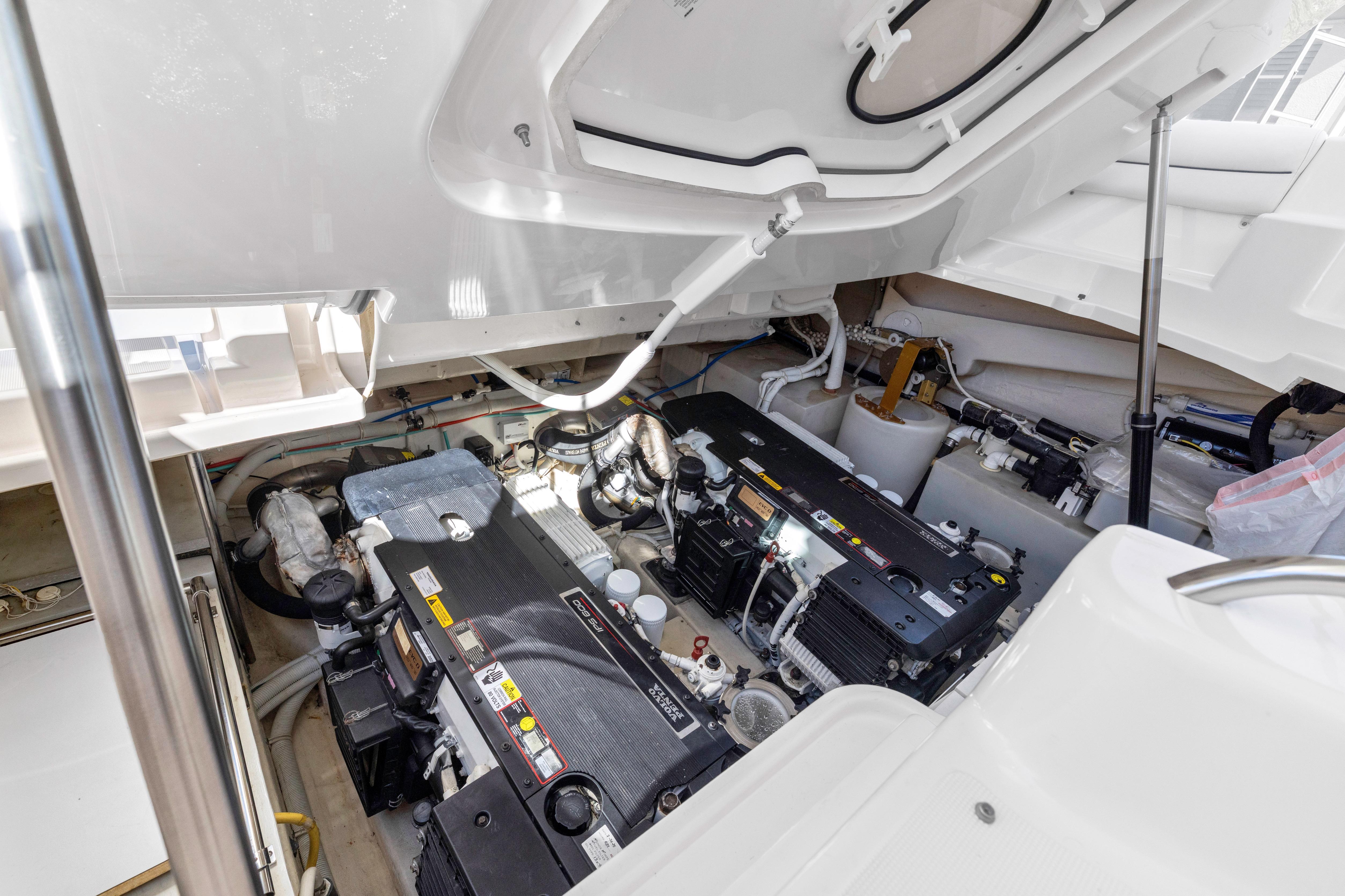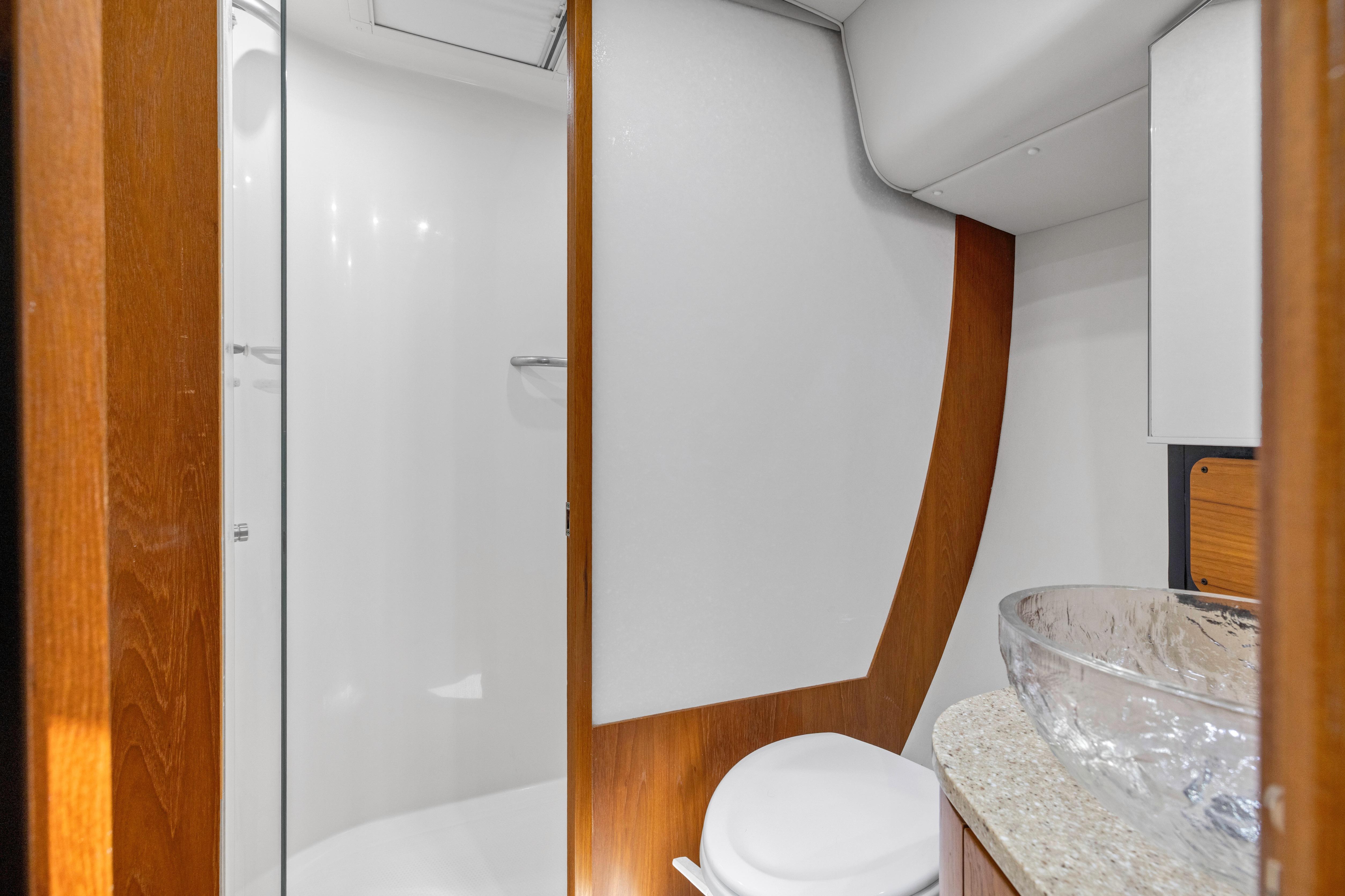 The 4300 Sovran is widely appreciated for its effortlessly social deck and cockpit layout, and this vessel captures that perfectly. The expansive cockpit seating wraps guests into the conversation, with a convertible table that transitions from morning coffee to cocktail hour with ease. The hardtop with full windshield and venting provides excellent protection from sun and weather, and the single-level flow from helm to cockpit keeps everyone connected while underway or at anchor. The upgraded Fusion stereo fills the space with clean, rich audio, making this an ideal platform for sunset cruises, long weekend gatherings, or simply relaxing with family. The wide swim platform and tender roller system further extend your living space, offering effortless water access and convenient tender or jet ski launch capability when exploring coves and beaches.
