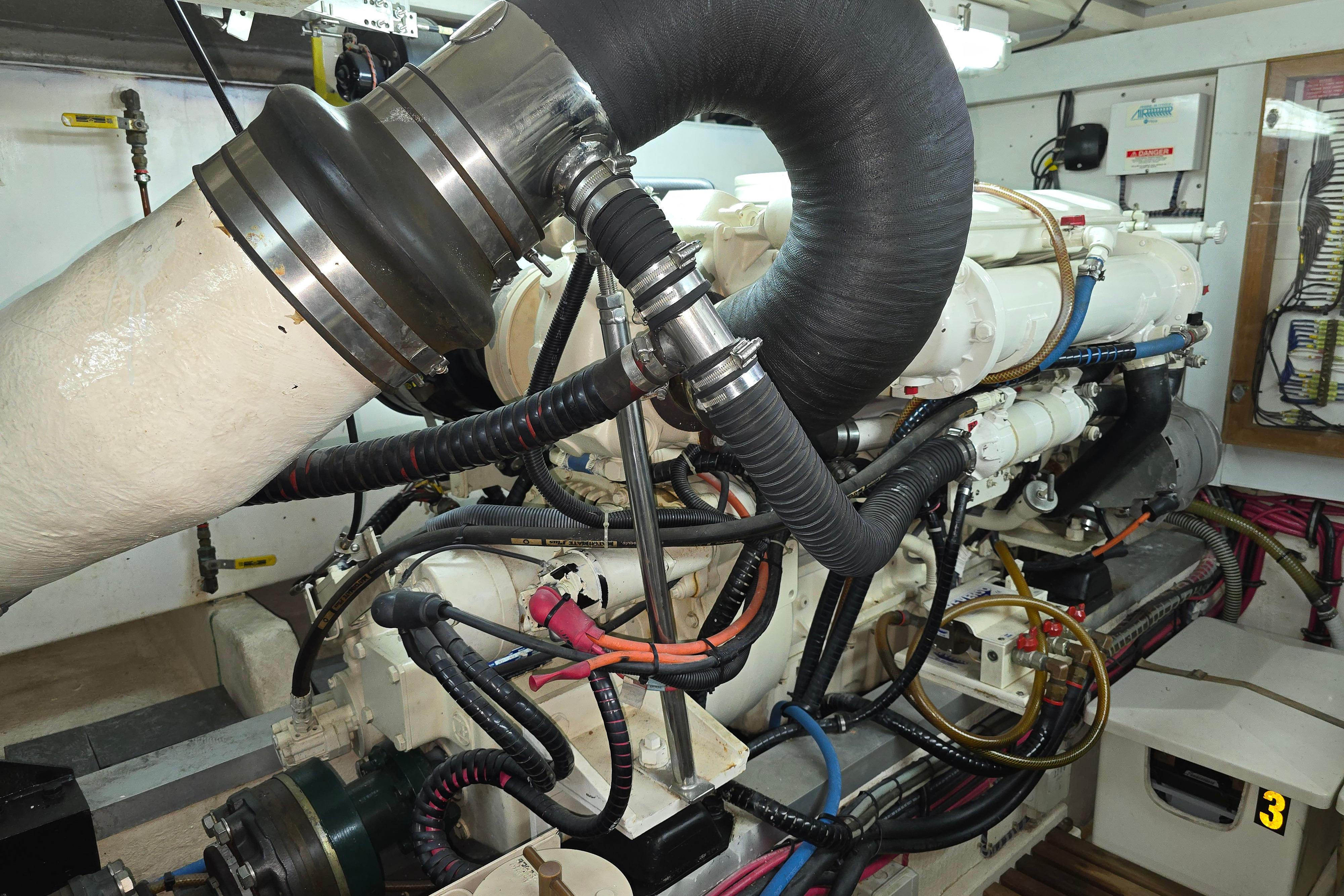 "Halcyon" is powered by twin 450-horsepower Caterpillar 3126B engines with Twin Disc straight-drive transmissions. The shafts feature Tides Marine dripless seals and Aquadrive thrust bearings, which distribute shaft forces into the hull structure rather than the engine mounts, ensuring smooth and quiet operation.