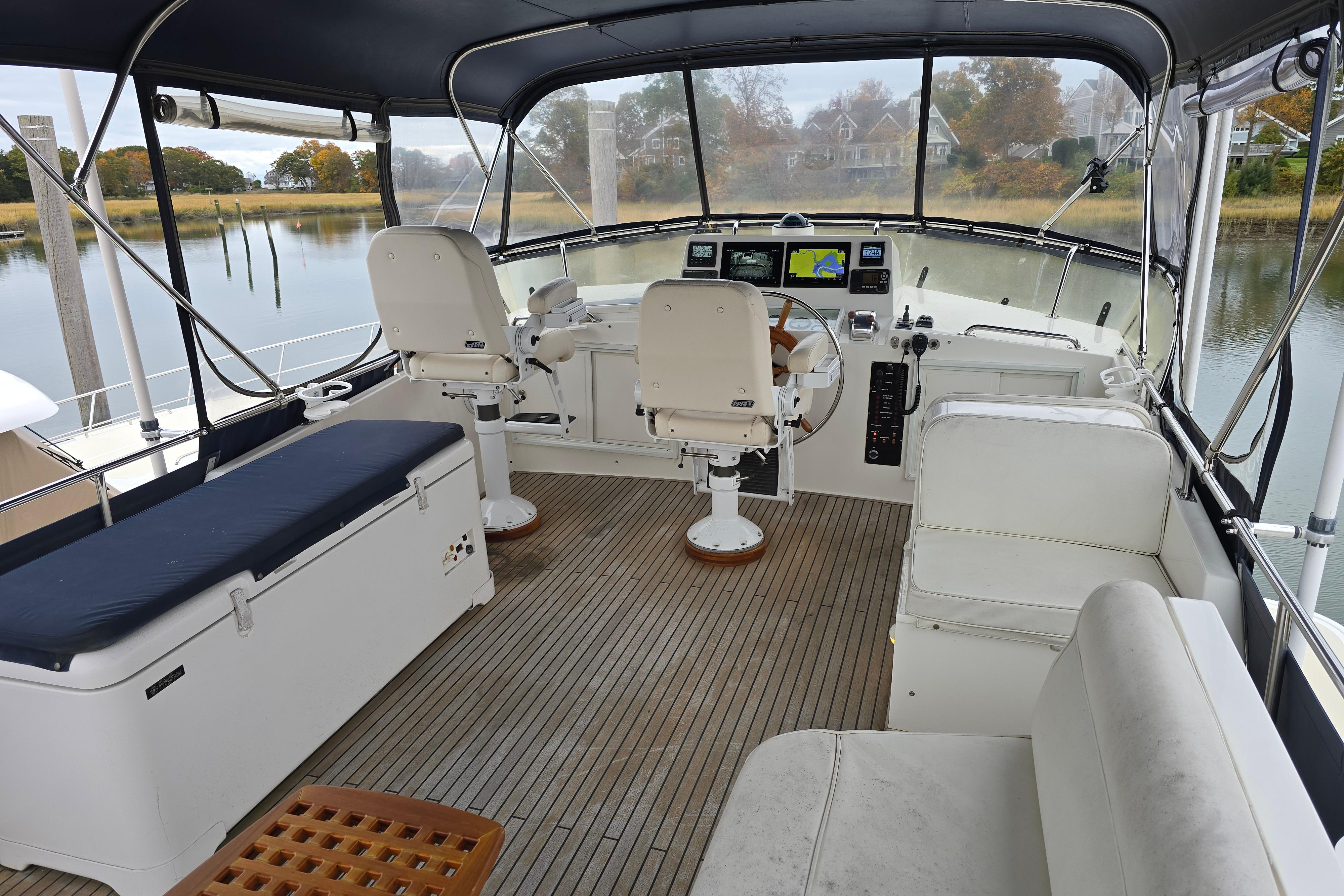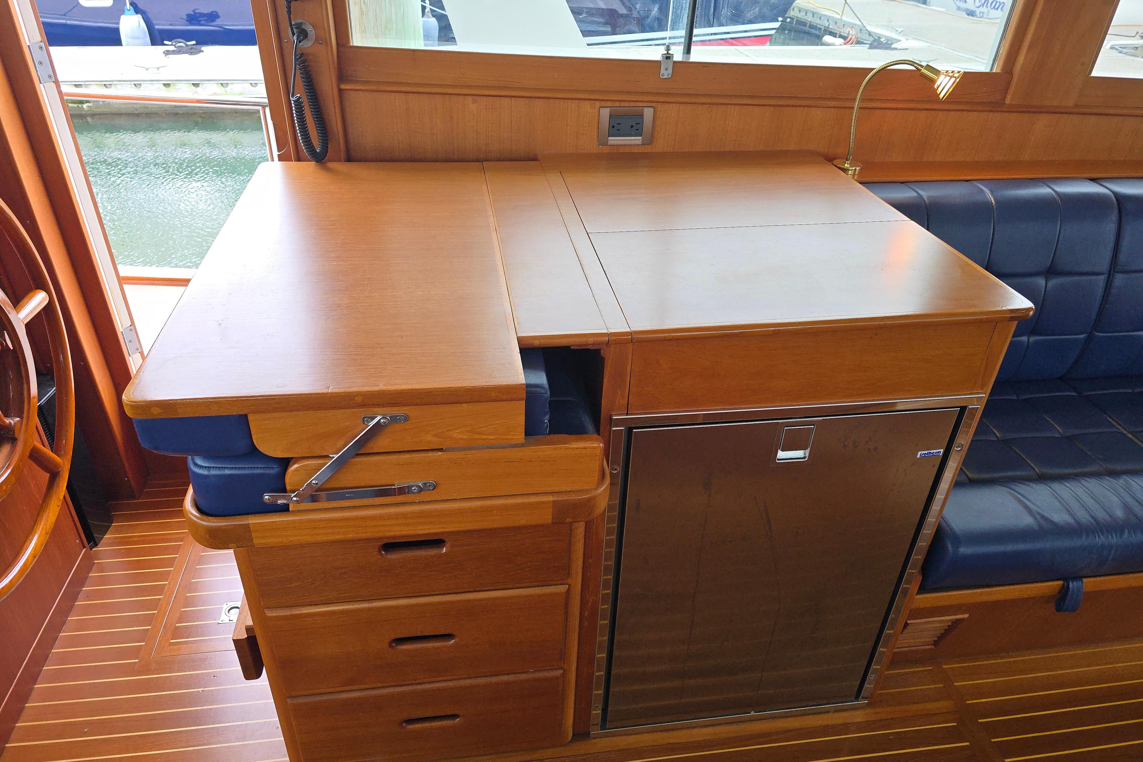 Halcyon has the desirable bench seating arrangement in the after (starboard) salon vs the traditional swivel chairs. The dinette table is aft to port with L-Shaped Settee. Forward to starboard is the lower helm, with a double bench helm seat which can be converted into a countertop /bar area. The galley is forward to port.