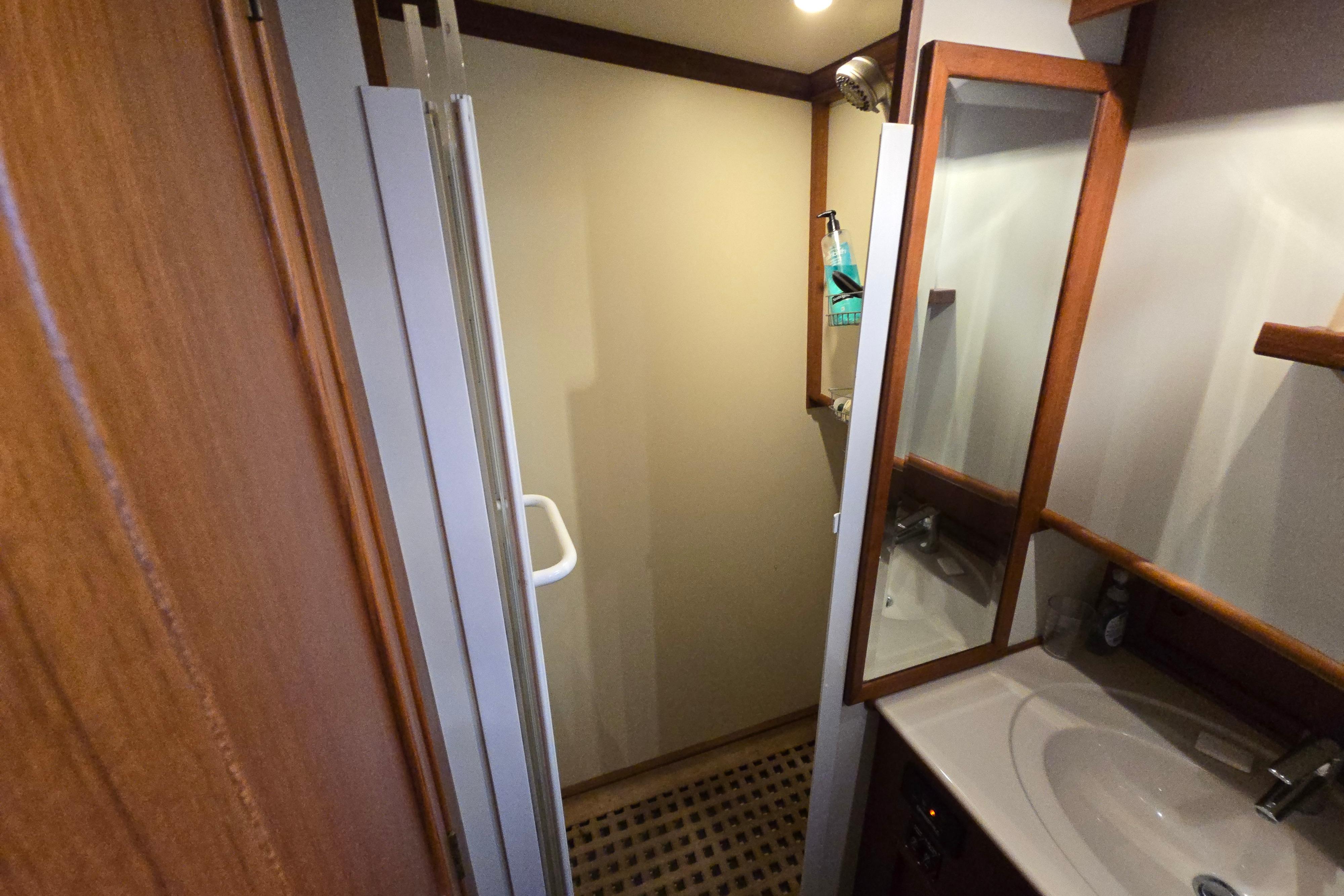 Down a few steps between the helm and galley is the forward cabin area, which includes a spacious island queen stateroom forward and a guest cabin with twin berths. There are two full-sized heads, each with a separate shower stall.