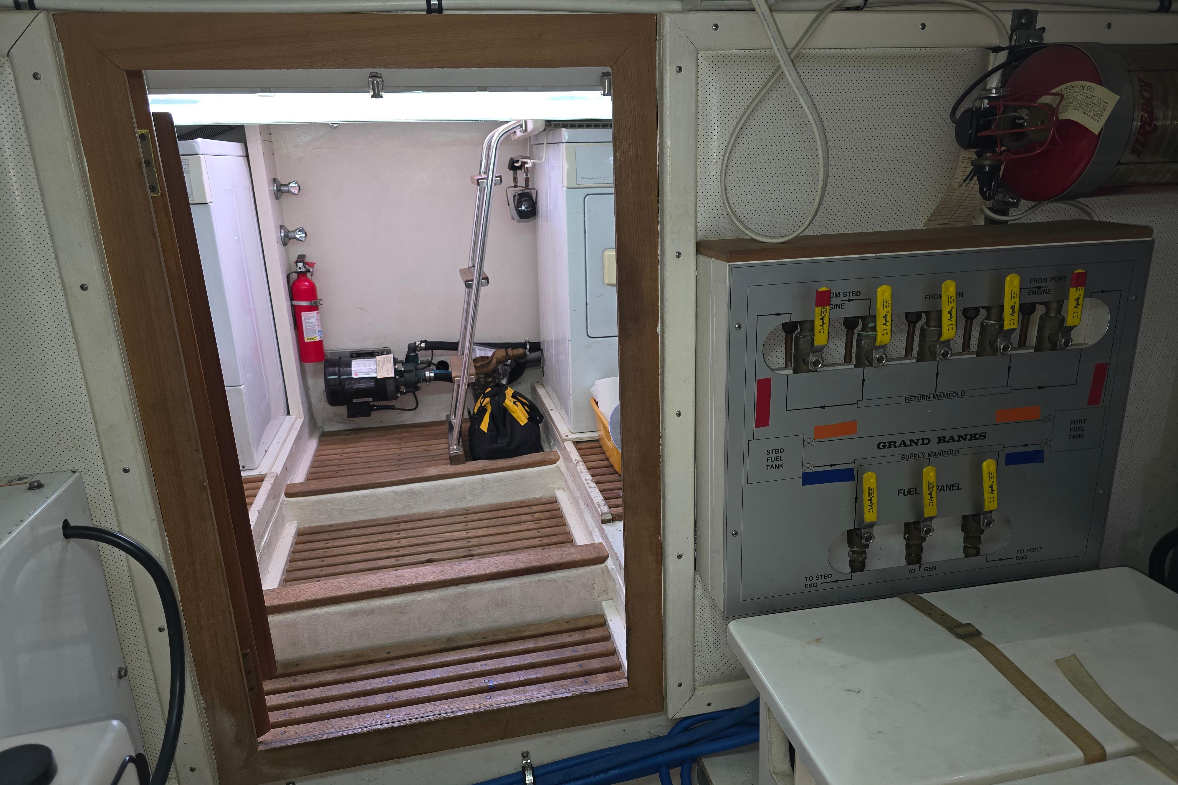 Aft of the engine compartment is a large utility room with a washer and dryer, air conditioning compressors, and the vessel’s batteries. Engine access is available through a sealed bulkhead door from the utility room or via a hatch in the salon sole.