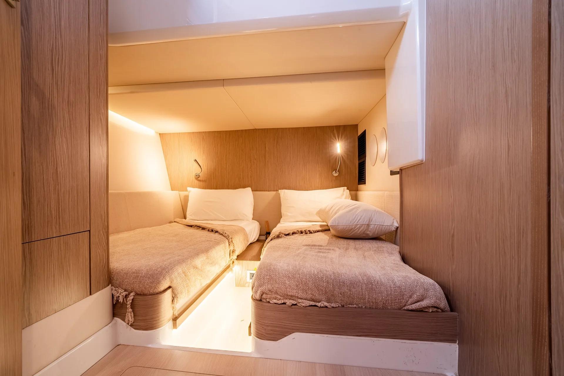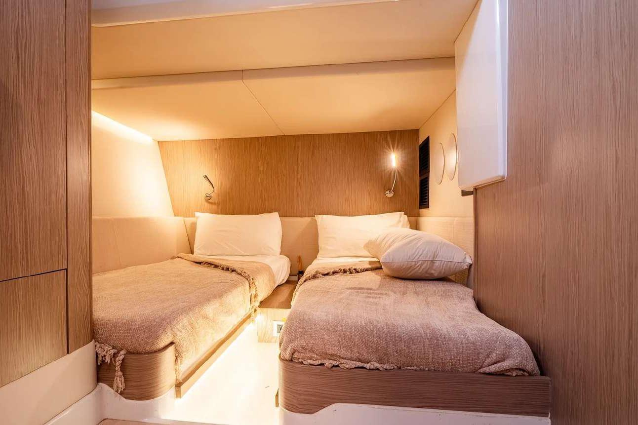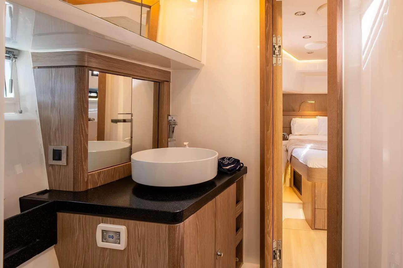 - Guest cabin: Double or twin berth configuration (depending on layout) with access to the second head.