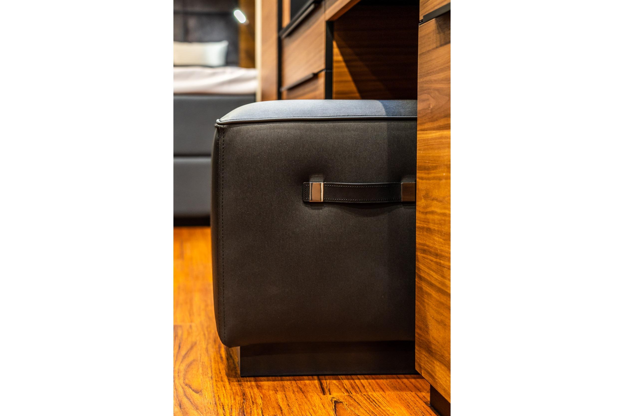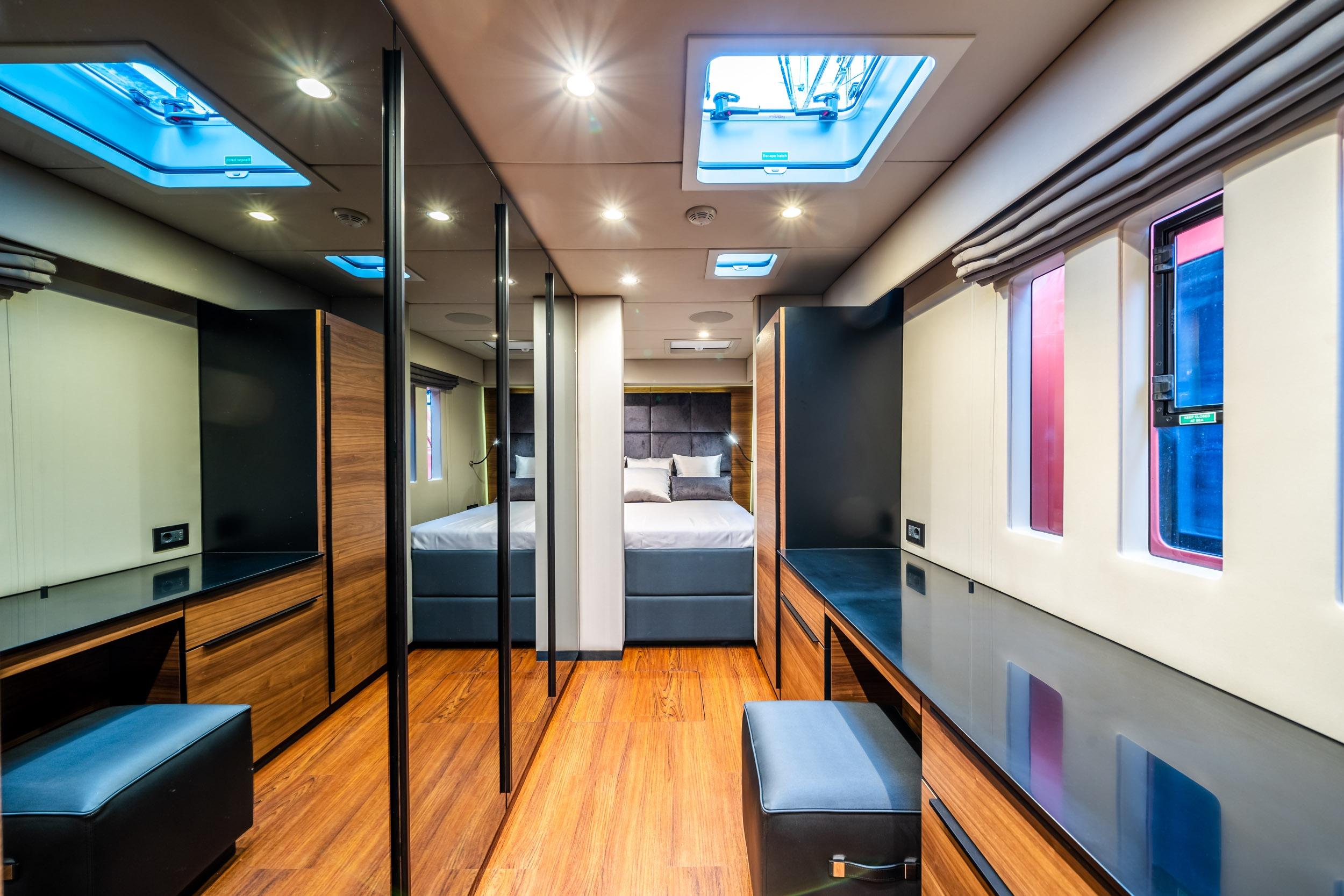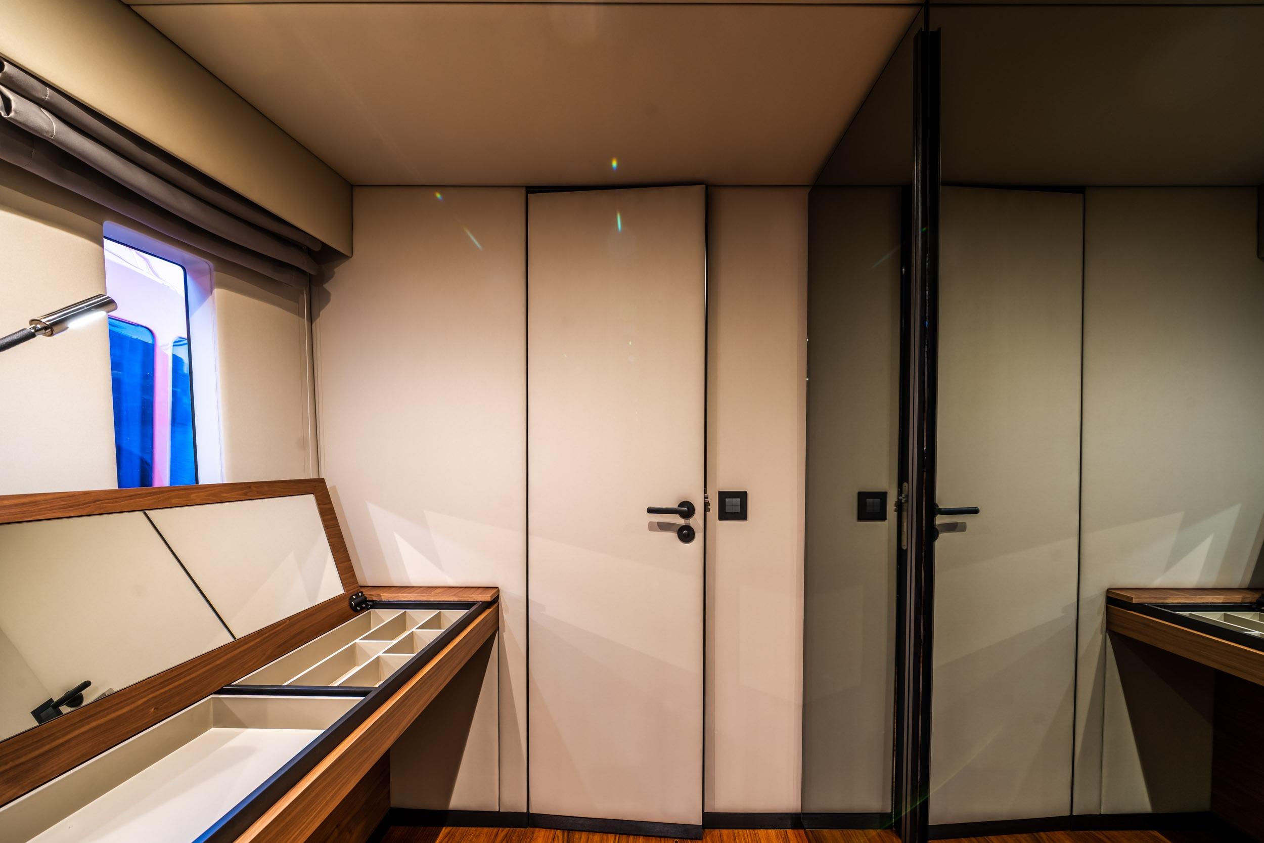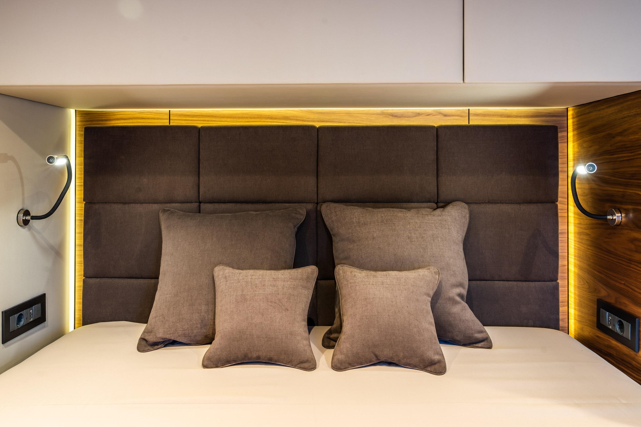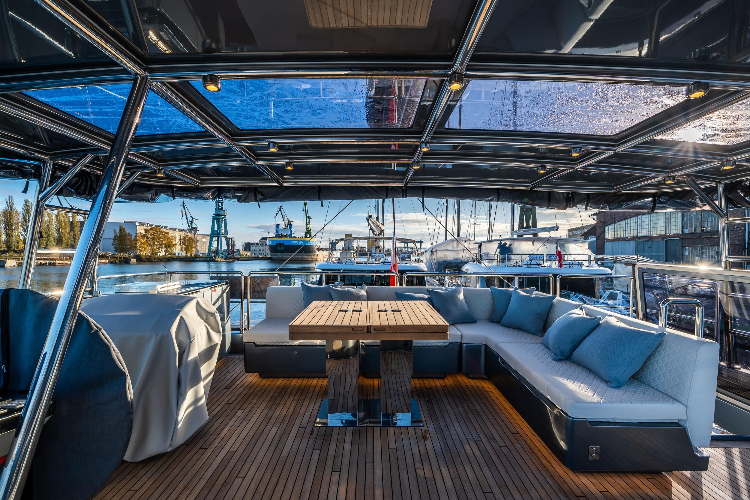 Her design seamlessly merges timeless elegance with modern functionality, featuring generous teak finishes and high bulwarks, along with sleek, classic lines. The spacious main salon opens seamlessly to a welcoming bow terrace and an extended cockpit equipped with a hydraulic aft platform, creating the perfect flow between indoor and outdoor living.