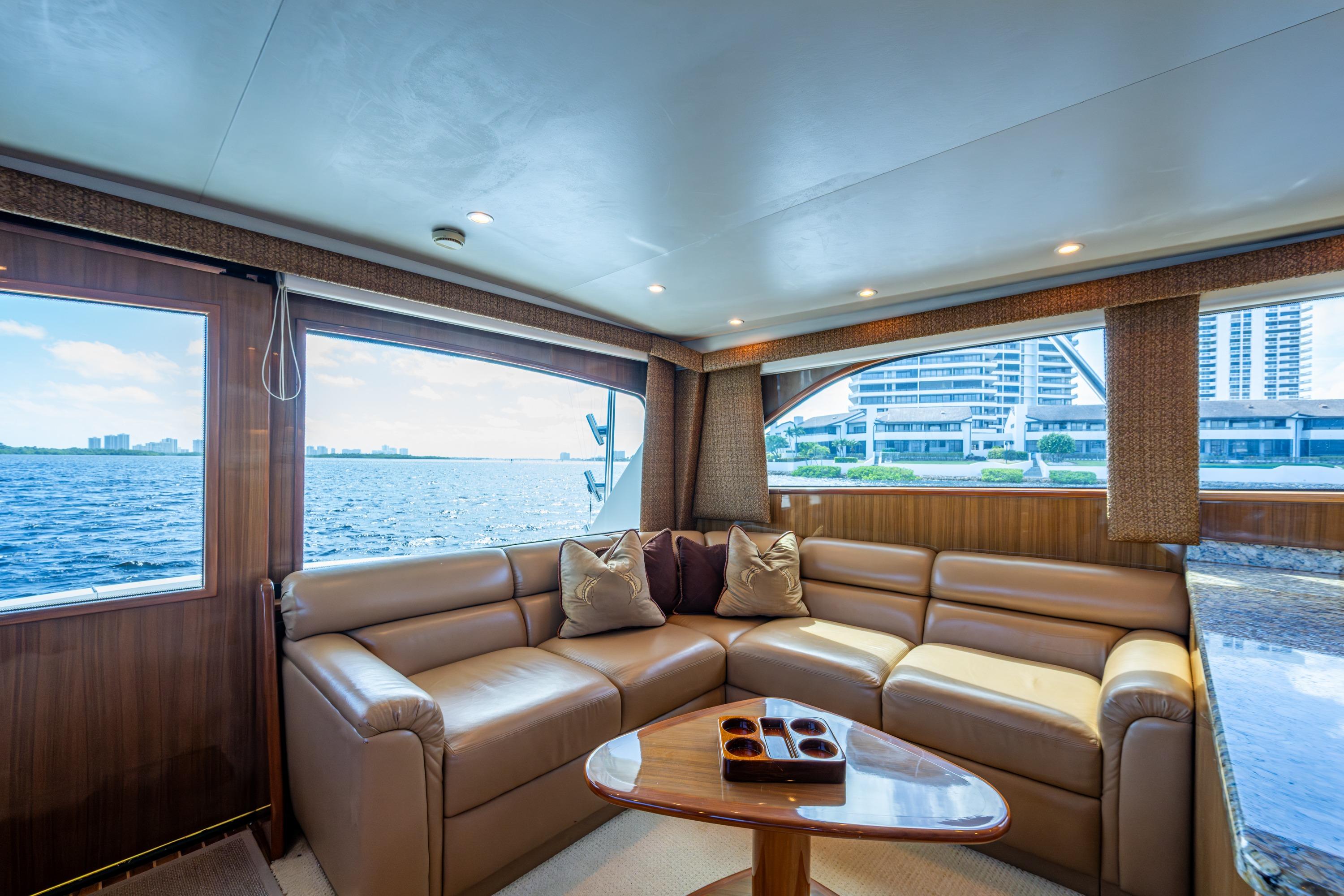 Her cockpit is outfitted with mezzanine seating, providing the ideal vantage point to relax or watch the action in the cockpit. Inside, you'll find the classic Viking interior - rich teak cabinetry, a spacious salon with open galley, and a three stateroom two head layout that offers plenty of comfort for extended trips.