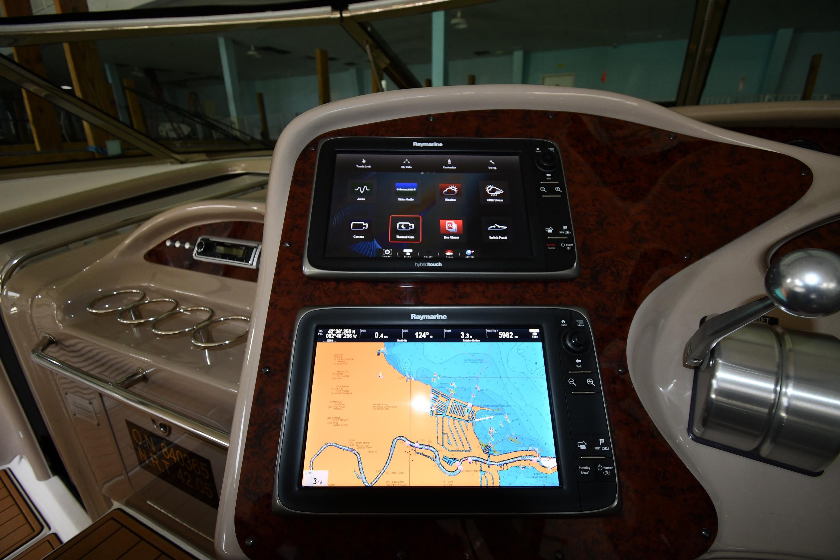Freshwater / Great Lakes boat since new this vessel features Twin Caterpillar 3196 660-hp Diesel Engine's with 1385 original hours. Notable features include but are not limited to the following: Air-Conditioning & Heat (4-Units - Includes Cockpit AC/Heat), (2) Heads (Vacuflush) w/Vanity/Sink/Stall-Shower, Westerbeke 12.5kw Diesel Generator (2314-hrs.), Cherry (Vitra-Core) Interior Package, Satellite Television System, Windlass Anchor w/Forward Pedal-Controls (w/Freshwater Washdown), Bow-Thruster, Hydraulic Swim Platform, NEWER Raymarine Electronics Package (VHF Marine Radio, Autopilot, Dual Raymarine Hybrid-Touch - (1) C125 / (1) E125 Color Radar/GPS/Chartplotter), Premium Cockpit Sound System wJL-Audio Speakers / Subwoofers - Note (4) Tower-Speaekrs; 2-on Hardtop and 2-Underneath Hardtop), Cockpit Wet Bar w/Sink/Ice-Maker/Refrigerator, NEW Custom Canvas Enclosure, Sea-Dek Throughout Cockpit / Swim-Platform, Bose Surround Sound, and MUCH more!